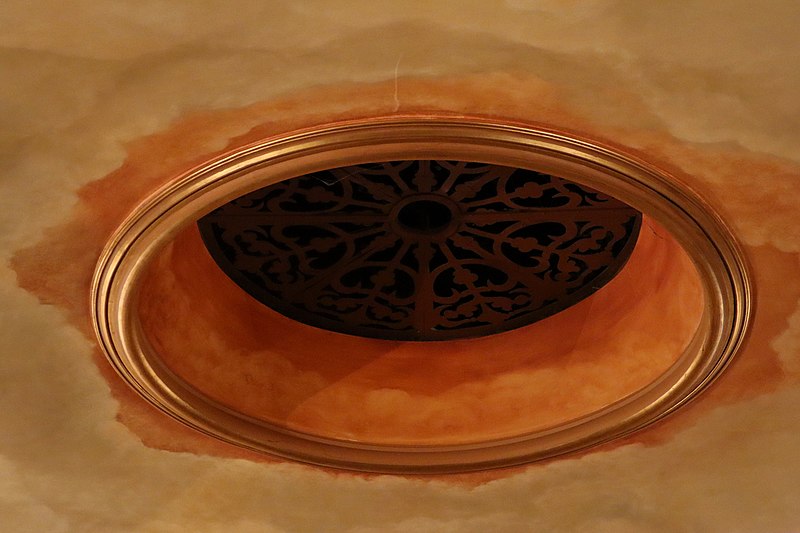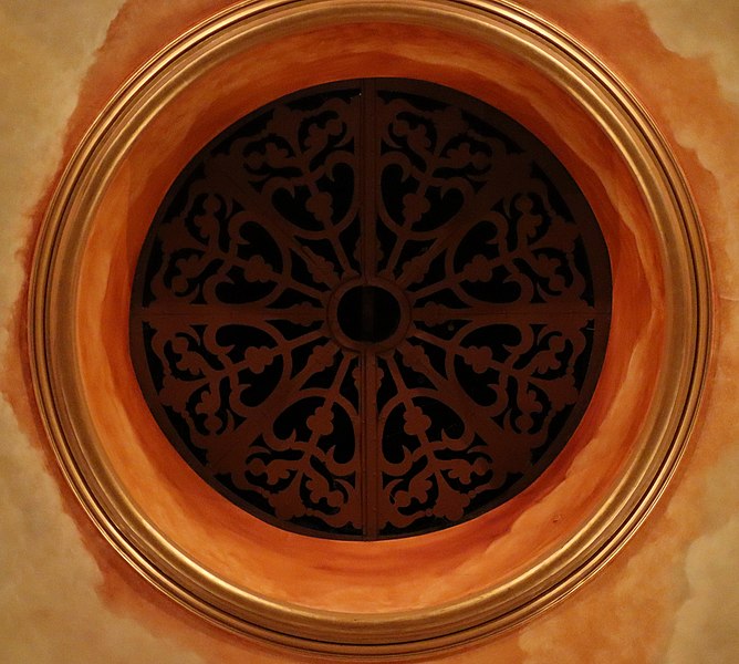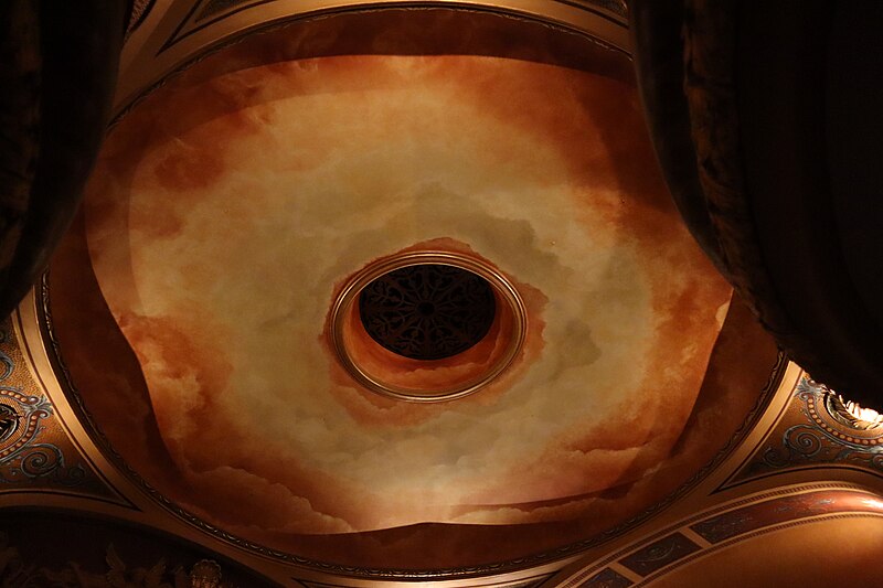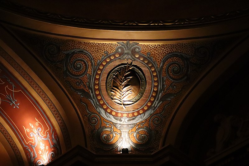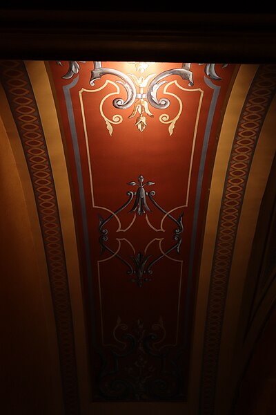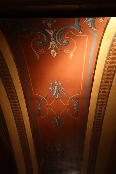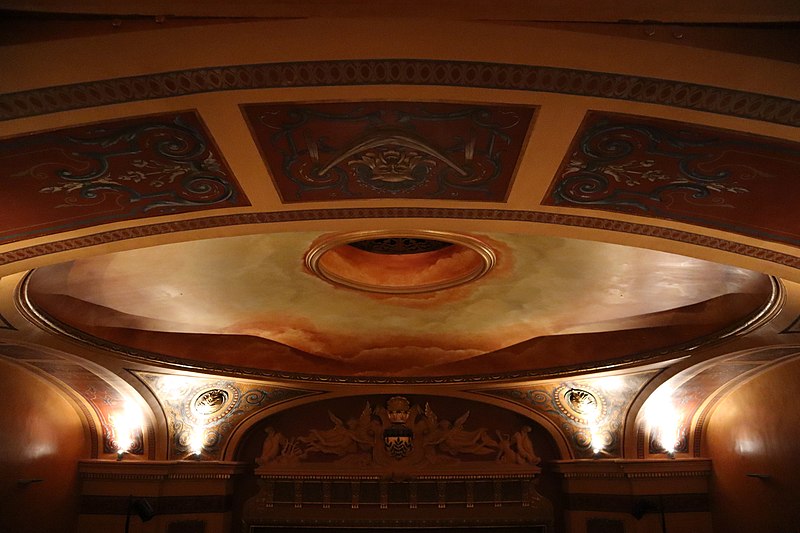 L'intérieur répond à un parti pris rationaliste : Laloy a conçu une salle fonctionnelle, centrée sur un axe médian derrière la travée centrale, avec un vestibule surmonté du foyer donnant directement sur le parterre et desservi par deux escaliers latéraux menant aux étages. La salle combine plan "à la française" et élévation "à l'italienne" organisée en plusieurs niveaux de galeries, de sorte que, sans adopter la forme en fer à cheval, le jeu des courbes des balcons anime l'espace inscrit dans un carré aux pans coupés. Le décor, inspiré des théâtres classiques, privilégie des tons sombres et riches — bleu foncé, rouge grenat et or — et reste majoritairement peint, avec quelques éléments sculptés tels que feuilles d'acanthe, lyres et pendentifs de coupole. La coupole métallique, portée par quatre piliers d'angle, est ornée d'un trompe‑l'œil et de pendentifs décoratifs ; le cadre de scène concentre les sculptures principales, dont deux anges portant les armes de Fougères et des trophées d'instruments de musique. L'espace scénique, peu profond mais légèrement incliné, offre une visibilité adaptée au public, et les loges des artistes se trouvent au sous‑sol.