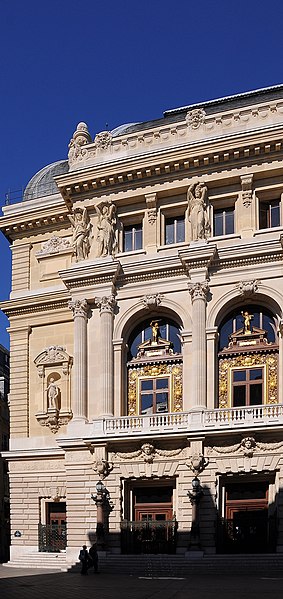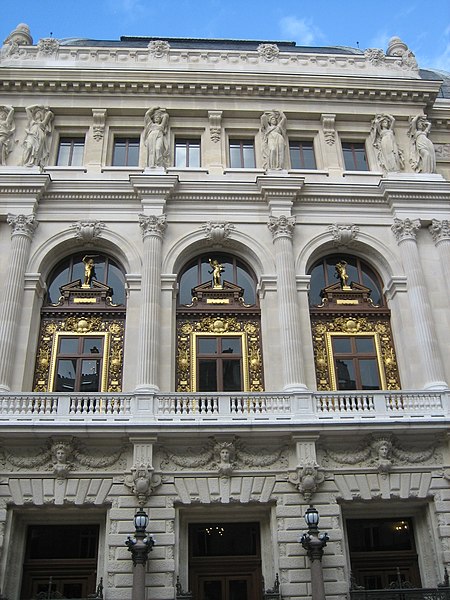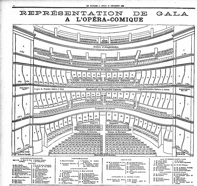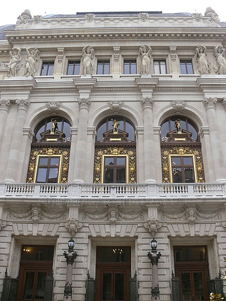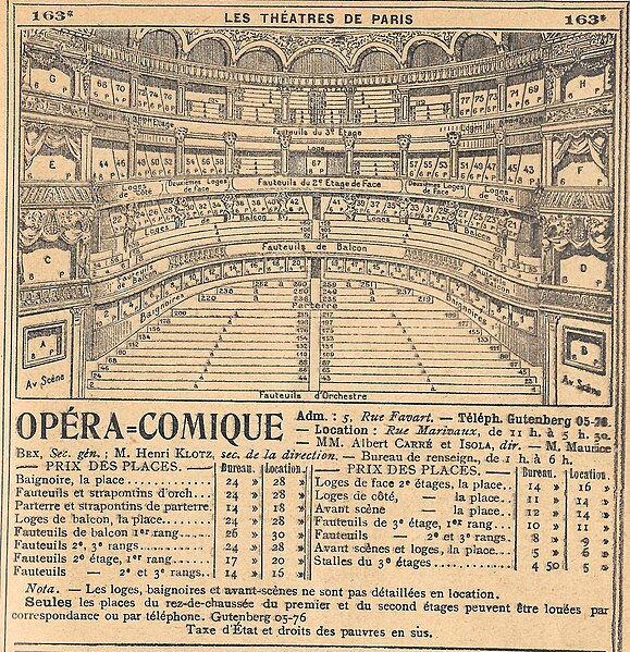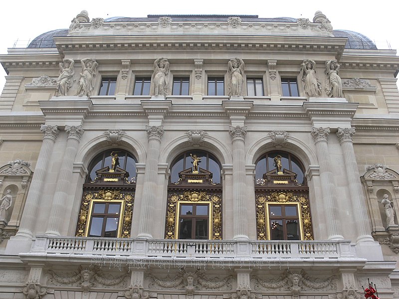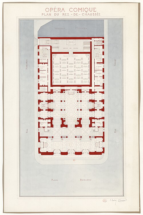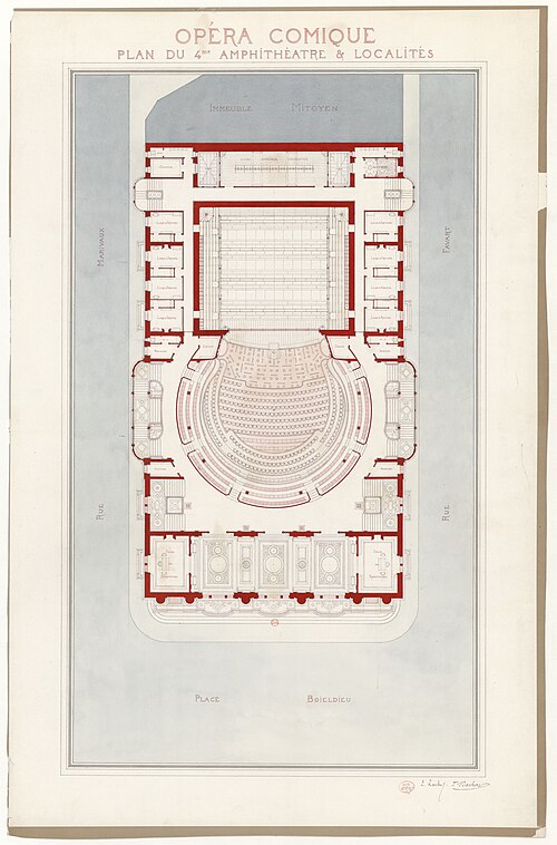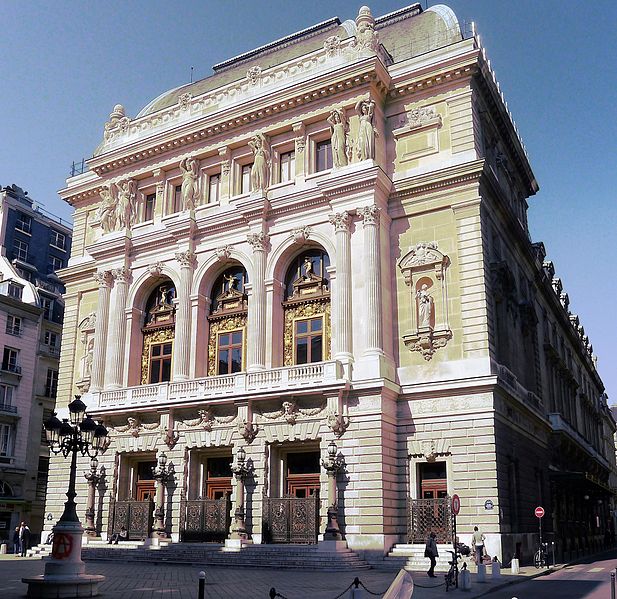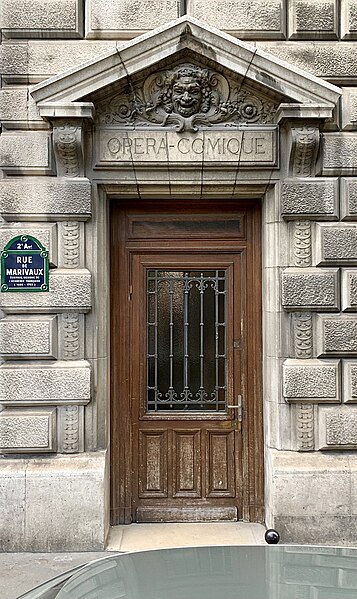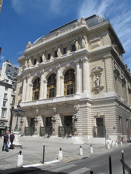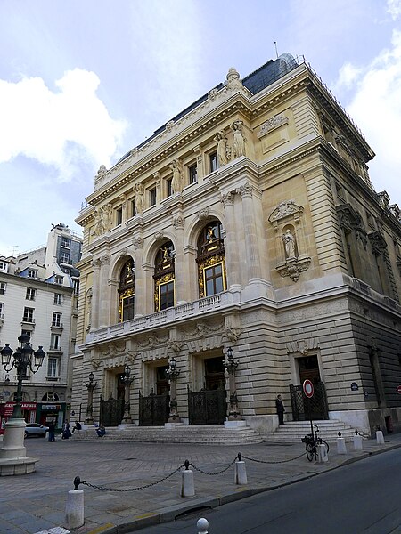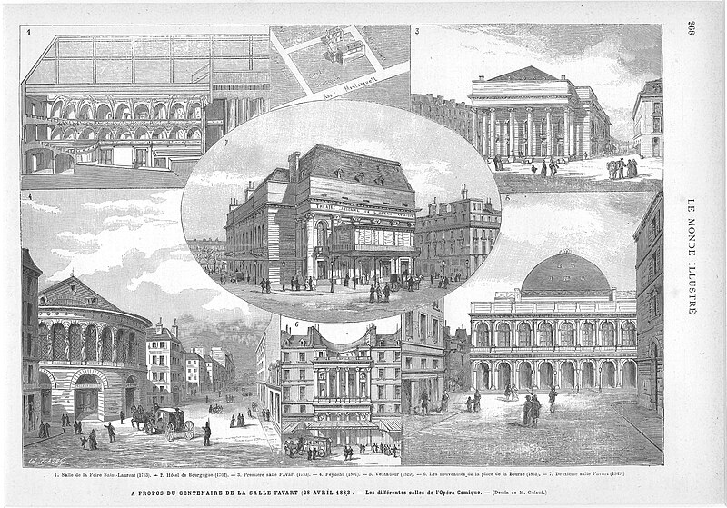 Le théâtre national de l'Opéra-Comique, dit salle Favart, est une salle de spectacles située place Boieldieu dans le 2e arrondissement de Paris et possède le statut d'établissement public à caractère industriel et commercial. L'Opéra-Comique trouve son origine dans des troupes de foire et a été fondé en 1714 ; le décret de la même année autorisa la troupe à disposer d'un théâtre à condition d'intercaler des dialogues parlés, ce qui définit depuis l'opéra-comique. La troupe a été accueillie de façon permanente à la salle Favart entre 1783 et 1801, puis de 1840 à 1971. La première salle Favart, conçue par Jean‑François Heurtier, fut inaugurée en 1783 ; elle fut détruite par un incendie en janvier 1838. Une deuxième salle, reconstruite par Théodore Charpentier et dirigée par François‑Louis Crosnier, ouvrit en 1840 mais fut elle aussi détruite par un incendie en mai 1887. La salle actuelle, élevée par Louis Bernier, fut inaugurée en 1898 sur le même emplacement et conserve depuis la vocation lyrique du lieu. L'architecture de Bernier, d'inspiration éclectique et influencée par le palais Garnier, associe une riche statuaire, des mosaïques de Facchina et des décors réalisés par des artistes tels qu'Albert Maignan, Henri Gervex, Luc‑Olivier Merson, Benjamin‑Constant, Raphaël Collin et François Flameng. La façade, l'attique et le grand foyer sont ornés de cariatides, de muses et de nombreuses sculptures dont des oeuvres de Denys Puech, Ernest Guilbert, Antonin Mercié et Maurice Guiraud‑Rivière. Le décor intérieur réunit peintures, mosaïques et bustes commémorant compositeurs et librettistes — Méhul, Bizet, Massenet, Debussy ou Ambroise Thomas figurent parmi les hommages visibles — ainsi que des médaillons rappelant les auteurs et interprètes liés à l'histoire de l'Opéra‑Comique. La salle, dite « à la française », offrait 1 500 places en 1898 et compte aujourd'hui environ 1 200 places ; la salle conserve des loges soutenues par des cariatides, un manteau de scène orné et un plafond peint par Benjamin‑Constant. Les dimensions principales sont indiquées : longueur 58,50 m, largeur 30,15 m, hauteur 36,33 m, et le troisième dessous se situe 5,95 m sous le niveau du sol ; la scène s'ouvre sur 10,10 m pour une largeur de 16,30 m et une profondeur de 14,50 m. La salle a été pionnière pour son équipement électrique et ses mesures de sécurité à la fin du XIXe siècle, avec un éclairage électrique abondant signé Christofle et l'emploi de matériaux incombustibles, d'un rideau de fer et d'installations d'incendie. L'Opéra‑Comique a traversé des périodes de difficultés financières et d'interventions étatiques : en 1936 il fut rattaché à la Réunion des théâtres lyriques nationaux, puis intégré à un établissement public en 1939. Après une fermeture et une période d'Opéra‑Studio dans les années 1970, la salle recouvra progressivement son activité et son autonomie, notamment à partir de 1990. Le décret n°2004‑1232 du 1er janvier 2005 a fixé le statut moderne du Théâtre national de l'Opéra‑Comique, qui a une mission élargie allant de la musique baroque à la création contemporaine. Sa gouvernance repose sur un conseil d'administration dont la présidence a été confiée à Jean‑Yves Larrouturou par décret du 4 avril 2018. La direction a été assurée par Jérôme Deschamps à partir de 2007, puis par Olivier Mantei de juin 2015 à octobre 2021 ; Louis Langrée est nommé à compter du 1er novembre 2021. Une fondation, créée en 2007 sous l'égide de la Fondation de France, soutient le rayonnement et l'accès au répertoire de l'Opéra‑Comique. L'établissement abrite également des ateliers — dont un atelier de costumes et de teinture employant des techniques traditionnelles — et participe au partage du patrimoine scénique en transmettant certains costumes au Centre national du costume de scène. La salle Favart conserve ainsi une forte charge historique et artistique, mêlant continuité institutionnelle, qualités architecturales et engagement pour la création lyrique.