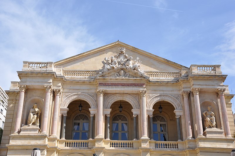 Imposant et représentatif des opéras de province, l'édifice occupe près de 2 000 m² et se situe au cœur de la ville. Il possède deux entrées : l'une ouverte aux spectateurs pendant les spectacles sur la place Victor Hugo (place du Théâtre), l'autre au nord donnant sur le boulevard de Strasbourg. La façade nord est ornée de six statues du sculpteur toulonnais Pierre-Marius Montagne, représentant les muses Euterpe, Terpsichore, Melpomène, Thalie, Calliope et Polymnie. De style néo-classique, le bâtiment présente des arcs en plein cintre, des colonnes grises et roses et un fronton.