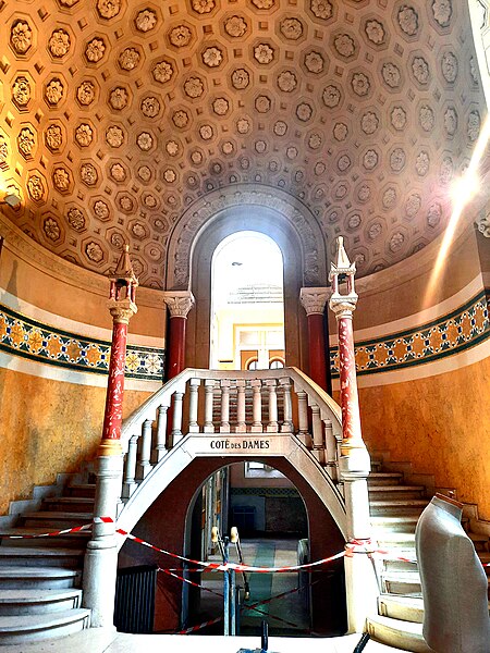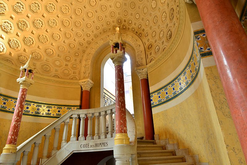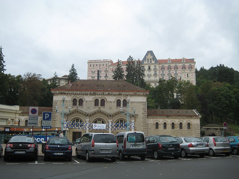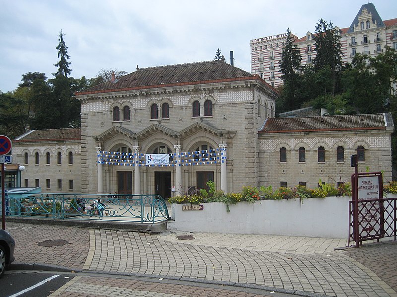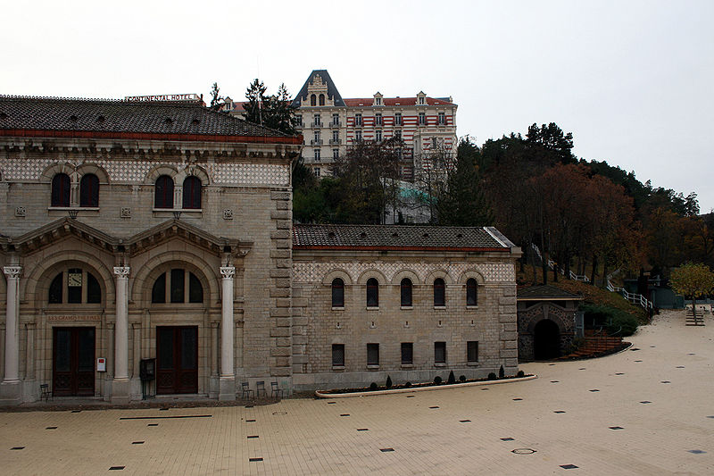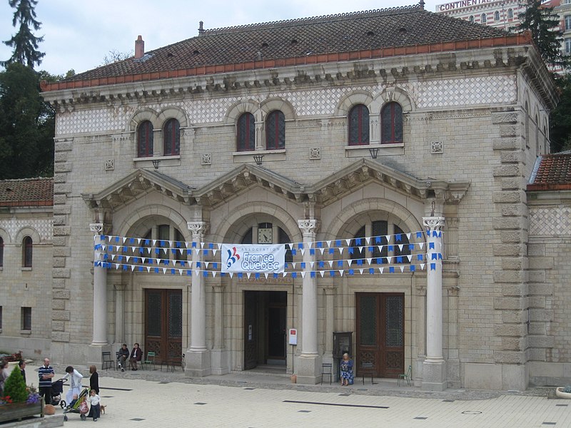 Les Grands Thermes, situés à Châtel-Guyon (Puy-de-Dôme, Auvergne-Rhône-Alpes), ont été construits en 1906 par l'architecte François-Benjamin Chaussemiche, Grand Prix de Rome (1893), à la demande de la Société des Eaux Minérales pour donner du prestige à la station thermale. L'édifice, de style romano-auvergnat mêlé de réminiscences antiques, constitue un exemple d'architecture éclectique de grande qualité. Adossé à la montagne, le bâtiment a été implanté à l'endroit où jaillissent les sources d'eau minérale chaude, la montagne ayant été creusée pour permettre cette implantation. Le plan rectangulaire se compose de quatre corps entourant un atrium couvert par une verrière. La façade principale présente un avant-corps central qui abrite le vestibule d'entrée et un vaste hall d'accueil promenoir, flanqué de deux ailes latérales et d'ailes en retour formant un carré autour de l'atrium. Ces ailes, réparties sur deux niveaux, contiennent les vestiaires et les cabines de soins, desservis par deux escaliers symétriques situés aux extrémités du grand hall. L'intérieur se distingue par la richesse de son décor en faïence polychrome, stuc et marbre ; les sols sont en mosaïques et carreaux de grès, et les faïences sont signées Boulenger (céramiste). Les portes du hall sont ornées de vitraux à décor non figuratif, et les chapiteaux ainsi que les ornements en stuc sont dus à A. Octobre. L'ensemble comporte également un pavillon à mosaïques, des galeries chauffées, une buvette en verre coloré et des cabines de bain dotées d'un mobilier en bois clair. L'essentiel du décor architectural extérieur est concentré sur la façade nord. En 1937, les terrasses ont été remplacées par des toitures à deux versants et les colonnes intérieures par du béton lisse. L'établissement a fermé en 2004. Les Grands Thermes font l'objet d'une inscription partielle au titre des monuments historiques par arrêté du 15 janvier 1990.