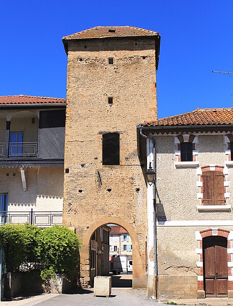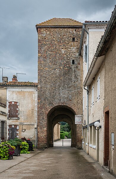 La porte d'enceinte, seul vestige relativement complet des anciennes fortifications, est aménagée dans une tour rectangulaire en briques et galets. Elle présente des jambages en pierre et se ferme par un arc en plein cintre; le passage du rez-de-chaussée est voûté en berceau et comporte deux meurtrières qui permettaient de défendre les fossés. L'ensemble semble dater de la fin du XIVe siècle, période de fondation de la bastide. La toiture actuelle ne correspond pas au style primitif.
