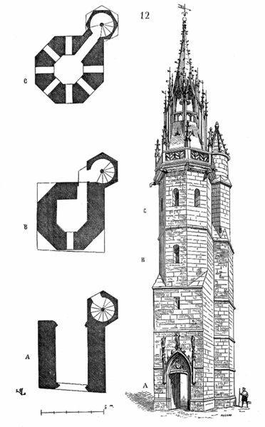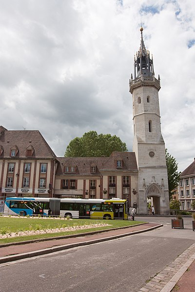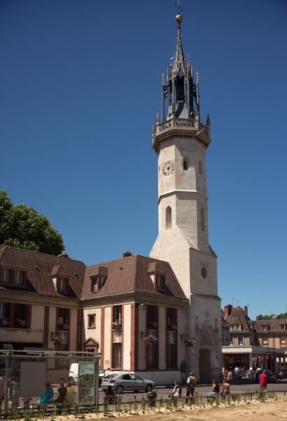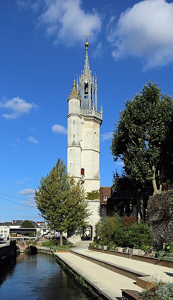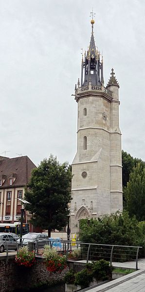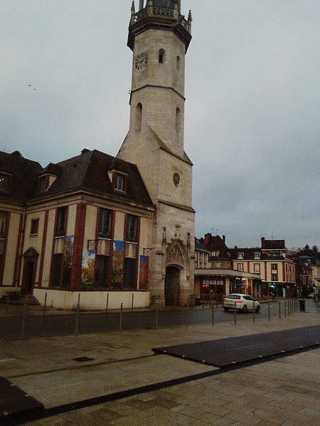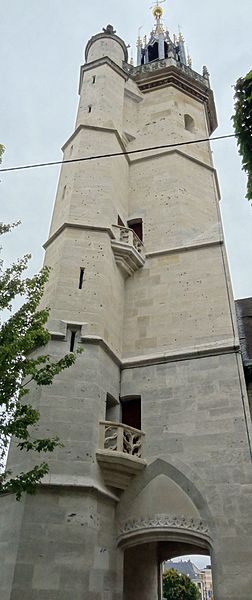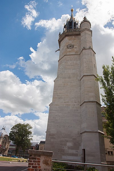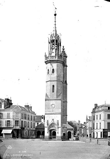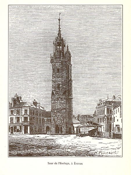 Avant 1396, une tour de la cathédrale servait de guet et abritait une cloche destinée à donner l'alerte ; en 1396 la ville se dota d'une première horloge installée dans un bâtiment en bois, la source affirmant qu'Évreux figura parmi les premières villes du royaume à posséder un tel appareil. Les besoins de la bourgeoisie en matière de réglage du temps pour la production et les échanges conduisirent l'assemblée des bourgeois, en 1403, à décider la construction d'une tour pour y installer une horloge et une cloche. La cloche, fabriquée en 1406, fut baptisée « Louyse » en hommage au dauphin Louis, fils de Charles VI et duc de Guyenne. La tour, érigée près de la porte de Rouen afin de surveiller la route menant à cette ville, fut achevée en 1410 et la cloche y fut installée la même année ; l'horloge, réalisée par un artisan de Mantes, commença à sonner les heures en 1412.