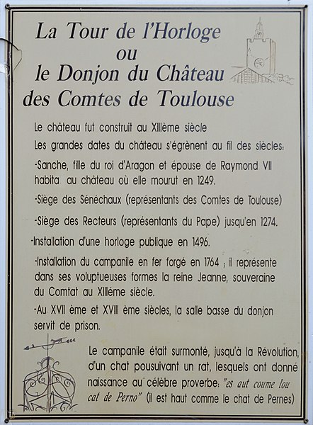 La Tour de l'Horloge, dite aussi ancien château des comtes de Toulouse, est un édifice situé à Pernes‑les‑Fontaines (Vaucluse). Elle est inscrite au titre des monuments historiques le 29 septembre 1928. Cette tour correspond au donjon du château élevé sur le mamelon par les comtes de Toulouse. Installée sur une hauteur du village, elle est surmontée d'un campanile qui porte une cloche. Sa base est rectangulaire, mesurant 9,50 m sur 7,50 m. La bibliographie cite notamment Jérémy Taulier, « Pernes‑les‑Fontaines, le château », dans les actes du Congrès archéologique de France (Monuments d'Avignon et du Comtat Venaissin, 175e session, 2016). Des ressources en ligne existent, notamment la base Mérimée et les portails du Vaucluse, de l'architecture et de l'urbanisme, ainsi que des monuments historiques français.