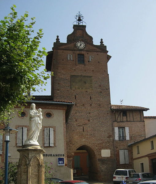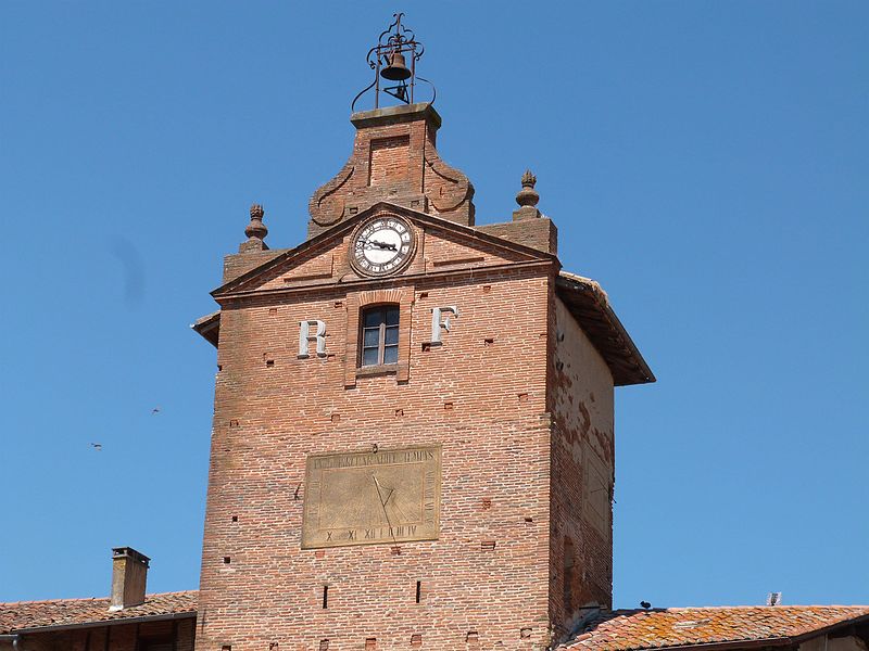 Ancienne porte de ville, la Tour de l'Horloge se présente comme une tour carrée en briques située sur la place ; sa façade arrière est à pans de bois. Du côté de la place, elle est surmontée d'un fronton abritant l'horloge et une cloche, reposant sur un motif d'influence baroque. À sa base, une porte permet le passage vers une rue. Un cadran solaire et une inscription complètent l'ensemble.