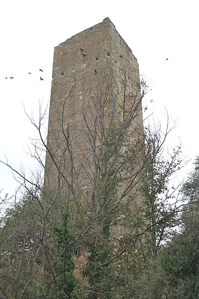 De plan carré, elle mesure environ 6 m de côté pour une hauteur de 20 m, avec des murs d’un mètre d’épaisseur. La tour compte trois niveaux; deux étages sont voûtés en berceau plein cintre. Aucun escalier n’est conservé : l’accès aux étages supérieurs se réalisait par échelles, via des ouvertures ménagées dans les voûtes. La porte basse n’est pas ancienne. La partie supérieure montre les vestiges d’un ancien crénelage, soulignés par une rangée de trous de boulins à la base des merlons, indice probable d’une galerie en bois ou d’un hourd en encorbellement; cette élévation a été reprise postérieurement, de sorte que la tour est aujourd’hui plus haute qu’à l’origine. Quelques archères complétaient son système de défense.