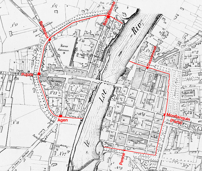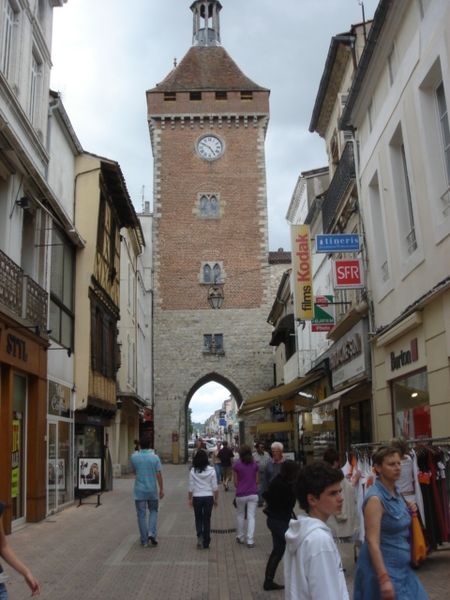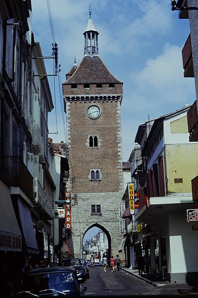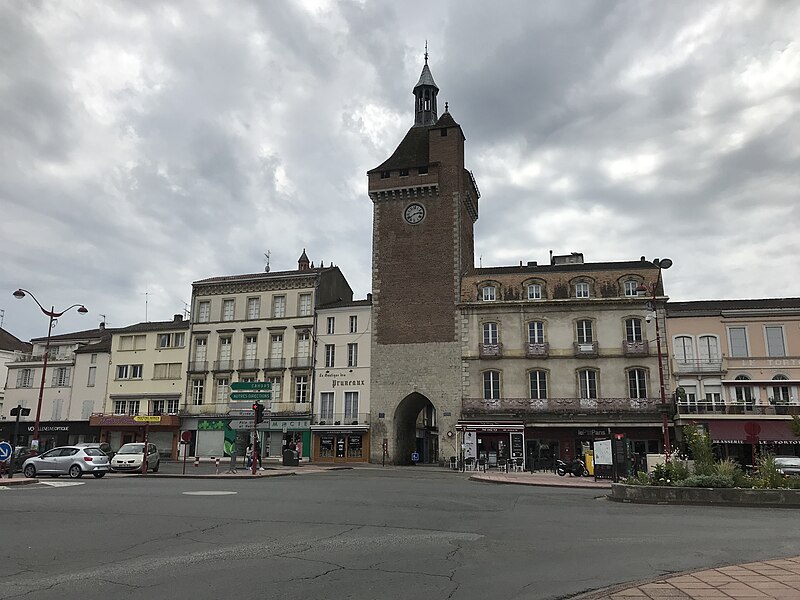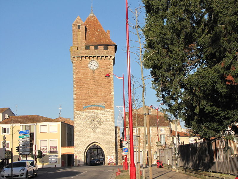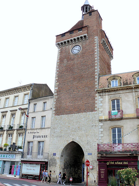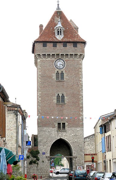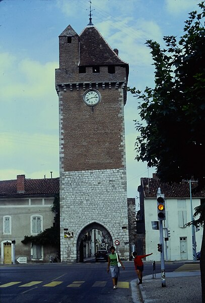 À Villeneuve-sur-Lot subsistent deux anciennes portes de l'enceinte médiévale, connues sous les noms de tours de Pujols et de Paris. La bastide a été fondée par Alphonse de Poitiers en 1264 ; selon F. de Mazet, Alphonse aurait fait édifier une enceinte dès 1259, des tours antérieures ayant servi d'appuis. Chaque porte se présente comme un passage voûté surmonté de deux étages et coiffé d'une haute tour carrée pourvue de mâchicoulis et d'une toiture à quatre pans. Les étages supérieurs sont couronnés par un chemin de ronde crénelé et chaque niveau comporte une salle éclairée, du côté de la ville, par une baie géminée. Un escalier en bois reliait probablement le premier au second étage, tandis qu'un escalier en pierre aménagé dans un angle de la tour permettait d'accéder au chemin de ronde ; sa partie supérieure émergeait au-dessus de la toiture et servait de guet. La charpente, portée par des piliers en briques, prolonge son chevronnage jusqu'au parapet crénelé. L'élévation supérieure des tours est en briques et pierres, postérieure à la partie inférieure qui forme le passage de la porte. Le second étage abrite la chambre de l'horloge municipale, dont la sonnerie est suspendue dans un campanile du XIXe siècle qui couronne aujourd'hui l'édifice. Fernand de Mazet décrit l'enceinte comme un mur de dix mètres de haut et de deux mètres d'épaisseur, avec des assises en pierres de moyen appareil jusqu'à deux mètres au-dessus du fossé et des élévations en briques jusqu'aux créneaux ; les portes partageaient ce dispositif, leurs hauteurs étant en briques jusqu'aux mâchicoulis. Les fossés étaient alimentés par plusieurs ruisseaux se jetant dans le Lot et, sur les deux rives, l'enceinte comportait de nombreuses portes et poternes ainsi qu'un pont autrefois fortifié. L'enceinte rive gauche mesurait environ 1 020 mètres et celle rive droite 960 mètres. Les fortifications ont été refaites par Jean de Bourbon au quatrième quart du XIVe siècle et réparées sous la direction du capitaine Despeyroux au troisième quart du XVIe siècle ; elles furent par la suite renforcées par des demi-lunes et des éperons en terre. La ville a résisté à des attaques, notamment en 1429 face aux Anglais et lors d'une tentative de prise en 1585 conduite par Marguerite, sans que la cité ne tombe. Au cours du XVIIe siècle et de la Fronde, les fortifications subirent encore des épisodes de siège et d'aménagement ; les fossés furent comblés puis plantés d'ormes au XVIIIe siècle, et la tour de Puy-Merle fut démolie après une crue en 1783. Un relevé de 1792 montre des remparts peu entretenus et ponctuellement interrompus par des façades de maisons. Les portes de Paris et de Pujols ont été classées au titre des monuments historiques et restaurées au début du XXe siècle, avec une intervention de l'architecte Henri Rapine en 1908. Ces deux tours sont les principaux vestiges visibles de l'ancienne enceinte de Villeneuve-sur-Lot.