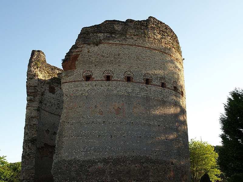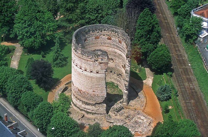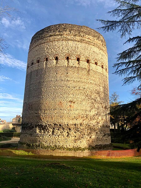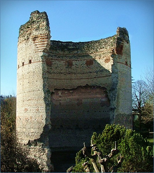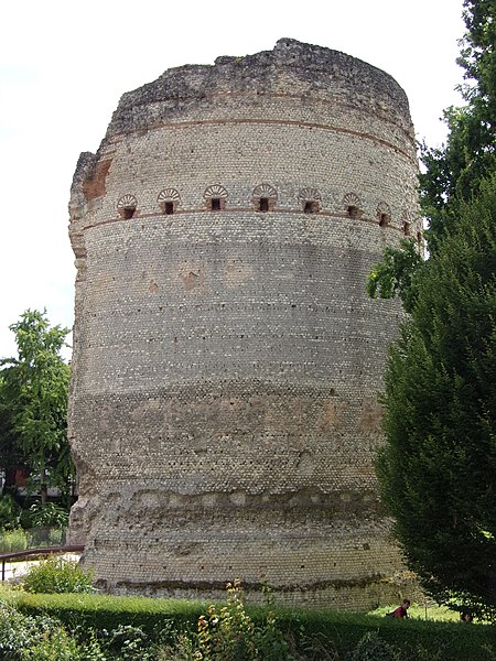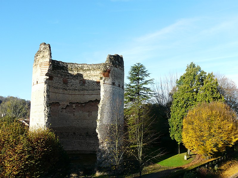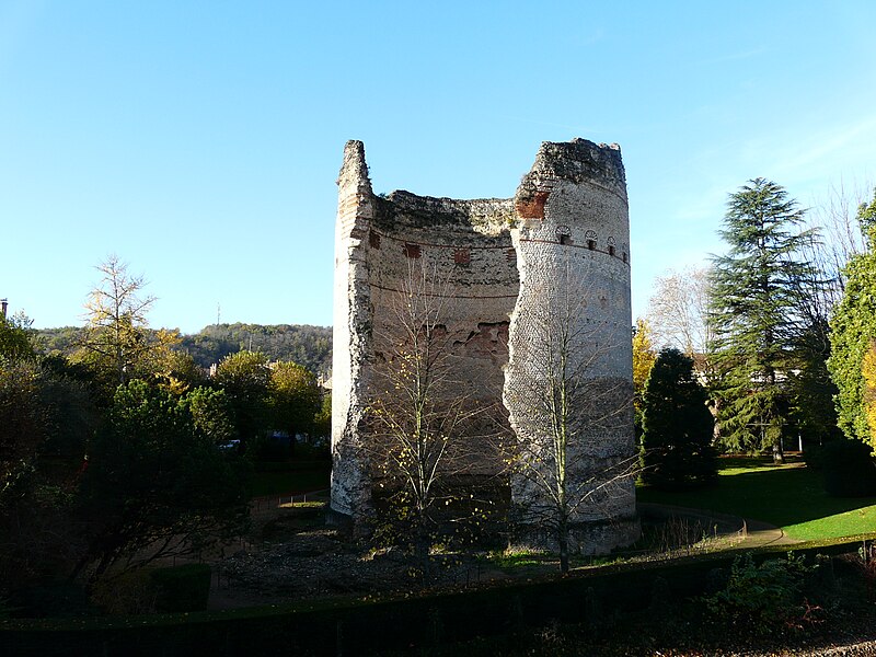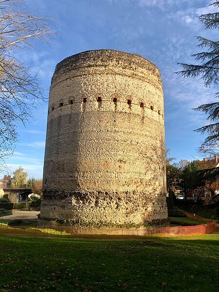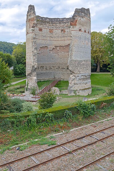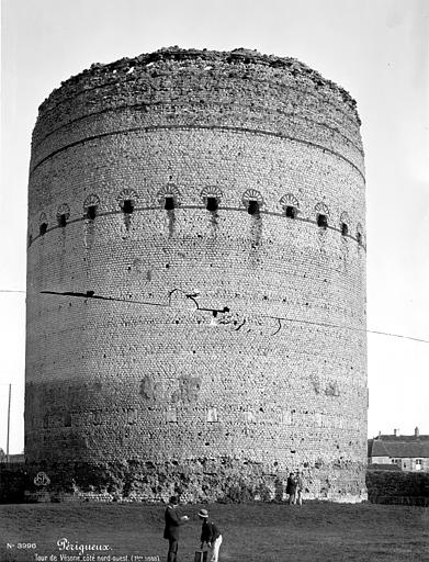 La tour de Vésone est le vestige d'un temple gallo‑romain dédié à Vesunna, la déesse tutélaire des Pétrocores ; elle se situe au sud de Périgueux, dans le quartier de Vésone, en bordure de la ligne de chemin de fer Périgueux–Brive. De plan cylindrique, elle occupe le jardin de Vésone à une cinquantaine de mètres à l'ouest du musée Vesunna ; une brèche de près de neuf mètres entame son flanc est. Les murs, montés en blocage et parementés sur les deux faces de petits moellons taillés, présentent un appareil continu jusqu'à treize mètres de hauteur. À 4,50 mètres du sol, des pierres de taille régulièrement espacées traversent la paroi sur toute son épaisseur et forment à l'intérieur une saillie. Un cordon de deux rangs de briques ceinture le monument à treize mètres ; au‑dessus, des cavités latérales en brique sont visibles et le sommet est fermé par un arc de décharge dont les claveaux alternent brique et calcaire. Le parement de moellons se poursuit jusqu'à un second cordon de briques, puis des cordons similaires se reproduisent tous les 1,32 mètre. On observe à l'intérieur et à l'extérieur quelques plaques d'enduit au mortier de tuileau. Du côté est, une ouverture correspondait à la porte du monument : son cadre en pierre de taille complétait l'ordonnance de la cella et un mur circulaire venait buter contre un massif de maçonnerie au droit de cette ouverture. Des fragments de chapiteaux, de colonnes, de pilastres et de bases de différents diamètres ont été retrouvés ; ils proviennent vraisemblablement d'une colonnade du mur circulaire formant galerie ou de la décoration intérieure. Les études indiquent un diamètre extérieur de 19,60 mètres, un diamètre intérieur de 17,10 mètres, une épaisseur de mur de 2,10 mètres à la base réduite à 1,80 mètre au‑dessus d'un retrait de soubassement ; la tour s'élève entre 21 et 24,46 mètres au‑dessus du sol actuel et atteint 27 mètres depuis le rocher sur lequel elle est fondée. La tour constitue la cella d'un temple élevé au Ier ou au IIe siècle. À l'origine, un péribole rectangulaire de 141 par 122 mètres délimitait un enclos de plus d'un hectare et demi autour d'un temple surélevé par un podium. L'accès se faisait par un pronaos rectangulaire à six colonnes ouvrant sur un péristyle de vingt‑trois colonnes entourant la cella circulaire. L'architecture combine le fanum celtique — corps circulaire entouré d'une galerie basse — et le modèle de temple romain à pronaos et cella, traduisant une synthèse entre romanisation et traditions locales. Les premières fouilles intérieures furent entreprises par Mgr Machéco de Prémeaux mais interrompues en 1751 ; elles furent reprises en 1820 par le comte de Taillefer et Joseph de Mourcin, qui mirent au jour la base du mur circulaire enveloppant la tour et proposèrent qu'il soutînt un péristyle. En 1833 le site, propriété du comte de Taillefer, fut cédé à la ville de Périgueux, et la tour fut classée monument historique en 1846. La construction de la ligne de chemin de fer Périgueux–Brive et l'aménagement des rues voisines entraînèrent la destruction des vestiges de l'enceinte protectrice. En 1894 la ville acquit le jardin pour y installer un square archéologique et fit reprendre des fouilles qui confirmèrent l'interruption du mur circulaire du côté opposé à la brèche, révélèrent des constructions à l'ouest du temple et permirent de déblayer l'intérieur jusqu'au dallage antique. Les fouilles menées par Charles Durand dans les années 1906–1909 dégagèrent le péribole avec ses galeries et mirent au jour le péristyle par lequel s'effectuait l'entrée de la cour du temple. Les inscriptions conservées au musée d'Art et d'Archéologie du Périgord montrent que le sanctuaire était dédié à la Tutela Vesunnae, c'est‑à‑dire à la divinité tutélaire de la ville, alors que le comte de Taillefer avait autrefois proposé une attribution à Isis. La tradition locale attribue la brèche à saint Front, mais elle paraît plutôt liée au retrait des gros blocs formant la porte, qui aurait entraîné l'effondrement de la partie haute. Les études et publications successives ont approfondi la connaissance du site, qui reste un exemple majeur de sanctuaire gallo‑romain en Périgord, et de nombreux documents et photographies montrent la tour dans son parc, des vues du côté ouest, des détails du sommet et des cavités en briques ainsi qu'un panneau représentant saint Front face à un dragon.