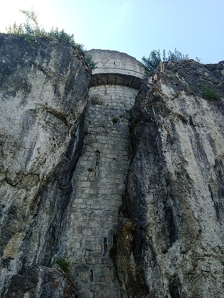 Le donjon, dont la construction remonterait au deuxième quart du XIIIe siècle, est l'une des premières tours circulaires de Savoie, une forme qui améliore la défense en supprimant les angles morts. Bâtie sur la faille naturelle d'un imposant bloc erratique transporté par le glacier du Mont-Blanc, la tour repose sur un rocher qui aurait été posé à la fonte des glaces il y a environ 10 000 ans. Les constructeurs ont maçonné la faille en façade et l'ont aménagée intérieurement en quatre caves superposées; le donjon comportait trois étages au‑dessus du rocher. Des travaux réalisés à la fin du XIXe siècle par les moines capucins ont percé le rocher, donnant l'illusion de deux blocs alors qu'il s'agit d'un seul.
