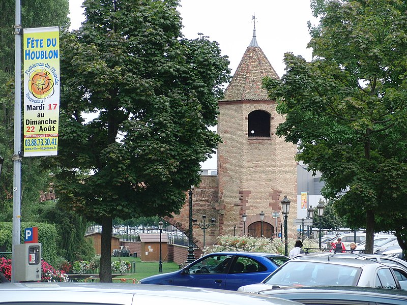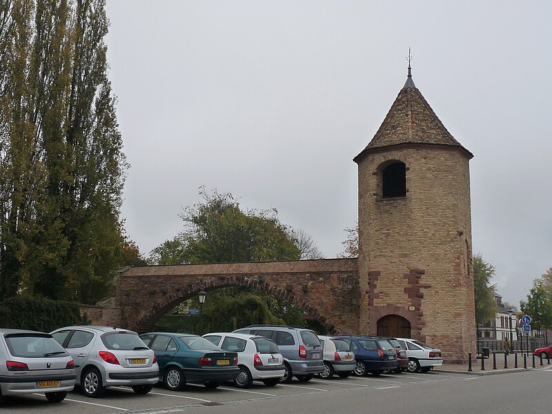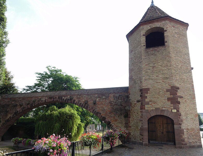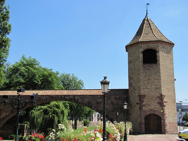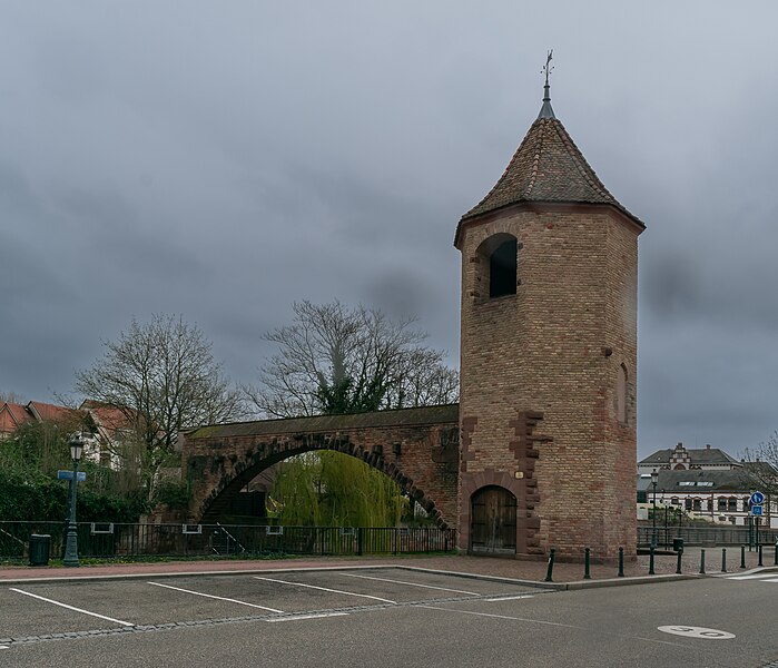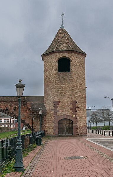 La Tour des Pêcheurs, classée aux Monuments historiques depuis 1923, se situe au 2 quai des Pêcheurs à Haguenau, en face du lycée Robert‑Schuman. Elle fait partie des vestiges des enceintes médiévales de la ville : la première enceinte date de l'époque où Haguenau est appelée Castellum (mentionnée dès 1143) et la seconde, élevée vers 1230, a englobé le noyau primitif en intégrant notamment la porte des chevaliers et la tour des Pêcheurs. Construite entre 1228 et 1235, la tour comporte une arche enjambant la Moder et servait, avec une herse, à fermer la circulation fluviale le soir. Jusqu’à la Révolution la Moder était navigable et des bateaux de pêche à fond plat entraient et sortaient de la ville, ce qui explique la dénomination du moulin de la Herse. De plan octogonal, le premier niveau date du XIIIe siècle et est réalisé en briques et en blocs de gré (céramique), tandis que les niveaux supérieurs appartiennent au XVIe siècle. Le rez‑de‑chaussée est voûté en cul‑de‑four et percé d’une trappe zénithale ; un étage, actuellement ouvert sur la charpente de la flèche, surmonte l’édifice. La tour a été restaurée à plusieurs reprises : certaines ouvertures côté ouest présentent un aspect moderne et d’autres sont aujourd’hui murées. Du côté extérieur de l’enceinte, les pans orientaux comportent trois canonnières. Au nord, la tour est flanquée d’une arche chaperonnée qui franchit la Moder, vestige du dispositif de fermeture de la voie d’eau. D’autres tronçons de mur et portes subsistent dans la ville, témoignant de l’évolution défensive jusqu’au déclassement de Haguenau comme place forte en 1867 et aux destructions et aménagements qui suivirent à partir de 1871. Aujourd’hui la tour demeure un repère du patrimoine local et, au pied de l’édifice, le « rendez‑vous de la tour » propose chaque été concerts, démonstrations, ateliers, expositions et soirées thématiques.