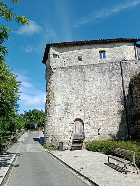 La tour, construite en gros moellons de calcaire local et aujourd’hui couverte d’un toit de tuiles, présente un léger encorbellement qui devait soutenir un dispositif défensif ; des meurtrières, probablement pour armes à feu, datent des aménagements de 1547. Dans le sous‑sol, une salle protégée par une meurtrière donnait sans doute accès à des souterrains. L’intérieur de la tour est en grande partie comblé de terre ; plus tard on y ouvrit des fenêtres lorsqu’elle servit de corps de garde, puis de logement. Une poterne en plein cintre s’ouvre vers l’ouest, sur l’ancien chemin de ronde aujourd’hui boulevard du Nord ; une meurtrière l’accompagne.