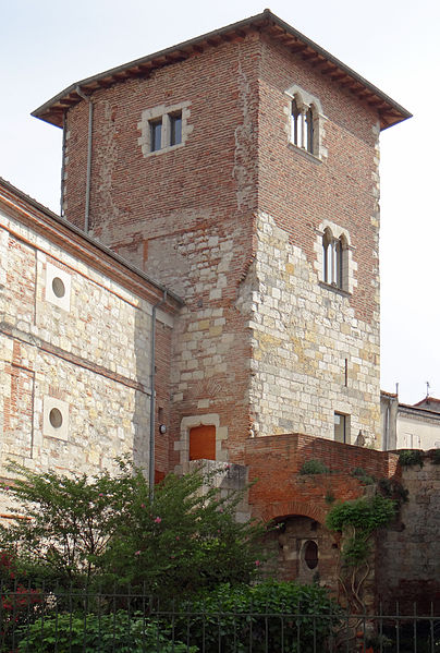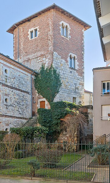 La Tour du Chapelet, située à Agen, est adossée au mur ouest de la maison n°3 de la rue François-Arago et entièrement visible depuis la rue des Augustins. Elle faisait partie de la première enceinte de la ville ; un pan de mur en vieil appareil, seul vestige de cette enceinte antérieure au XIIIe siècle, lui est encore rattaché du côté ouest. L’enceinte a été reconstruite à plusieurs reprises de la fin du IIIe au XIe siècle et définitivement élevée au début du XIIe siècle. Selon Philippe Lauzun, la base carrée de la tour, bâtie en moyen appareil, remonte au XIIe siècle ; ses murs ont 1,25 m d’épaisseur. La partie inférieure, d’inspiration romane, comprend une salle basse voûtée en berceau légèrement brisé et percée d’ouvertures en plein cintre ; cave et salle formaient à l’origine une seule pièce avant qu’un plancher, accessible depuis un escalier extérieur, ne la divise et ne crée une cave. Au premier étage s’ouvre une fenêtre géminée ornée d’une colonnette en marbre blanc dans sa partie supérieure. La tour compte trois étages ; les deux derniers sont construits en briques et la partie supérieure a été remaniée au XIVe siècle ou plus tard, probablement après la réalisation d’une nouvelle enceinte. Située au nord, elle défendait le côté le plus faible de la ville, dominé par le coteau. Son appellation vient du couvent du Chapelet : englobée lors de la fondation du couvent des Dominicaines le 28 février 1585, la tour aurait servi de clocher à leur chapelle selon la tradition. Le couvent fut démantelé à la Révolution ; la tour a ensuite été utilisée comme entrepôt de salpêtre en 1795, comme magasin de fourrages jusqu’en 1814, la municipalité décidant en 1815 d’en faire une prison correctionnelle. En 1818 elle accueillit une école d’enseignement mutuel et, après la vente en nombreux lots de l’ancien couvent en 1822, devint annexe de la maison du n°3 de la rue François-Arago. Longtemps abandonnée, la tour a été rénovée en 2000 pour recevoir l’agence d’architecture de Stéphane Thouin. Elle a été inscrite au titre des monuments historiques en 1950.