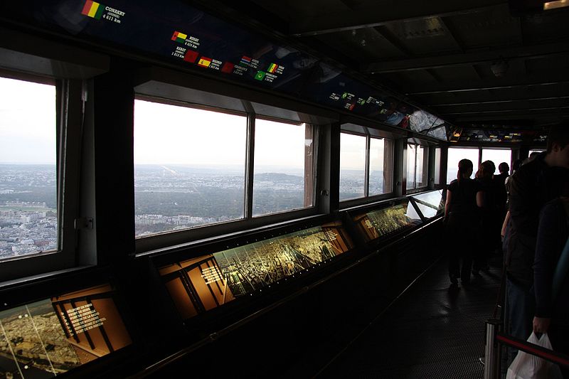 Le premier étage, situé à 57,63 mètres et d’une surface d’environ 4 200 m2, offre une galerie panoramique à 360° ponctuée de tables d’orientation, de longues‑vues et des noms en lettres d’or de soixante‑douze savants, ainsi qu’un restaurant et des vestiges historiques comme des tronçons de l’escalier d’origine ; un observatoire y retrace les mouvements de la tour sous l’effet du vent et de la dilatation thermique. Le deuxième étage, à 115,73 mètres et d’environ 1 650 m2, permet une lecture optimale de la perspective urbaine grâce à des hublots dans le plancher ; il abrite le restaurant Le Jules Verne, accessible par un ascenseur privé, et des dispositifs de protection destinés à la sécurité des visiteurs. Le troisième étage, situé à 276,13 mètres avec une plateforme extérieure proche de 279,11 mètres, est accessible uniquement par ascenseur et comprend un espace d’observation ; le second niveau de ce troisième étage, à 279,11 mètres, constitue la plus haute plate‑forme d’observation ouverte au public dans l’Union européenne.