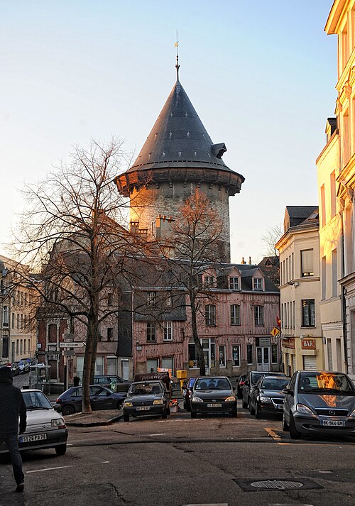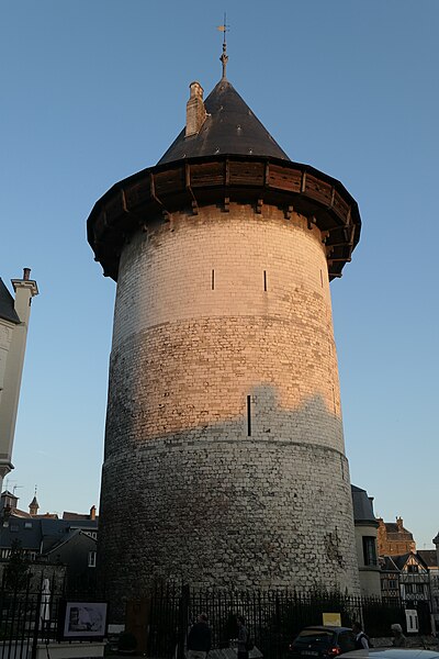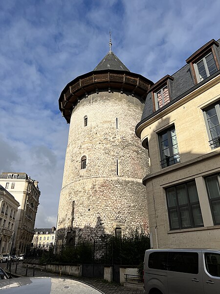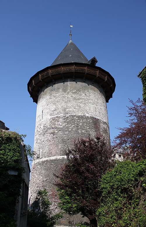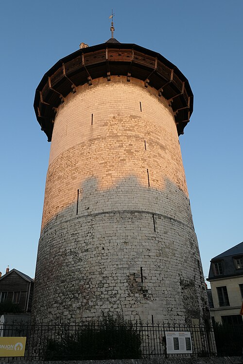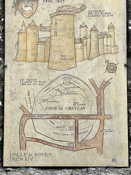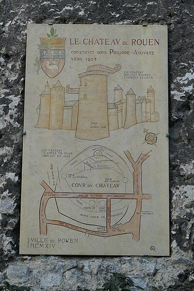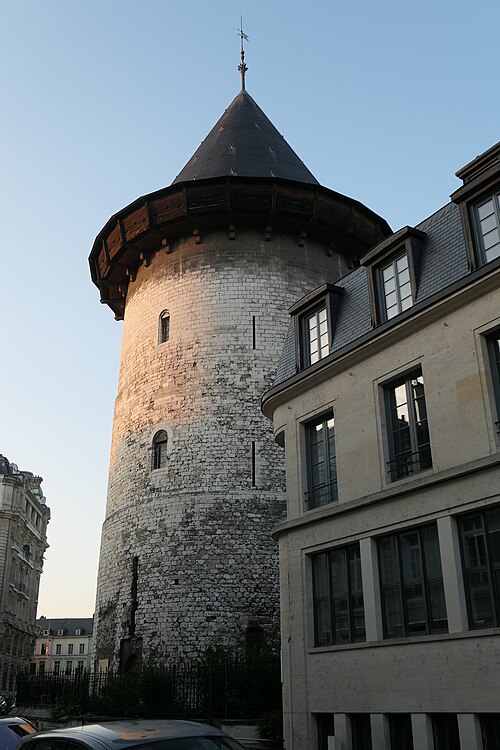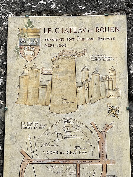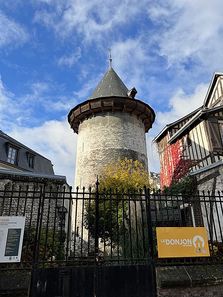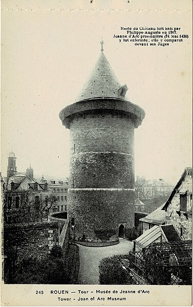 La tour dite de Jeanne d'Arc, également appelée ancien donjon ou anciennement « Grosse Tour », était la tour maîtresse du château de Rouen élevé par Philippe Auguste à partir de 1204 ; elle est le seul vestige en élévation de cet ensemble et se dresse à Rouen, en Seine‑Maritime, en Normandie. Classée au titre des monuments historiques sur la liste de 1840, elle se situe sur la colline de Bouvreuil, à environ 700 mètres au nord‑nord‑ouest de la cathédrale Notre‑Dame. Lors du procès de condamnation de Jeanne d'Arc, le donjon servit de cadre à une séance où elle fut menacée de torture et mise en présence de ses bourreaux et des instruments de torture ; elle déclara alors qu'elle ne dirait rien si l'on devait lui faire retirer les membres ou tuer son âme, ou que, si l'on parvenait à lui faire dire quelque chose, elle dirait ensuite que cela lui avait été extorqué par la force. Contrairement à l'origine présumée de son nom, Jeanne n'aurait pas été emprisonnée dans ce donjon mais dans une autre tour, dite tour de la Pucelle, aujourd'hui détruite ; ses substructions subsistent au 102 rue Jeanne‑d'Arc, où une plaque de marbre noir et une sculpture en calcaire rappellent ces vestiges. La cour intérieure de l'immeuble implanté sur ces substructions a été aménagée pour préserver et mettre en valeur les vestiges archéologiques, qui comprennent un puits et une galerie en surplomb permettant l'observation publique et l'accès aux appartements. Durant la Seconde Guerre mondiale, le donjon fut camouflé et transformé par les forces allemandes en bunker, et sa partie supérieure fut alors bétonnée. Construite en calcaire local, la tour est de plan circulaire, haute de trente mètres pour un diamètre de quatorze mètres, avec des murs épais d'environ quatre mètres percés de rares et étroites meurtrières. Elle comporte quatre étages aux fonctions distinctes, dont deux sont voûtés en croisées d'ogives ; le dernier étage ouvre sur un chemin de ronde pourvu de hourds de bois reposant sur des corbeaux de pierre. L'accès se faisait depuis la courtine, à quelques mètres du sol, par des ponts volants. La toiture en poivrière et les hourds ont été ajoutés lors des travaux de restauration conduits de 1866 à 1874 par l'architecte Louis Desmarest, sur les avis de Viollet‑le‑Duc. Située entre la rue Bouvreuil et la rue du Donjon, la tour est aujourd'hui aménagée en musée ; depuis 2017 elle accueille aussi des décors de reconstitution pour des escape games historiques, proposant successivement des scénarios consacrés au XIIIe et au XVe siècles et, plus récemment, une reconstitution du bunker de l'occupation dans le scénario « Libérez Rouen ! ».