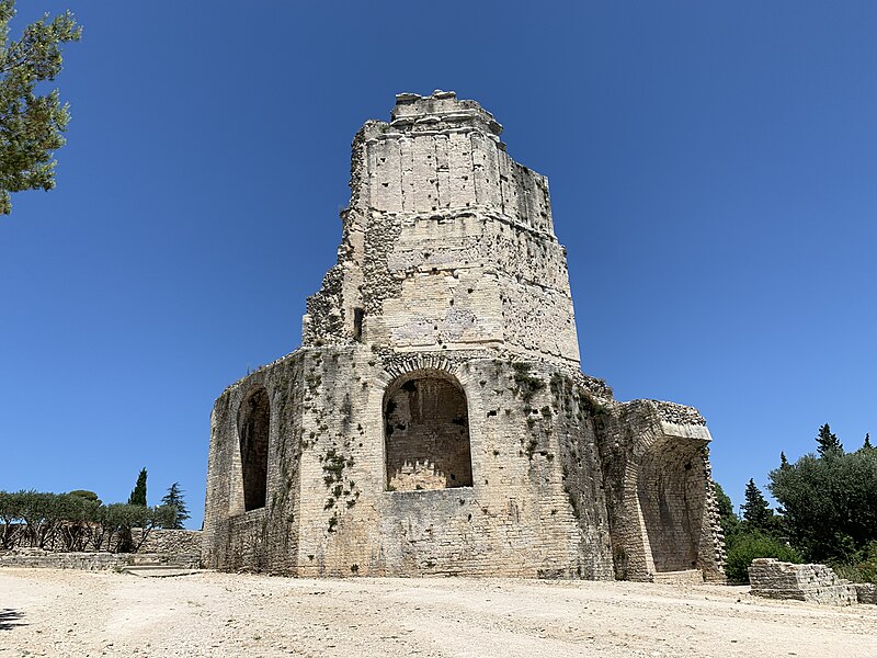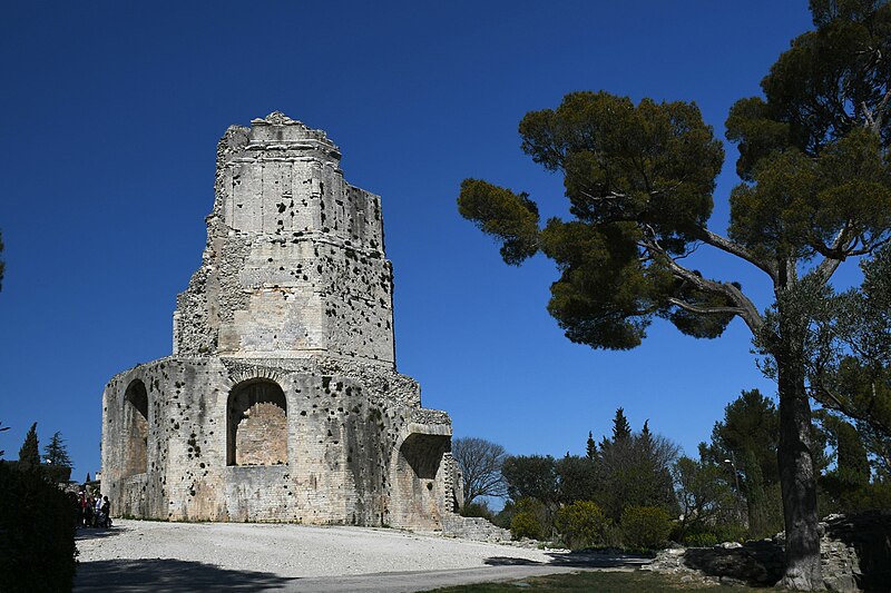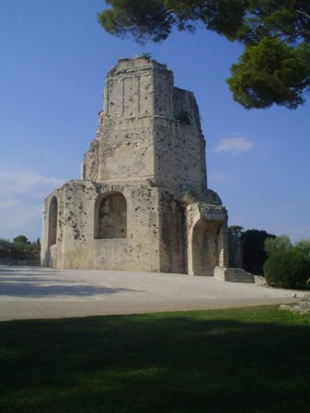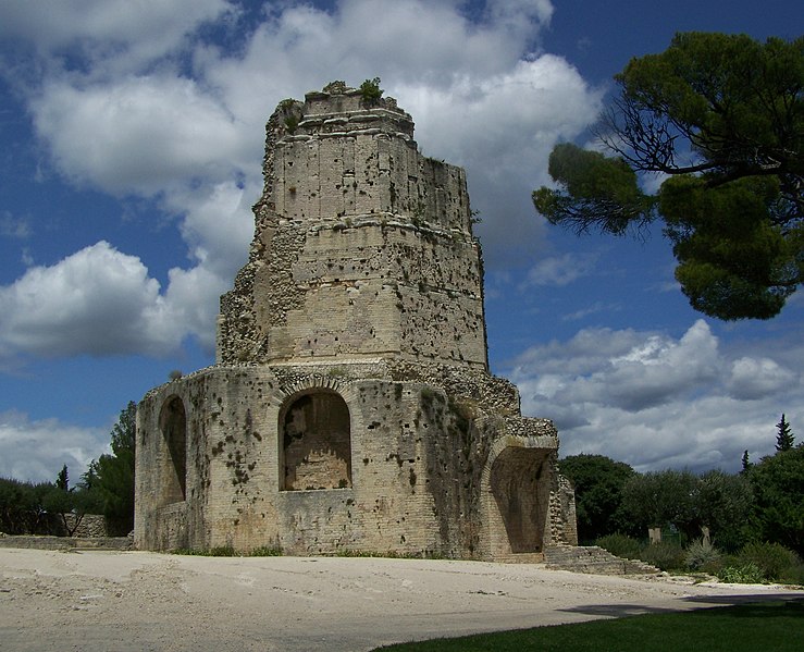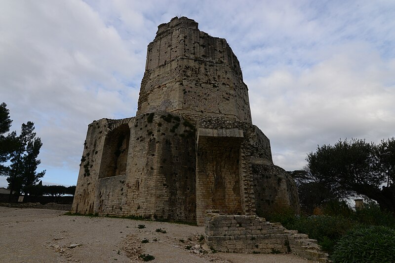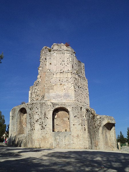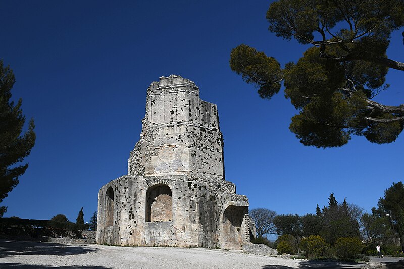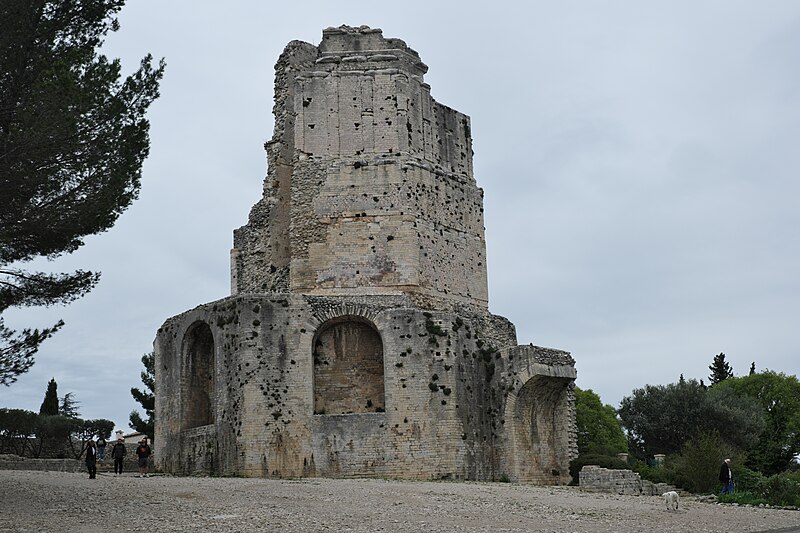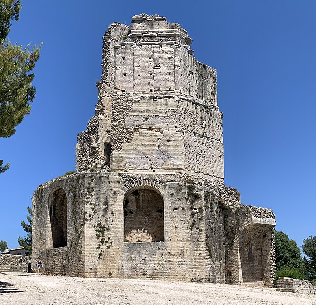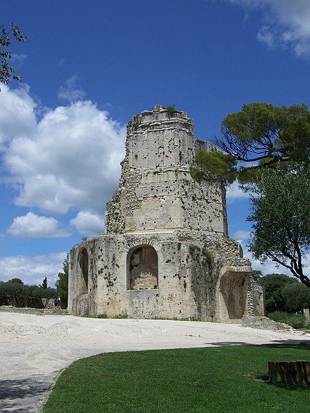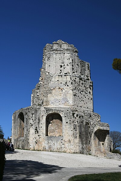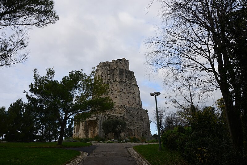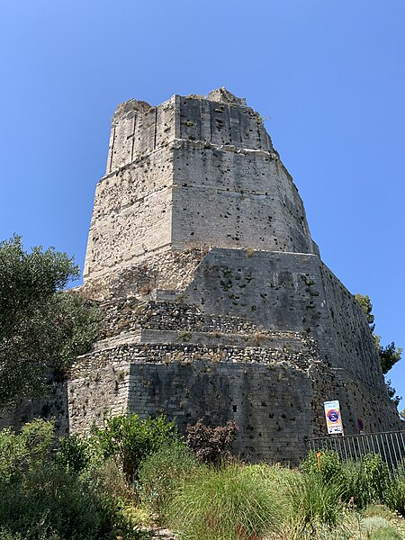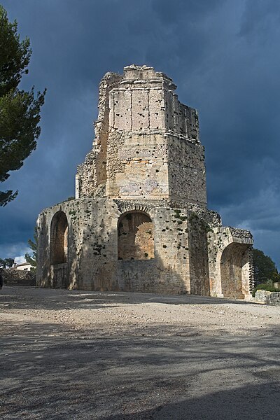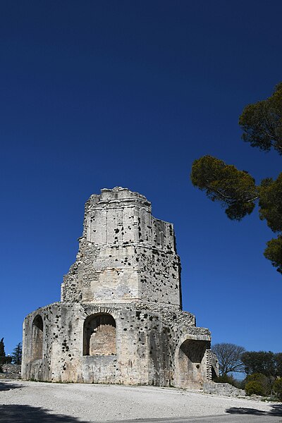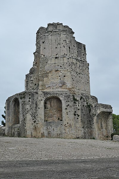 La Tour Magne, située sur le mont Cavalier à Nîmes, domine les Jardins de la Fontaine et constitue le plus imposant vestige de l'enceinte romaine de la ville. Dès la fondation de Nîmes, en -27, une enceinte d'environ 6 km, couvrant près de 220 ha, fut édifiée ; sa courtine, épaisse de 2,10 m et haute de plus de 8 m, ponctuée de tours et de portes monumentales, suit la topographie en occupant les crêtes et les points dominants. Au-delà de sa fonction défensive, cette muraille jouait également un rôle de prestige à forte signification idéologique à l'époque impériale. Installée sur la colline la plus élevée et visible de loin, la Tour Magne a fait l'objet de diverses interprétations : trophée de Domitius Ahenobarbus, imitation du phare d'Alexandrie ou tour d'observation et de signalement selon Léon Ménard. En 1601, François Traucat, autorisé par le roi Henri IV, creusa l'intérieur à la recherche d'un trésor et le vida, révélant un blocage que les archéologues modernes ont reconnu comme la maçonnerie d'une tour préromaine antérieure. Cette tour préromaine s'inscrit dans une série caractéristique d'architecture défensive protohistorique, comparable, quoique moins spectaculaire, à des exemples d'oppida voisins comme Nages ou Ambrussum. Point fort de la fortification indigène, elle dominait et signalait le sanctuaire de source dédié à Nemausus. L'édifice pré-romain fut transformé à l'époque d'Auguste pour devenir la Tour Magne telle que les Romains l'ont intégrée à l'enceinte. La tour mesurait 18 m à la fin du IIIe siècle av. J.-C., atteignit 36 m à l'époque romaine et ne culmine aujourd'hui qu'à 32,50 m. Thomas Platter la remarqua déjà évidée en 1596. Elle repose sur un soubassement octogonal dont l'irrégularité traduit la forme de la tour en pierre sèche qu'il englobe, visible encore à l'intérieur en négatif. Une rampe coudée de 70 m, dont subsistent le départ au sud et une partie de la dernière arche, conduisait au chemin de ronde du premier niveau, qui permettait de rejoindre le chemin de ronde de la courtine au nord et à l'ouest. Au-dessus de cet étage intégré à l'enceinte, la tour polygonale est aveugle ; l'accès à la terrasse se faisait par un escalier intérieur de 132 marches. Les deux derniers niveaux étaient ornés : l'un de pilastres toscans, l'autre, aujourd'hui presque disparu, de colonnes. Sa fonction a donné lieu à de nombreuses hypothèses ; reliée à la muraille, elle pouvait assurer la défense et servir de tour de guet ou de signalisation, et sa hauteur doublée tenait aussi lieu de manifestation de la puissance romaine. La Tour Magne fait l'objet d'un classement parmi les monuments historiques par la liste de 1840 et est aujourd'hui gérée en délégation de service public par la société Edeis Romanité. Principalement accessible depuis les Jardins de la Fontaine, elle est ouverte tous les jours et un billet à tarif préférentiel permet de visiter les Arènes et la Maison carrée. Des documents en braille et en gros caractères, des plans thermoformés sur demande, des boucles d'induction magnétique et une tablette proposant une visite filmée sont proposés aux visiteurs ; la tour comporte toutefois 140 marches et n'est pas accessible aux personnes en fauteuil. La Tour Magne a aussi inspiré des écrivains et des poètes : les vers holorimes de Marc Monnier lui sont consacrés, elle apparaît dans le poème "Guitare" de Victor Hugo repris par Georges Brassens, et elle est évoquée dans les Poèmes à Lou de Guillaume Apollinaire.