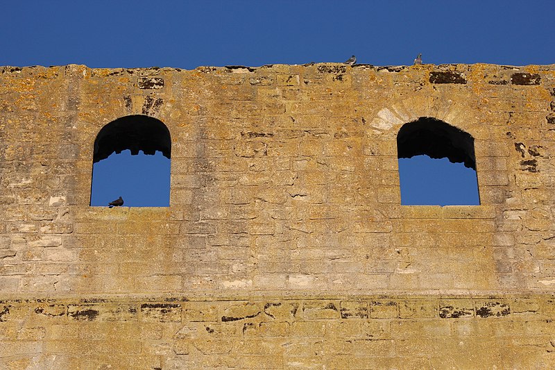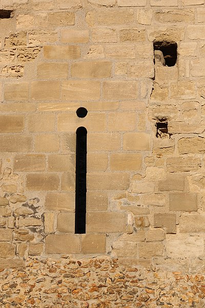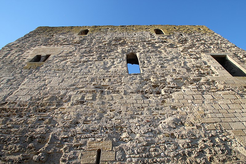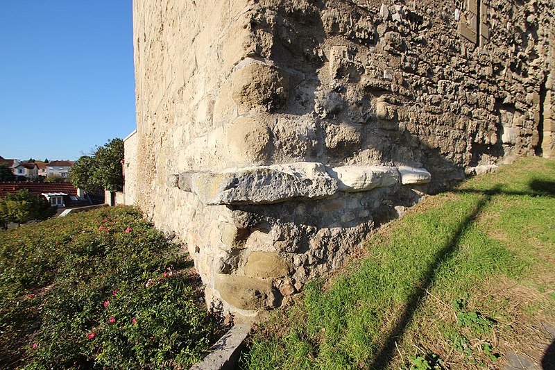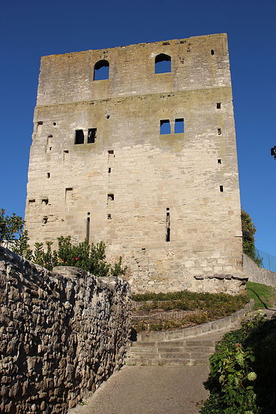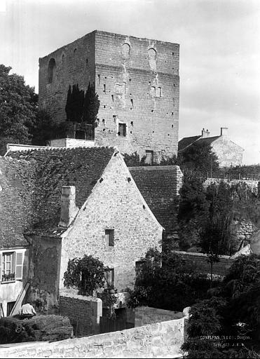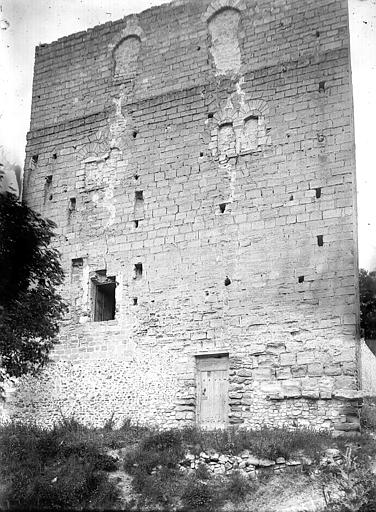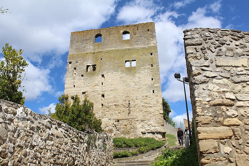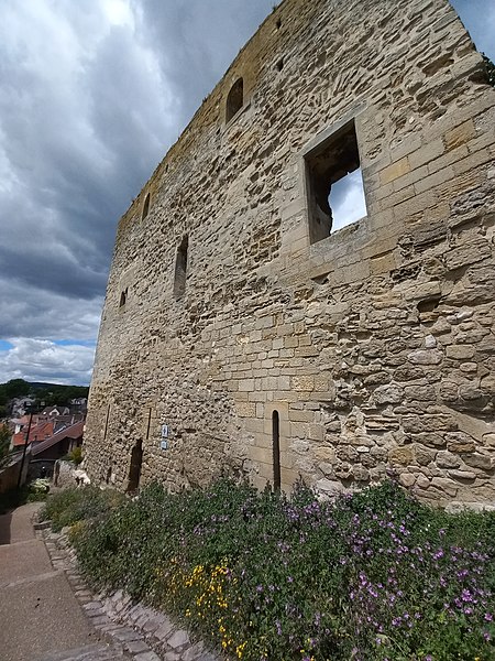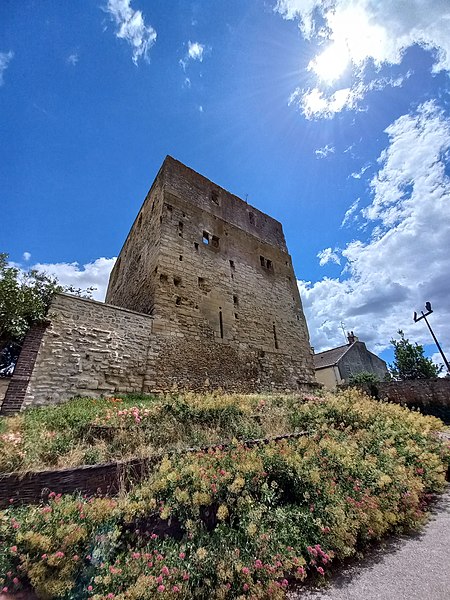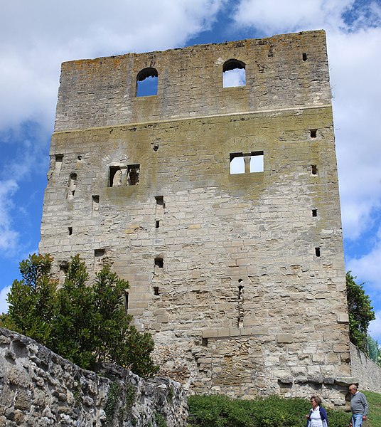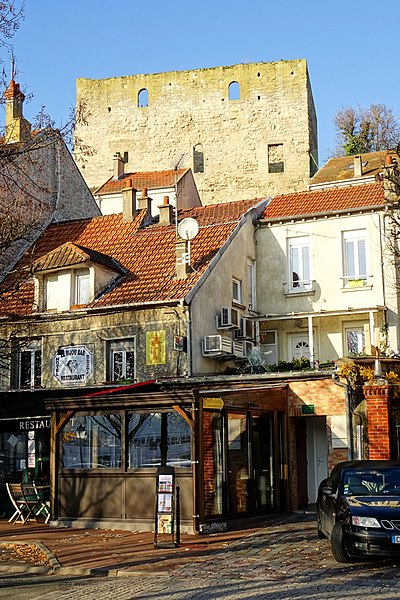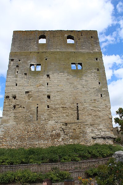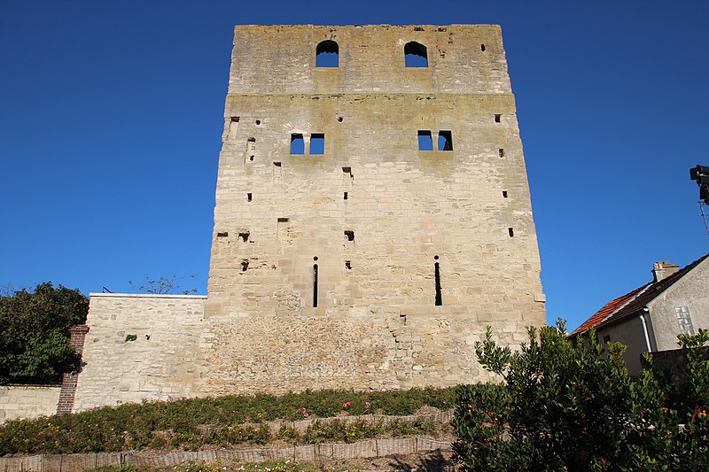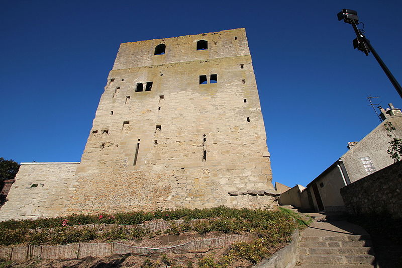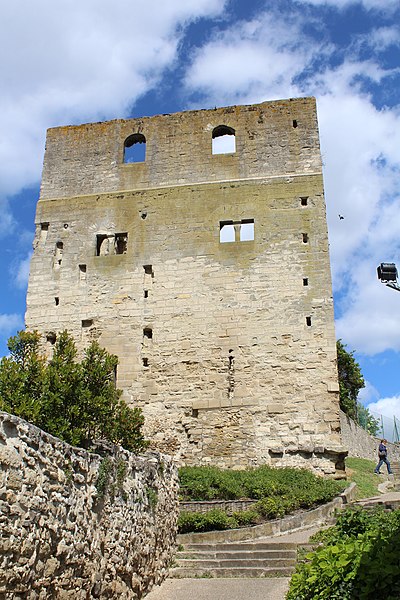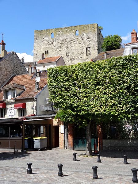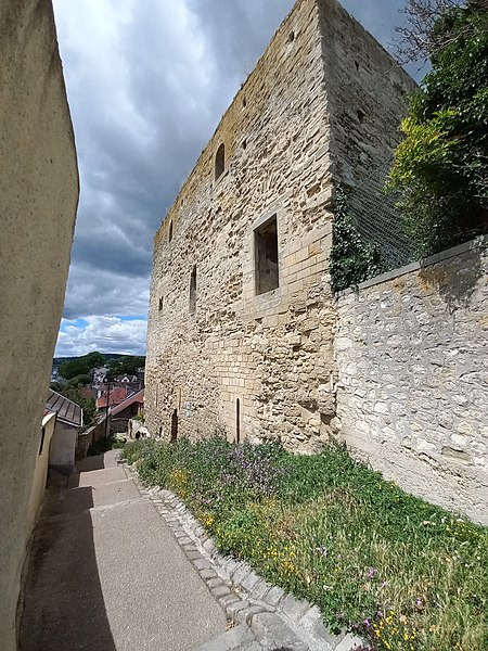La tour Montjoie, vestige de l'ancien château aujourd'hui en ruine, assurait à la fois des fonctions défensives et résidentielles. Construite autour de 1100 en blocs de calcaire, elle est souvent mentionnée dans les ouvrages consacrés à l'architecture militaire du Moyen Âge. Son nom, qui pourrait dériver de « Mons Jovis » (Mont de Jupiter), en fait un témoin précieux de la première génération des châteaux de pierre en Île‑de‑France. Ses origines demeurent obscures ; elle aurait peut‑être succédé à une fortification en bois. La datation, fondée sur des comparaisons régionales, situe sa construction à la fin du XIe ou au début du XIIe siècle. Elle pourrait avoir été élevée par le comte de Beaumont Matthieu 1er, peu après un violent conflit qui l'opposa à son beau‑frère Bouchard IV de Montmorency.