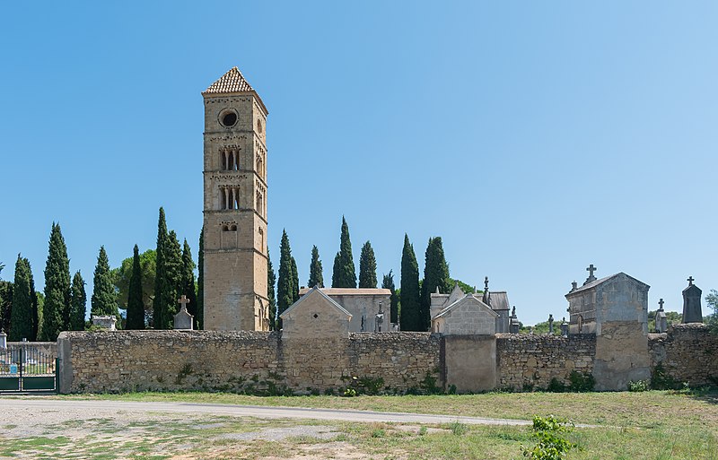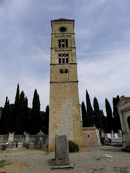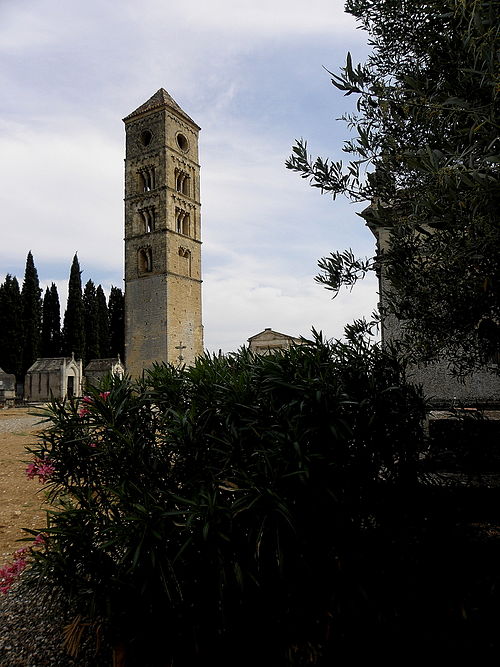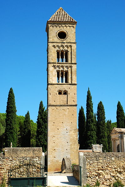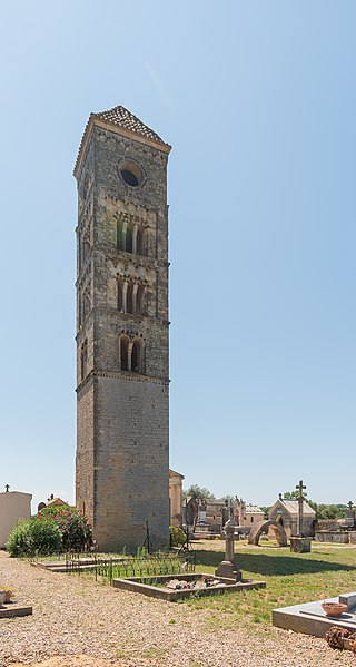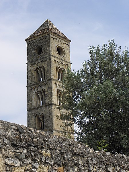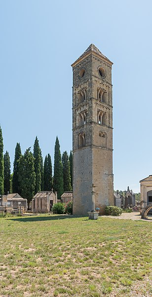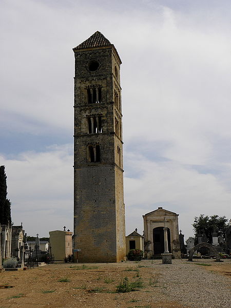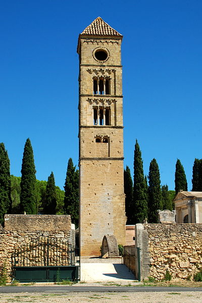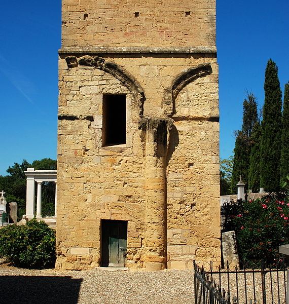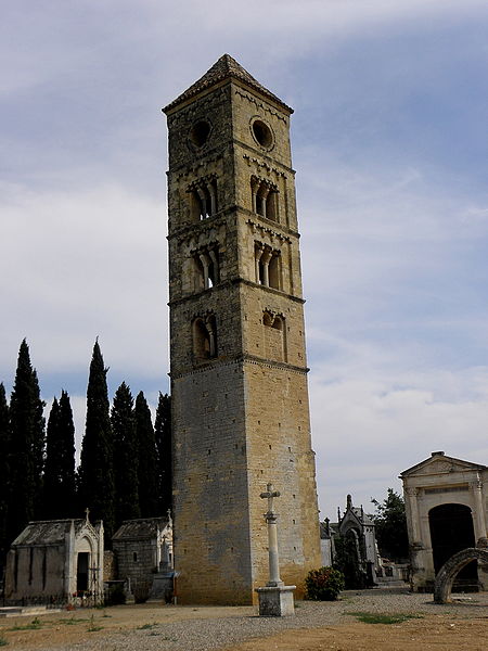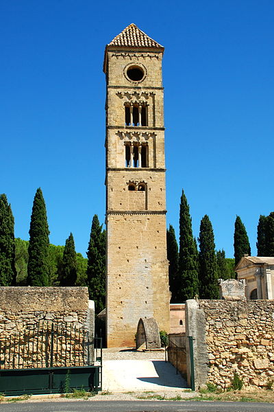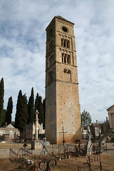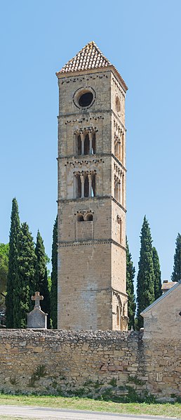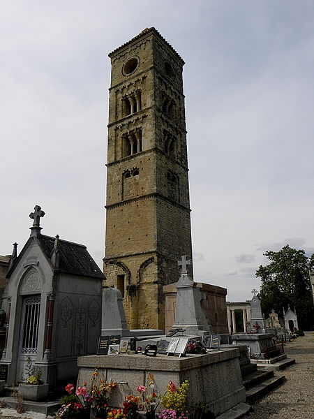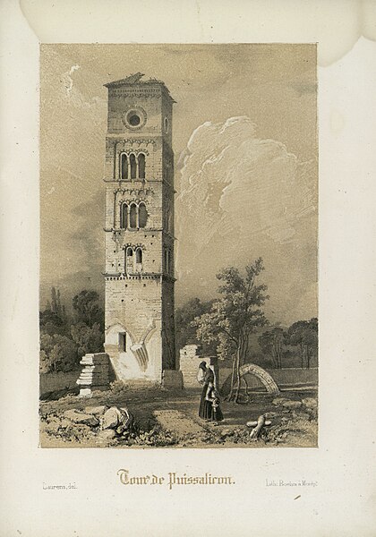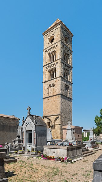 La tour romane de Puissalicon est un clocher de style roman lombard situé dans l'Hérault, en Occitanie, près du village de Puissalicon. Elle se dresse dans l'enceinte du cimetière communal, à environ 1 km à l'ouest du village, sur la route de Puimisson, non loin du Libron. De plan rectangulaire, la tour fut d'abord édifiée isolée avant d'être accolée à l'église du prieuré. Un petit prieuré bénédictin dépendant de l'abbaye de Villemagne-l'Argentière y fut implanté et la tour devint le clocher de l'église appelée Beati Stephano de Pedano ou Saint-Étienne-de-Pézan. Les moines avaient abandonné l'église avant 1232, comme l'atteste un acte de cette année prescrivant au recteur de Puissalicon d'y dire la messe les dimanches et jours de fête. Le prieuré fut détruit pendant les guerres de Religion et le terrain entourant la tour devint cimetière après la Révolution française. La tour est classée au titre des monuments historiques depuis 1862. Construite en pierre de taille rehaussée d'incrustations en basalte, elle présente un décor où le basalte souligne les baies par une alternance de cubes de lave et de blocs de calcaire. La maçonnerie montre à certains endroits, notamment à la base, des traces d'opus monspeliensis. Haute de 26 mètres et large de 4,30 mètres, elle comprend plusieurs niveaux séparés par des cordons de pierre et est couverte d'un toit de tuiles rouges. Le rez-de-chaussée, aveugle, porte encore les marques de l'église gothique aujourd'hui disparue qui lui était accolée. Au-dessus, un étage aveugle est couronné d'une frise de dents de scie en basalte. Un autre niveau présente des baies géminées partiellement murées dont les claveaux alternent pierre brune et basalte noir. Les niveaux supérieurs sont ornés de fenêtres triples à double ébrasement, inscrites dans des bandes lombardes et flanquées de colonnes à chapiteaux géométriques; les arcs et les arcatures conservent là encore des claveaux alternant bruns et noirs. Chaque face du dernier étage est percée d'un grand oculus entouré d'un cordon de basalte, surmonté d'une frise de sept arcatures dite Cordon de Charlemagne et d'une frise de dents d'engrenage en basalte. Les murs portent de nombreux trous de boulin témoignant des échafaudages. Il reste peu de l'église du prieuré: à l'ouest de la tour, entre celle-ci et l'entrée du cimetière, subsiste un fragment d'arc ogival du XIIe siècle orné de moulures et de pointes-de-diamant. Au rez-de-chaussée de la face sud, qui était accolée à l'église, on observe une colonne engagée, un chapiteau massif et le départ de deux arcs en plein cintre moulurés.