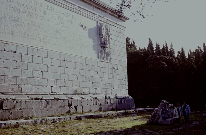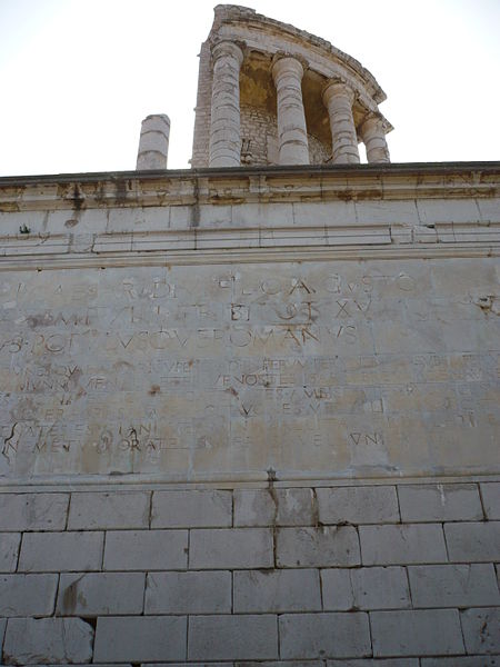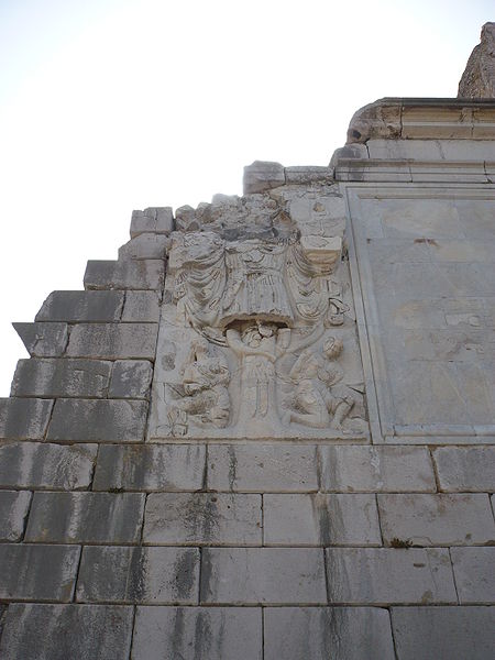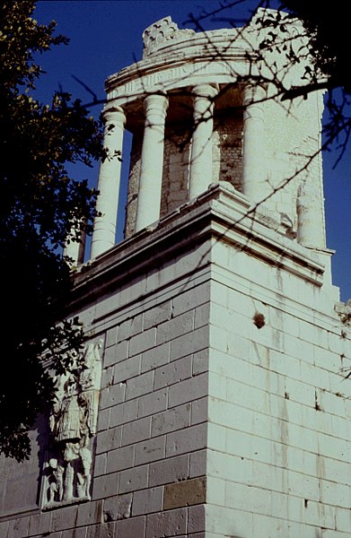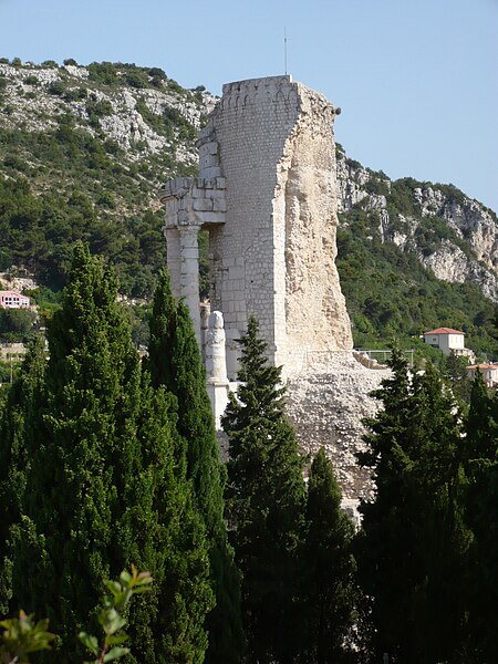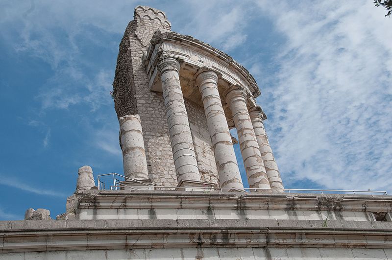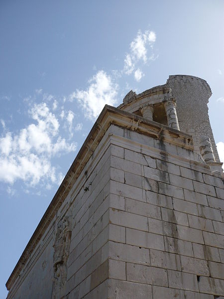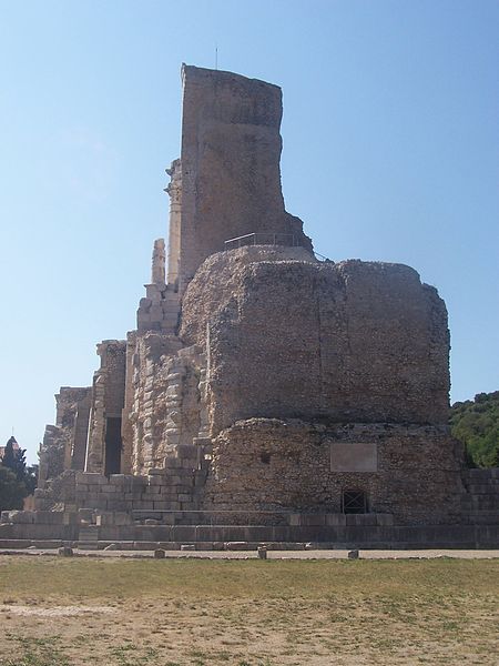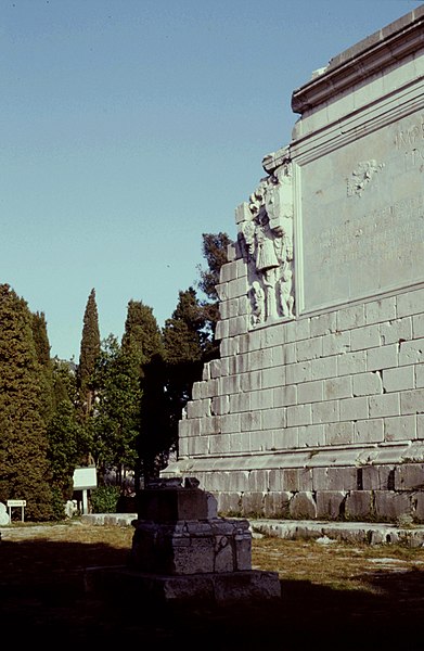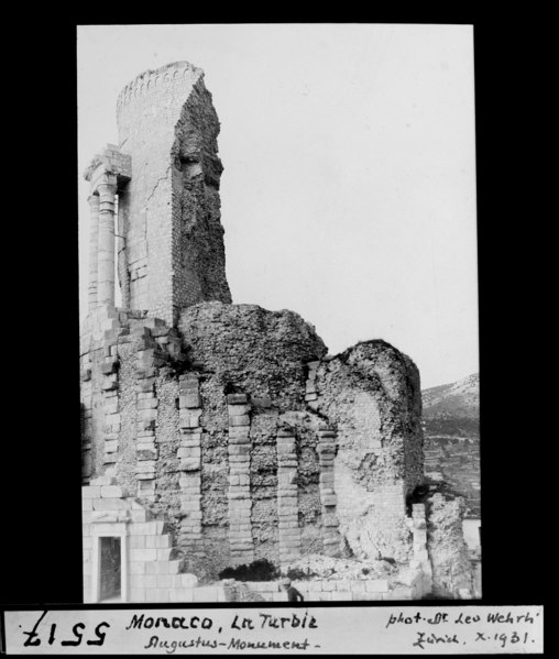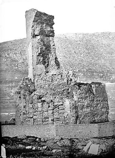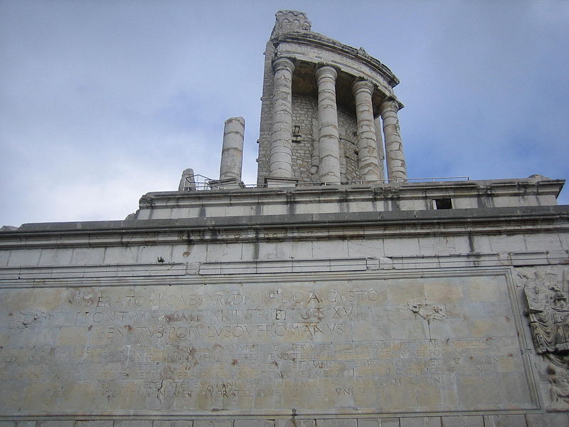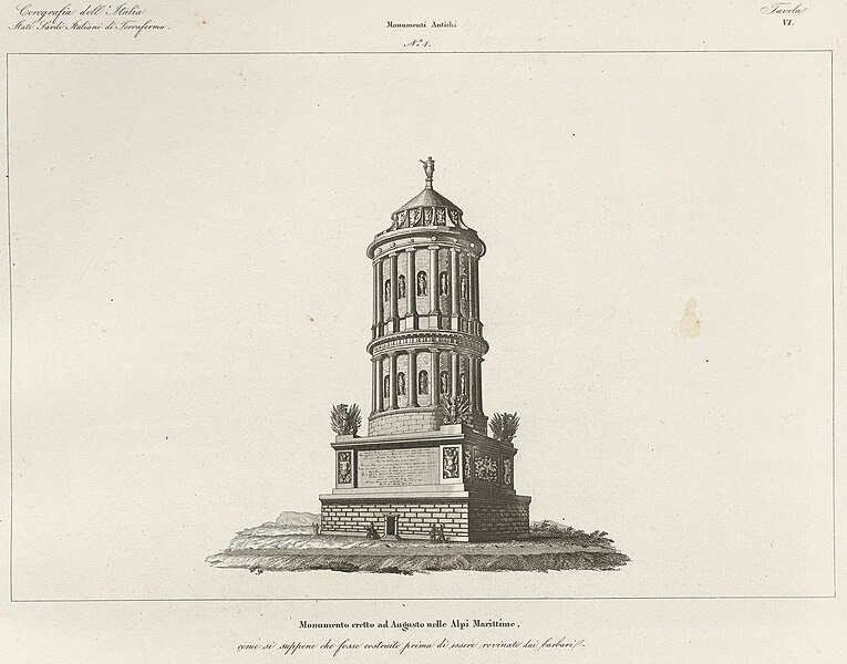 Le Trophée d'Auguste, dit trophée des Alpes, est un monument romain commémoratif en ruine situé à La Turbie, surplombant la principauté de Monaco ; son nom latin est Tropaeum Alpium. Érigé au point culminant de la via Julia Augusta, il célèbre la victoire d'Auguste sur quarante-quatre peuples alpins et la pacification des massifs entre la Narbonnaise et la Gaule cisalpine. Cette soumission a facilité l'ouverture et la sécurité de la via Aurelia prolongée par la via Julia Augusta et favorisé l'intégration de populations locales alliées à Rome, comme les Vediantes. Le monument n'avait pas de vocation militaire mais marquait la frontière entre l'Italie et la province narbonnaise ; néanmoins il fut transformé en forteresse entre le XIIe et le XVe siècle et des habitations furent intégrées à son enceinte. En 1705, Louis XIV fit partiellement démolir le Trophée lors des opérations contre la Savoie, et ses pierres furent réutilisées, notamment pour l'église Saint-Michel du vieux village. Classé au titre des monuments historiques en 1865, il a ensuite été restauré dans les années 1930 grâce au mécénat d'Edward Tuck ; les travaux dirigés par Jules Formigé aboutirent à son inauguration en 1934. Le monument constitue aujourd'hui l'attraction principale de La Turbie. La pierre calcaire employée pour sa construction provient d'une carrière romaine située à environ 500 mètres, où l'on observe encore des traces d'extraction et de découpe des colonnes. Le site conserve de nombreux vestiges romains : bornes milliaires et fontaines attribuées à l'Antiquité ont été retrouvées autour de la via Julia Augusta et sont visibles dans les musées de La Turbie et de Nice. Selon les architectes Formigé père et fils, la base principale mesurait 38 mètres de longueur, la première plate-forme atteignait 16 mètres de hauteur, la rotonde comptait vingt-quatre colonnes et la statue d'Auguste se dressait à 49 mètres ; le monument restauré culmine actuellement à 35 mètres. La construction fut achevée et dédiée en 7 ou 6 av. J.-C. Sur la façade ouest, côté via Julia Augusta, une inscription du Sénat dédie le monument à Auguste et énumère les quarante-quatre peuples alpins soumis, répartis de l'Orient à l'Occident de la chaîne. Pline l'Ancien a transmis la rédaction de cette dédicace et une traduction en donne la portée : le Sénat et le peuple de Rome reconnaissent qu'en vertu d'Auguste tous les peuples alpins ont été rangés sous la puissance romaine, puis énumèrent les peuples vaincus. La localisation précise de ces peuplades demeure souvent incertaine et fait encore l'objet de recherches, mais l'inscription constitue une source majeure pour reconstituer la géographie politique des Alpes à l'Antiquité. Le bimillénaire du Trophée a été commémoré en 1994 par le Centre des monuments nationaux, qui a présenté des créations contemporaines, un film sur l'histoire du monument et un spectacle lumineux.
