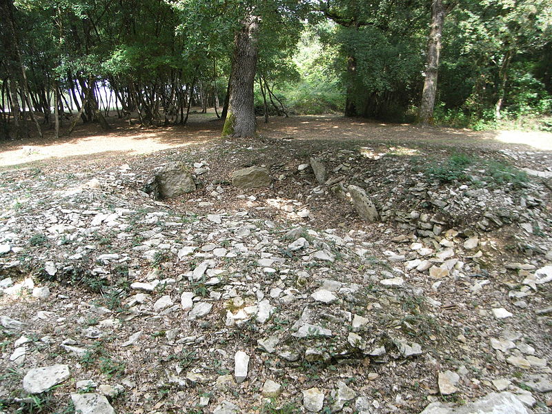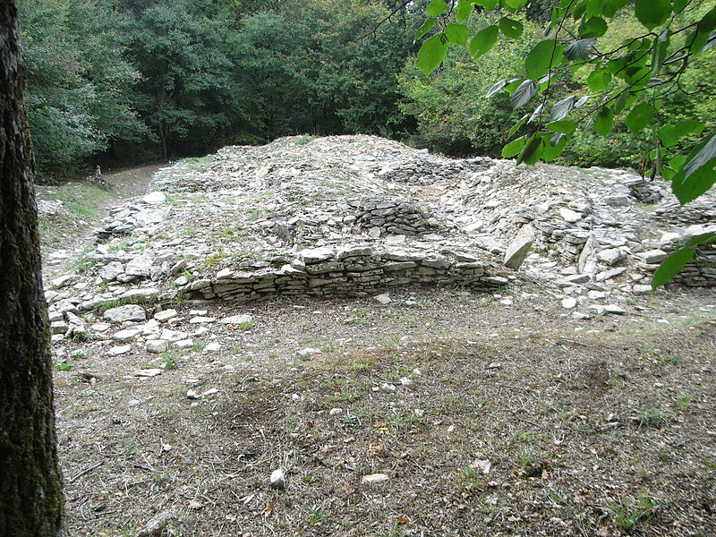 Le tumulus B, situé à environ 20 m à l’est du tumulus A, a la forme d’un trapèze très allongé d’environ 15 m de long pour 8 m de large côté est et 6,70 m côté ouest ; il renferme deux chambres quadrangulaires, B1 et B2, chacune placée dans son propre cairn circulaire, signe d’une construction en deux temps, et devait atteindre à l’origine 2,50 à 3 m de hauteur. La chambre B1 est enfermée dans un cairn de 8,60 m de diamètre à double parement ; l’accès se faisait par un couloir désaxé ouvrant au sud, long d’environ 3 m et large de 0,8 à 1 m, avec un dallage sommaire en opus incertum ; la chambre rectangulaire mesure 2,60 m sur 2,30 m, ses côtés alternant petits orthostates et murets en pierres sèches, et le sol est dallé de plaquettes calcaires ; la couverture devait être réalisée par encorbellement. L’étude des dents retrouvées (131) indique la présence de sept à huit individus, dont deux enfants, et une datation radiocarbone place leur dépôt entre 4336 et 4005 av. J.-C. Le mobilier est limité : deux armatures de flèches tranchantes, un fragment pouvant être une aiguille ou une épingle en os, et des tessons de deux coupes à socle décorées trouvés à l’extérieur de la chambre.