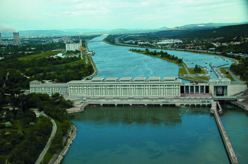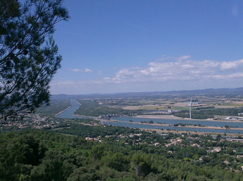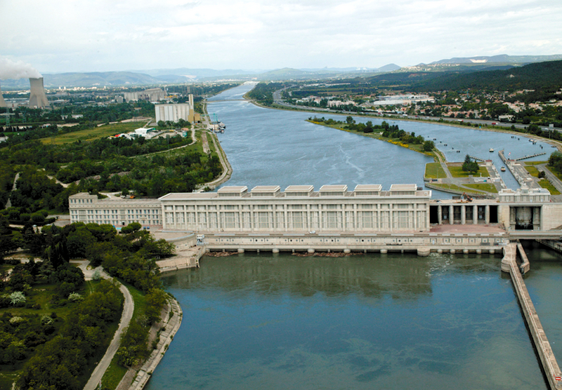 Construit entre 1948 et 1952 à Bollène (Vaucluse) sur le canal de Donzère-Mondragon, l'usine-barrage André-Blondel repose sur un mur-barrage implanté sur une dérivation du Rhône longue de 28 km entre Donzère et Mondragon. La centrale, dédiée au physicien André Blondel, comporte six groupes turbines-alternateurs pour une puissance installée de 348 MW et une production annuelle d'environ 2 140 GWh. Chaque alternateur, d'une capacité de 59 MW, est entraîné par une turbine Kaplan ; le débit maximum turbinable est de 1 980 m3/s. La tension de sortie des alternateurs est de 10 500 V, relevée à 220 000 V par les transformateurs de la Compagnie nationale du Rhône (CNR). Cette installation est la plus productive du Rhône et fournit environ 13 % de la production hydroélectrique de la CNR, soit presque la consommation annuelle de la ville de Lyon. L'architecte Théodore Sardnal, élève des frères Perret, a dessiné la salle des machines ; l'élévation en béton armé est rythmée par des piliers et des claustras vitrées. La centrale figure parmi les premiers grands chantiers industriels de la IVe République et constitue un témoignage de l'histoire technique et architecturale de l'immédiat après-guerre. Le barrage comprend une écluse, côté rive droite, permettant le passage des bateaux ; la hauteur entre l'aval et l'amont de cette écluse est de 23 mètres, la plus grande de France. Une passe à poissons a été aménagée pour assurer la libre circulation de la faune du Rhône dans les deux sens. La centrale a été inaugurée le 25 octobre 1952 et inscrite au titre des Monuments historiques le 4 juin 1992. Le 2 février 1998, à 12 h 45, un accident a provoqué une vague dans l'écluse de Bollène : alors qu'une péniche, l'Arlate (1 200 t), était dans le sas, la porte amont s'est brusquement ouverte, entraînant une déferlante ; le couple de mariniers a été emporté, la femme s'est noyée et le bateau a coulé, la porte aval ayant résisté au choc. À titre de comparaison, les centrales nucléaires de Cruas et du Tricastin, situées en amont sur le Rhône, disposent chacune de quatre tranches de 900 MW, soit 3 600 MW au total, contre les 348 MW de la centrale hydroélectrique de Donzère-Mondragon.