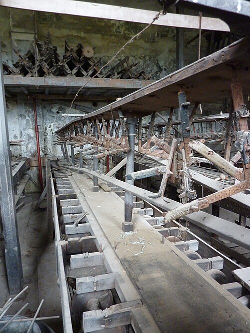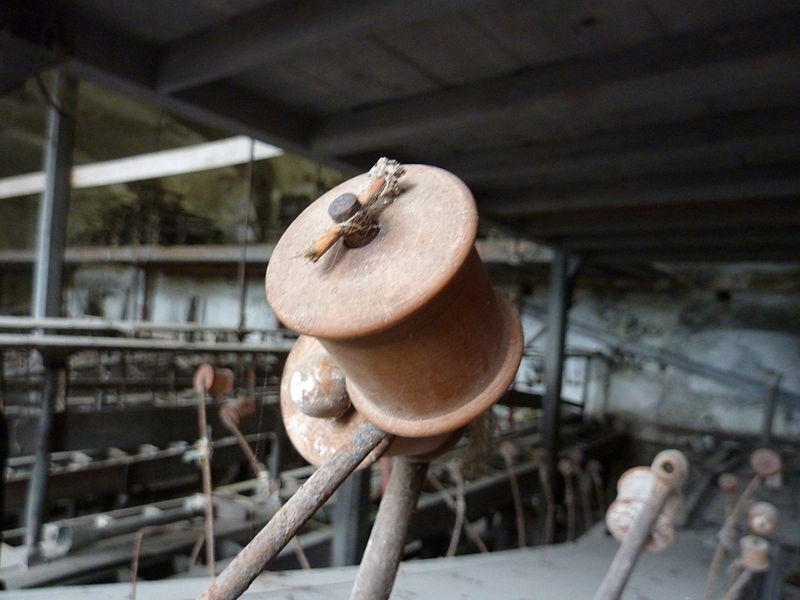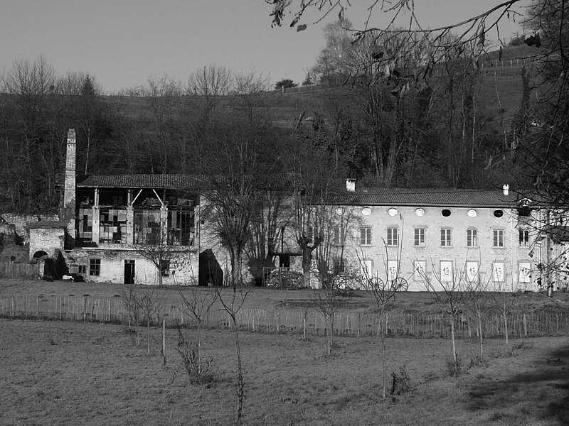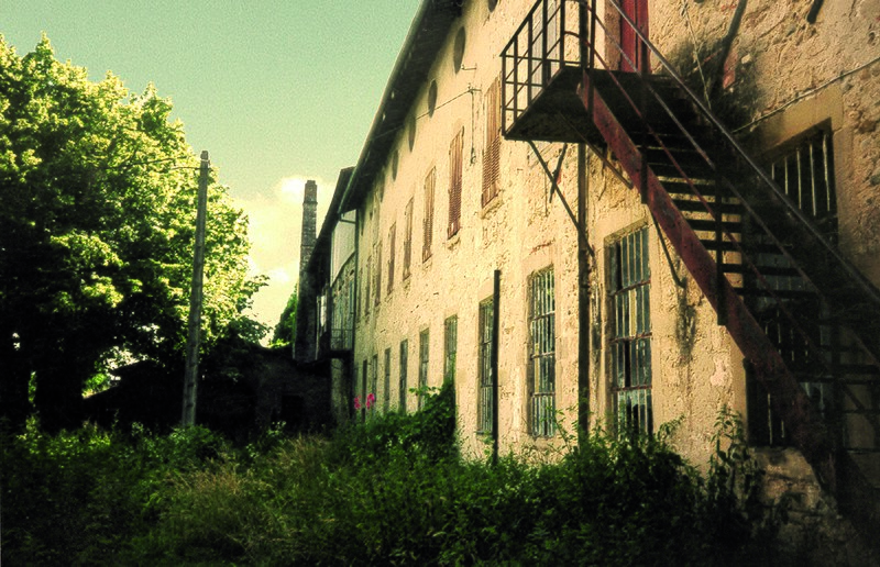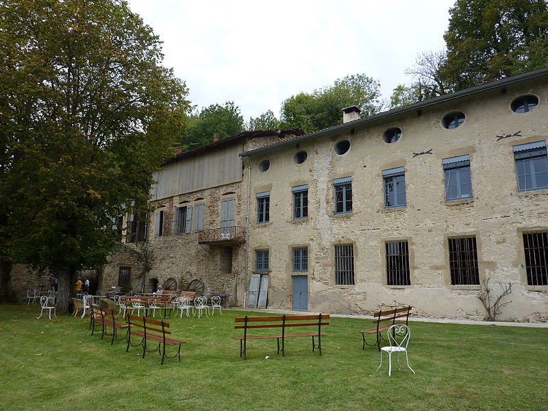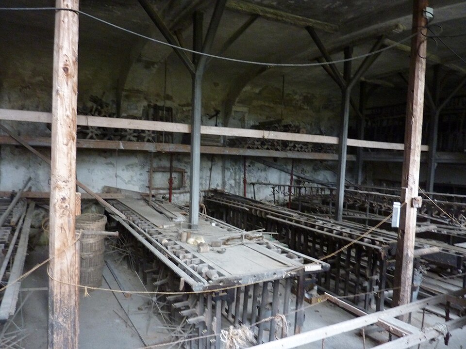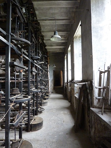 La filature, adossée à la Fabrique Haute, se repère à sa haute cheminée en tuf et à sa façade largement vitrée ; la verrière assurait l'éclairage naturel et, au‑dessus des baies, un store intérieur en tissu mouillé permettait de maintenir une atmosphère fraîche et humide pour le tirage du fil. Les deux salles d'ouvraison, consacrées au dévidage et au moulinage, exigent des conditions de température et d'hygrométrie strictes ; grâce à l'épaisseur des murs et à la situation semi‑enterrée, l'atelier présente une forte inertie thermique et se chauffait au besoin avec des poêles à charbon. La salle de dévidage de la Fabrique Haute, voûtée et badigeonnée en blanc, autorisait l'installation de banques supplémentaires sur une tribune accessible par un escalier en bois, tandis que le contremaître disposait d'un accès direct à la tribune depuis son bureau.