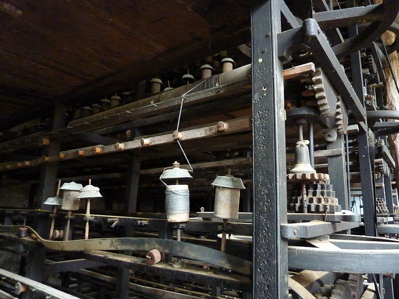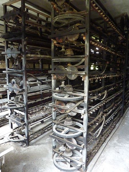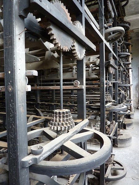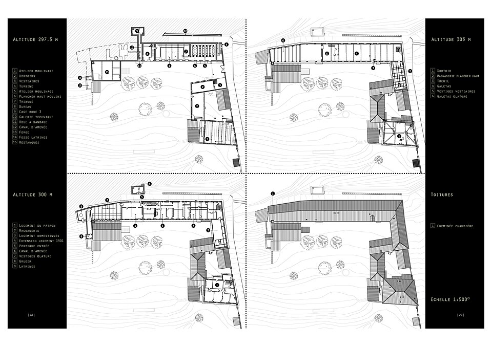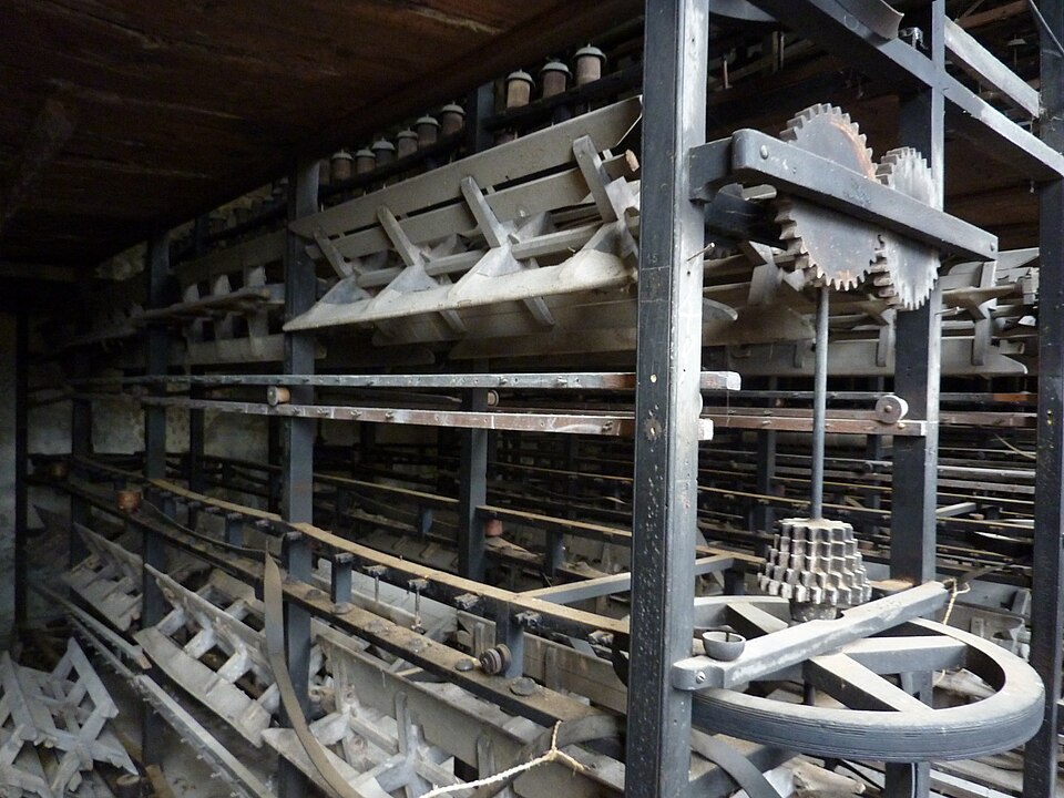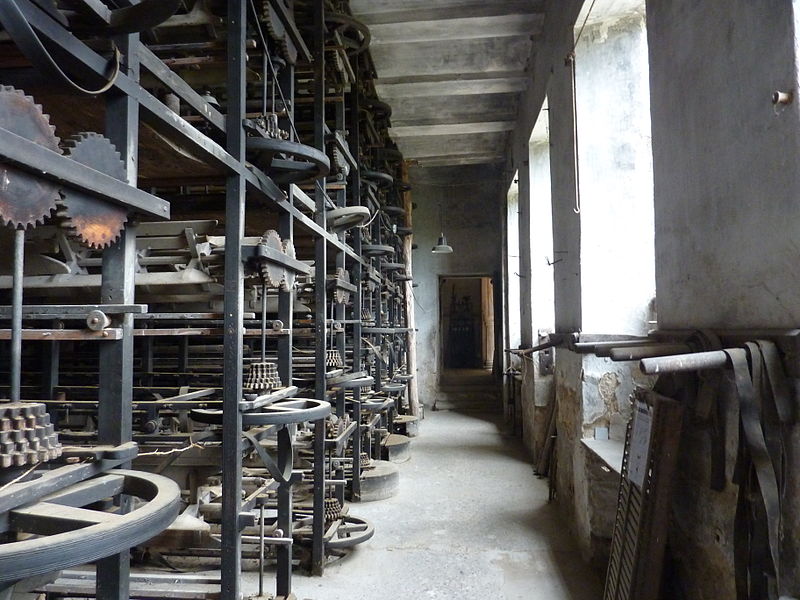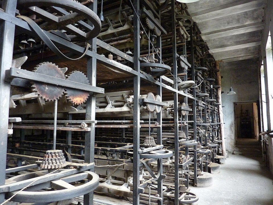 Dans la Fabrique Haute, les deux salles successives d'ouvraison mesurent 8 × 28 m au sol, sont entièrement occupées par les machines et communiquent avec un dégagement latéral de 1,20 m le long des baies orientées à l'est ; un caniveau technique et un arbre de transmission courent le long de la façade ouest aveugle pour alimenter les ateliers. Les moulins, optimisés pour le volume disponible, sont larges de 5,57 m et hauts de 4,80 m, reliés par paires par un palier en bois où travaillaient les moulinières ; leur plafond plat en poutres et voûtains de brique participe à la rationalisation de l'espace. Dans la Fabrique Basse, le moulinage et le dévidage s'organisent sur deux étages séparés par un plancher en bois ; les moulins plus encombrants, hauts de 3,50 m et longs de 7,36 m, occupent le rez‑de‑chaussée et sont pourvus d'une nacelle coulissante pour accéder à leur sommet, tandis que la roue hydraulique reste implantée à proximité des machines les plus consommatrices d'énergie.