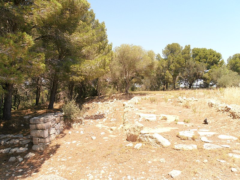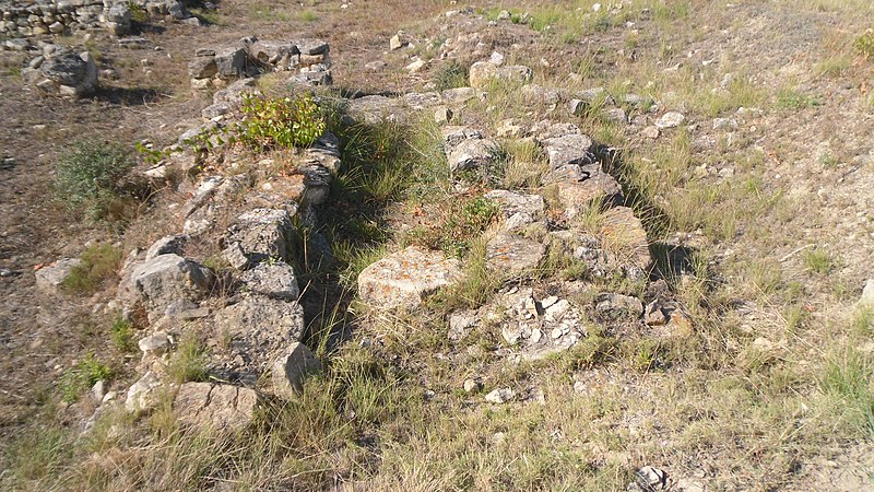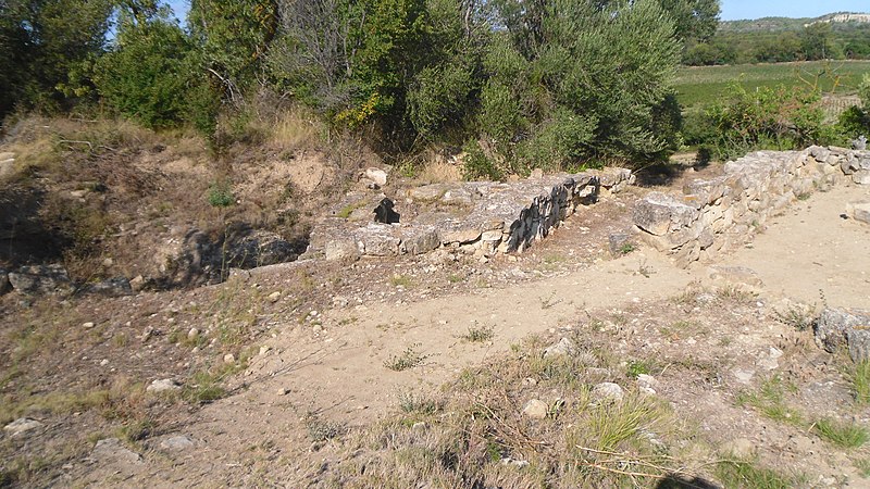 L’oppidum correspond au type de l’éperon barré et était protégé sur le versant sud par une succession de remparts, fossés et lignes défensives combinant appareil rustique et techniques d’inspiration hellénique. Le fossé, aménagé dès le VIe siècle av. J.-C., mesure 20 à 28 m de largeur pour une profondeur maximale de 4 m et comporte à l’est des alignements de pierres plantées en quinconce formant un dispositif défensif remarquable. Le rempart principal, adossé à la colline et daté du VIe siècle av. J.-C., conserve une courtine de 14 m haute de 4,70 m, flanquée de deux tours massives et accompagnée de traces de rites de consécration gravés sur l’assise inférieure. La porte charretière ouest, ouverte sur 7,80 × 3 m, était dotée d’une double porte en bois pivotant sur gonds de fer ; de grands blocs calcaires montrent crapaudines et traces d’usure liées au passage des roues.