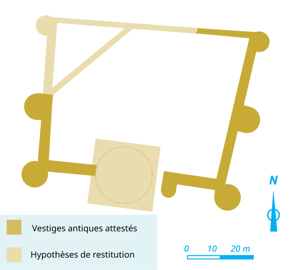 Le plan du castellum est un trapèze irrégulier aux dimensions intérieures de 66 × 50 m, soit environ 3 150 m2 ; la grande base de 66 m est tournée vers le nord, presque à l’aplomb du coteau, et la petite base orientée au sud mesure 60 m. L’accès principal s’ouvre dans la muraille sud ; Jason Wood a proposé l’hypothèse d’une porte plus étroite dans la courtine occidentale, flanquée d’une tour intermédiaire. Seuls les côtés sud et est peuvent être intégralement restitués, la face ouest n’étant connue que sur la moitié de sa longueur et l’élévation du mur nord n’ayant jamais été mise en évidence, ce qui laisse ouverte l’idée d’un plan originel partiellement inachevé.