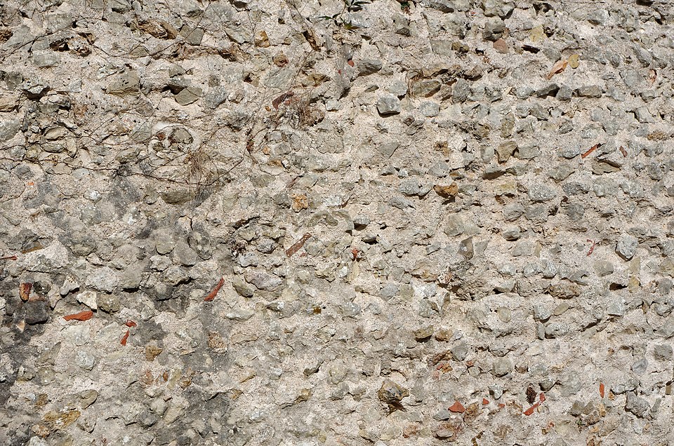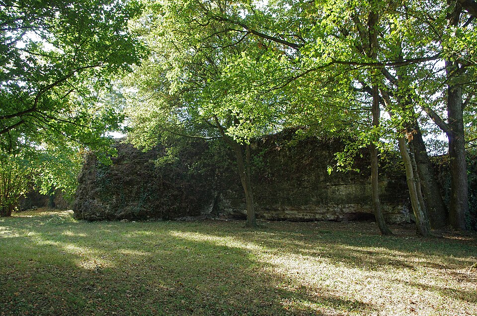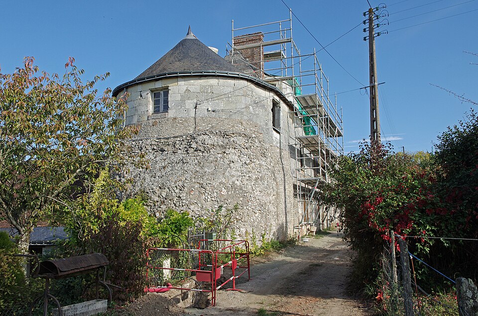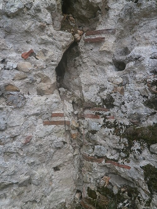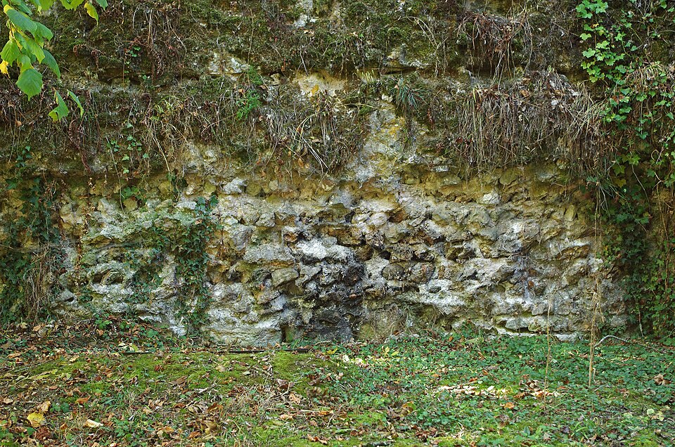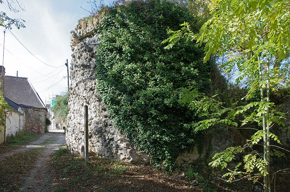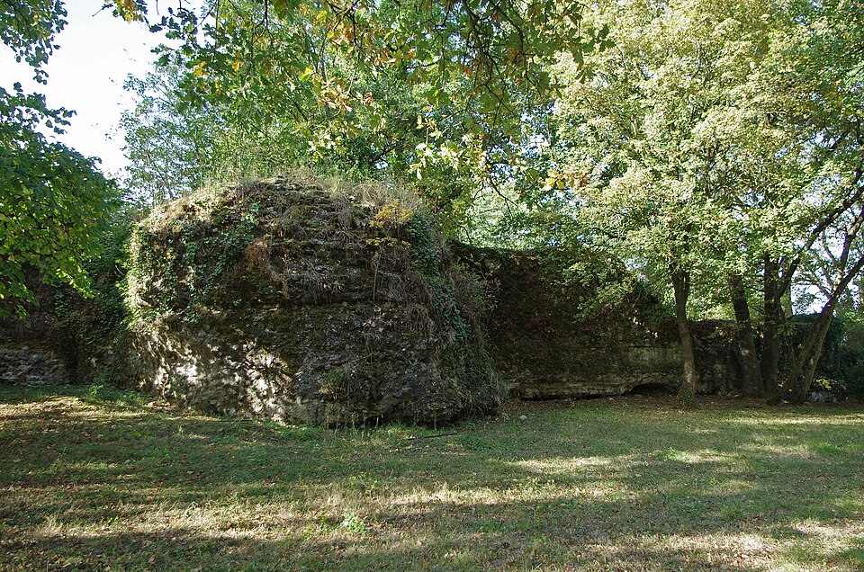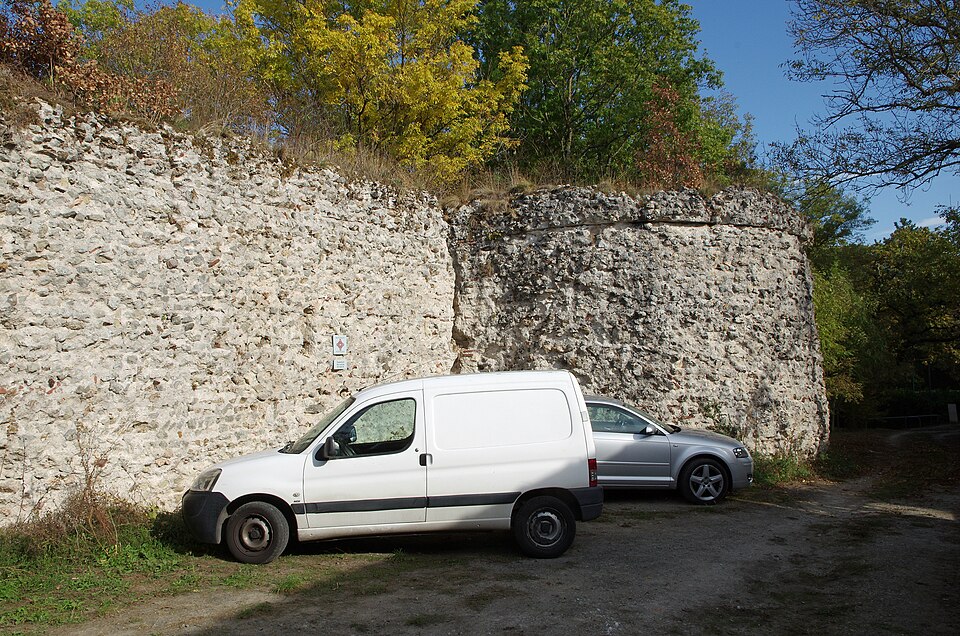 Sur la majeure partie de son périmètre, l’élévation repose sur des aménagements de fondation sommaires plutôt que sur des tranchées maçonnées : lits de pierres sèches, couches d’argile compactée et blocs de réglage en tuffeau, meulière ou calcaire constituent la base des murs. Des éléments de remploi, parmi lesquels des tronçons de fûts de colonnes coupés dans la longueur et des blocs sculptés, ont été incorporés dans les fondations ou retrouvés lors de creusements ultérieurs. La courtine, large de 4,20 m au sud, 3,50 m sur les flancs et 2,20 m au nord, combine deux parements en petit appareil alternant avec des lits de terres cuites architecturales et un noyau de blocage noyé dans un mortier à la chaux ; le parement d’origine n’est conservé que par endroits, notamment sur la face intérieure.
