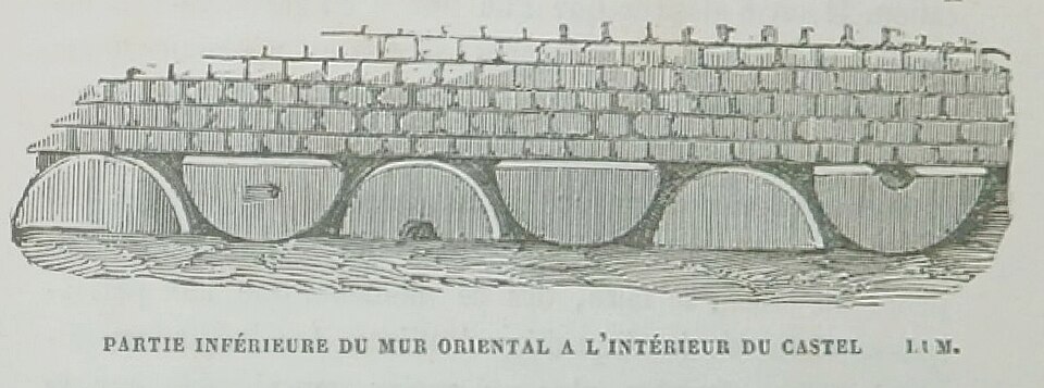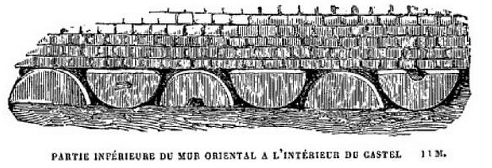 Les fouilles menées entre 1984 et 1987 ont mis au jour, au niveau de la muraille sud, un podium carré surmonté de l’amorce d’une rotonde de quinze mètres de diamètre entourée d’une colonnade, interprétée comme un mausolée monumental antérieur au fortin. Un autre bâtiment, interne au fort et situé à l’ouest, semble contemporain du mausolée ; le mobilier archéologique, réduit, suggère une occupation au Ier ou IIe siècle pour cet ensemble. Lors de l’édification du castellum, le mausolée a été en partie démonté et certains éléments, colonnes ou blocs sculptés, ont été repris dans les fondations et les premières assises ; dans l’hypothèse d’un démontage partiel, une portion de la rotonde aurait été intégrée à la muraille sud, auquel cas l’entrée du fortin se trouverait à l’est de ce bastion. La construction du castellum, datée de la seconde moitié du IIIe siècle et peut‑être située entre 256 et 270, s’inscrit dans le contexte de la crise du IIIe siècle et d’un probable programme de défense régionale visant à sécuriser voies et communication. L’édifice n’a toutefois jamais été complètement achevé et il est abandonné à la fin de l’Antiquité ; Louis Boilleau a attribué sa destruction aux incursions des Bagaudes, thèse défendue au XIXe siècle.