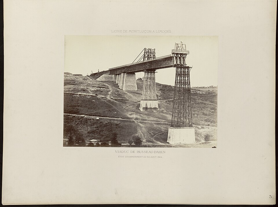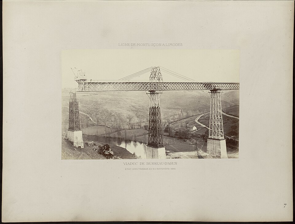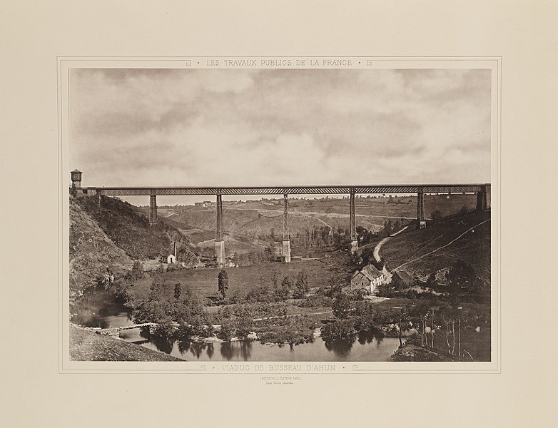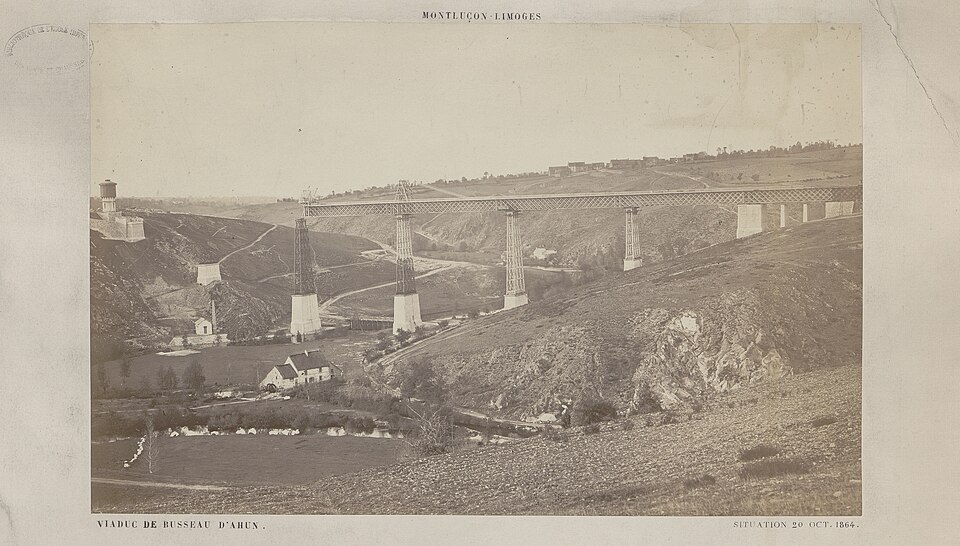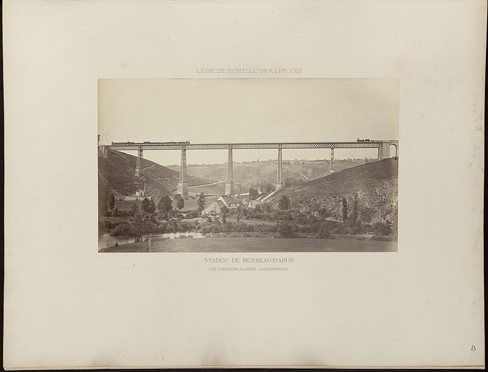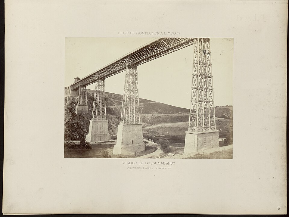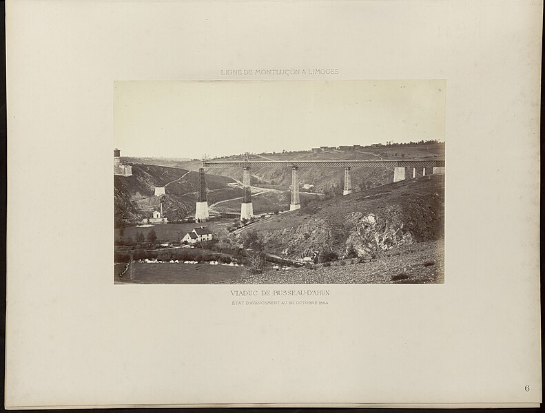 Le viaduc de Busseau-sur-Creuse est un pont ferroviaire métallique situé sur les communes d'Ahun, de Pionnat et de Cressat, dans le département de la Creuse, en région Nouvelle-Aquitaine, à la sortie est de la gare de Busseau-sur-Creuse. Souvent attribué à tort à Gustave Eiffel, il domine la Creuse et mesure 320 m de longueur pour une hauteur maximale de 56,50 m. Il a été construit entre décembre 1863 et décembre 1864 ; le chantier a commencé en janvier 1864 et s'est déroulé sous la direction de Félix Moreaux. L'ouvrage a été réalisé par un consortium formé par Basile Parent, Pierre Schaken, Jules-César Houel, Ferdinand Caillet et les Établissements Jean-François Cail, sur un projet établi par Marie Thirion, Wilhelm Nördling et Charles Geoffroy, ingénieurs de la Compagnie d'Orléans. Nördling, qui a suivi le projet de près, avait précédemment participé à la commission internationale pour le viaduc de Grandfey, et le recours aux piles en treillis métalliques s'inscrit dans une évolution déjà matérialisée sur des ouvrages tels que les viaducs de Crumlin, de Fribourg et le viaduc de Portage aux États‑Unis. Face à la nécessité de franchir une brèche de 338 m entre culées avec des piles de 57 m, la Compagnie d'Orléans a choisi la solution métallique, moins coûteuse que la maçonnerie, après l'exemple de Fribourg. Pour assurer la stabilité au vent transversal, des barres d'ancrage ont été placées à l'intérieur des colonnes des piles et ancrées dans les maçonneries de base et la fondation ; la hauteur de la partie métallique des piles a été limitée à 30 m sous le tablier par prudence vis‑à‑vis de l'emploi de la fonte, les soubassements et fondations étant en maçonnerie. Pour améliorer l'aspect de l'ouvrage et éviter les arbalétriers disgracieux apparus sur d'autres viaducs, une maquette a été réalisée ; elle a conduit à éviter les surfaces gauches et à positionner deux arbalétriers quelconques dans un même plan plutôt qu'à l'intérieur des piles. Le tablier, monté sur appuis à rouleaux embiellés aux piles d'extrémité et aux culées pour permettre la dilatation, repose sur appuis fixes pour les autres piles ; la dilatation est également rendue possible par la souplesse des piles. Le tablier a été mis en place par lançage, procédé consistant à construire les travées sur une rive puis à les pousser successivement en position, méthode déjà employée en Europe pour le viaduc de Fribourg par l'ingénieur Ferdinand Mathieu. Le coût de l'ouvrage s'est élevé à 1 514 989 francs, pour un prix estimé à 1 453 500 francs. La ligne entre Busseau-sur-Creuse et Saint-Sulpice-Laurière a été ouverte jusqu'à la gare de Busseau-sur-Creuse en novembre 1864 et la mise en service de sections successives a permis la circulation d'un premier train après l'achèvement du montage du tablier ; la ligne Montluçon–Saint‑Sulpice‑Laurière a été ouverte dans sa totalité en février 1865. En 1905 le viaduc a reçu un platelage en béton armé et les piles ont été réparées en 1944–1945 pour réparer des dommages de guerre. Conçu initialement pour deux voies avec un tablier à quatre poutres, il est aujourd'hui utilisé en voie unique ; immédiatement après le viaduc, la bifurcation vers la ligne de Busseau-sur-Creuse à Ussel se sépare de la ligne de Montluçon à Saint‑Sulpice‑Laurière. Le pont a été inscrit au titre des monuments historiques le 15 janvier 1975. Les dimensions principales indiquent une longueur totale du tablier métallique de 286,50 m répartie en six travées dont les portées sont de 45,25 m, quatre travées de 50,00 m et 41,25 m ; la largeur du tablier est de 8 m, la hauteur des poutres métalliques de 4,50 m et la hauteur maximale de l'ouvrage de 56,50 m. La hauteur totale maximale entre le dessus du soubassement en maçonnerie et les rails est de 38,90 m, le soubassement présente des hauteurs de 12,00 m et 5,60 m, et sa largeur au niveau de l'appui de la partie métallique est de 12,60 m ; la partie métallique est traversée par sept niveaux de triangulation espacés de 4,50 m et le tablier est encadré par deux culées en maçonnerie de 36,20 m et 16,00 m.
