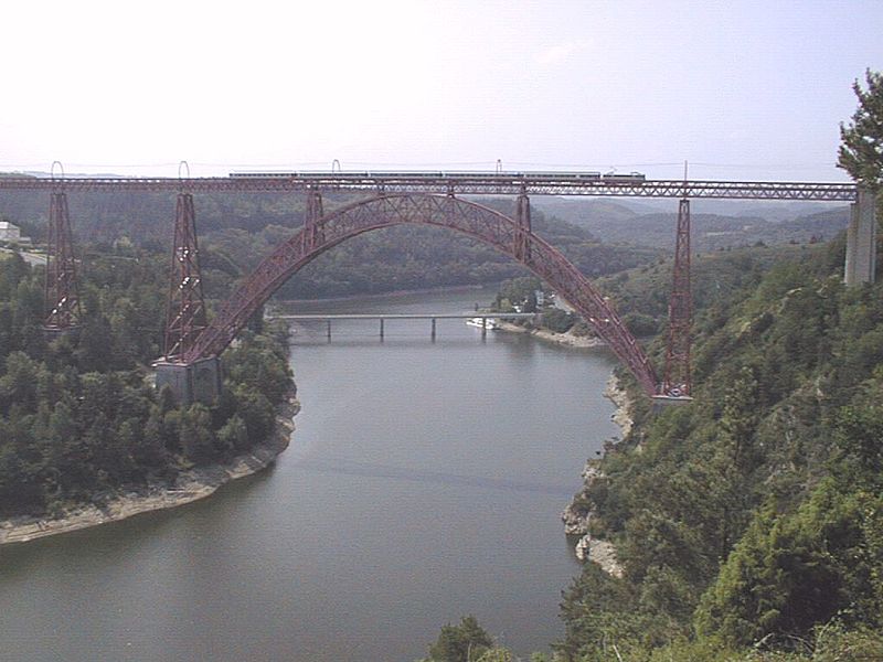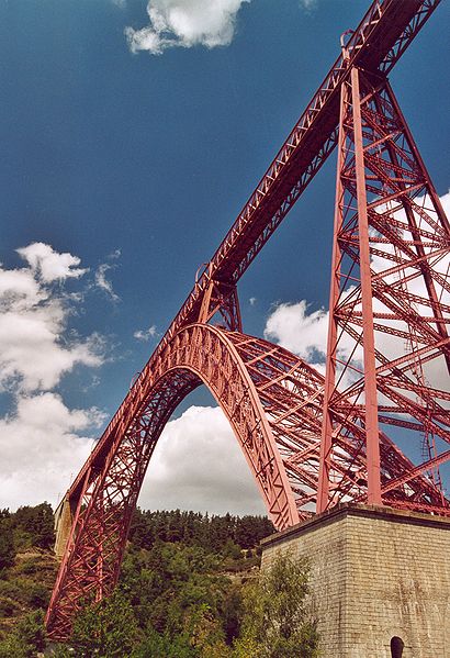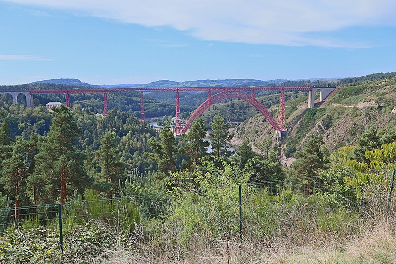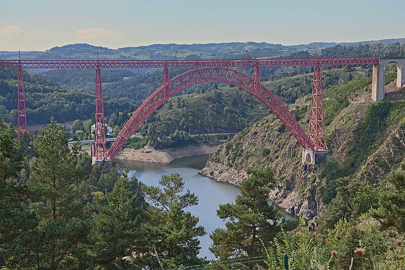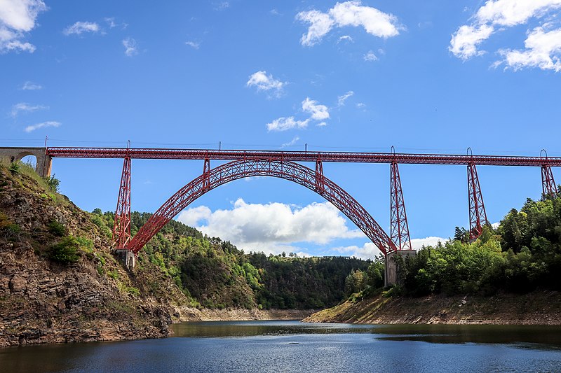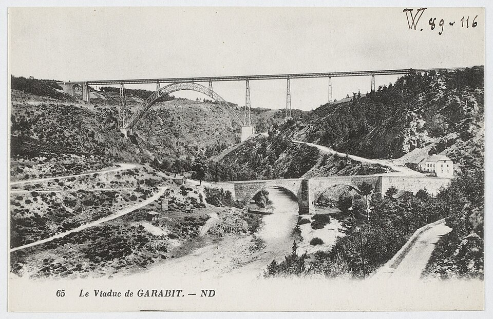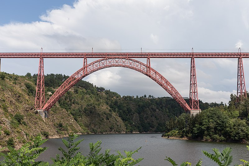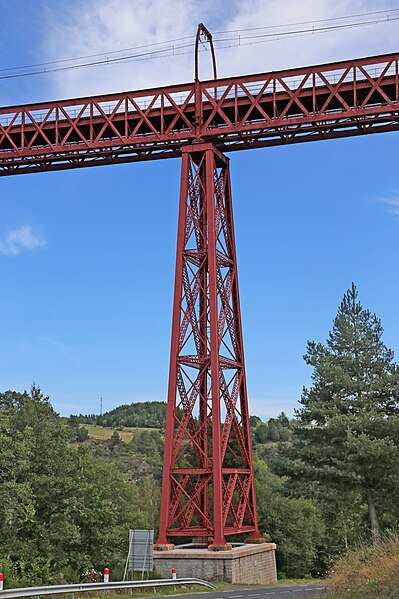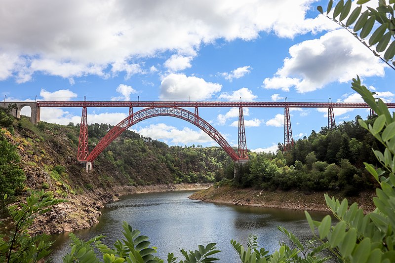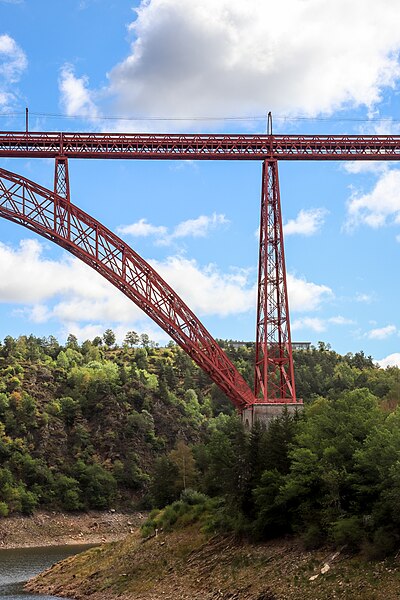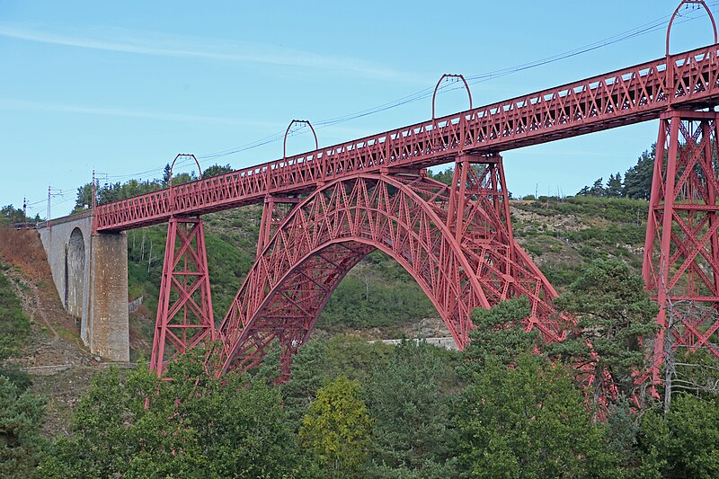 Le viaduc de Garabit est un pont ferroviaire franchissant les gorges de la Truyère sur la ligne de Béziers à Neussargues, situé sur les communes de Ruynes-en-Margeride et de Val d'Arcomie dans le Cantal, en Auvergne-Rhône-Alpes. Le projet initial est dû à l'ingénieur des ponts Léon Boyer, qui impose un tracé direct sur les plateaux et un franchissement à grande hauteur plutôt que la descente dans les vallées. La finalisation et la réalisation sont confiées à Gustave Eiffel et à sa société, avec la participation d'ingénieurs tels que Théophile Seyrig puis Maurice Koechlin. Les travaux de fondations commencent en janvier 1880; le chantier s'achève en septembre 1884 et la mise en service intervient en 1888. L'ouvrage, d'une longueur d'environ 565 m, culmine à près de 122 m au-dessus de la Truyère et comportait, à sa construction, l'une des plus grandes arches du monde, d'une portée de 165 m. Le tablier métallique mesure 554,69 m et repose sur sept piles en fer puddlé, dont deux atteignent 80 m de hauteur; cinq piles indépendantes s'appuient sur des blocs de fondation en maçonnerie. Trois travées forment l'arc principal au-dessus de la partie la plus basse de la vallée, et la superstructure est encadrée par deux estacades d'accès en maçonnerie de 46 m et 71 m. La hauteur d'origine au-dessus de l'étiage était de 122,5 m; après la construction du barrage de Grandval en 1959 et la formation du lac de retenue, le viaduc surplombe désormais le plan d'eau d'environ 95 m. L'ouvrage supporte une voie ferrée unique équipée d'une caténaire et a été conçu pour la circulation du trafic reliant Paris à Béziers par le Massif central. La ligne a été électrifiée en 1932 en 1 500 volts continu. Pour limiter les sollicitations, la vitesse des trains y est restreinte, avec une limitation générale à 40 km/h et une restriction à 10 km/h appliquée lors de la réouverture partielle en octobre 2009 après la découverte d'une fissure en septembre 2009. Les matériaux employés comprennent 3 169 tonnes de fer forgé, 41 tonnes d'acier et 23 tonnes de fonte; 678 768 rivets ont été posés et le volume de maçonnerie des fondations et des estacades atteint 20 370 m3. Le viaduc a fait l'objet d'une inscription au titre des Monuments historiques le 14 septembre 1965, puis d'un classement le 18 octobre 2017. Il a été repeint en rouge entre 1992 et 1998, a été temporairement fermé en septembre 2009 pour contrôle puis rouvert un mois plus tard avec des restrictions de vitesse, et a fait l'objet de travaux d'entretien importants en 2011. Il est éclairé certains soirs depuis 2001. Le viaduc a inspiré des réalisations culturelles et médiatiques: il apparaît dans plusieurs films, parmi lesquels L'Enfer d'Henri-Georges Clouzot (1964), Un homme de trop de Costa-Gavras (1967), Le Pont de Cassandra (1976) et Camping 2 (2010), figure sur un billet de 200 francs consacré à Gustave Eiffel et a été reproduit sur un timbre en 1952. Une maquette est exposée à France Miniature et de nombreuses publications et études lui ont été consacrées. L'inauguration de la section de Saint-Chély à Saint-Flour via le viaduc a eu lieu le 28 mai 1888, et des essais en charge ont été effectués le 10 avril 1888. Le viaduc a longtemps été traversé par l'Aubrac Express, surnom du train qui a contribué à sa notoriété locale. Le site constitue un repère majeur dans le paysage des gorges de la Truyère et demeure un ouvrage emblématique de l'ingénierie métallique du XIXe siècle.