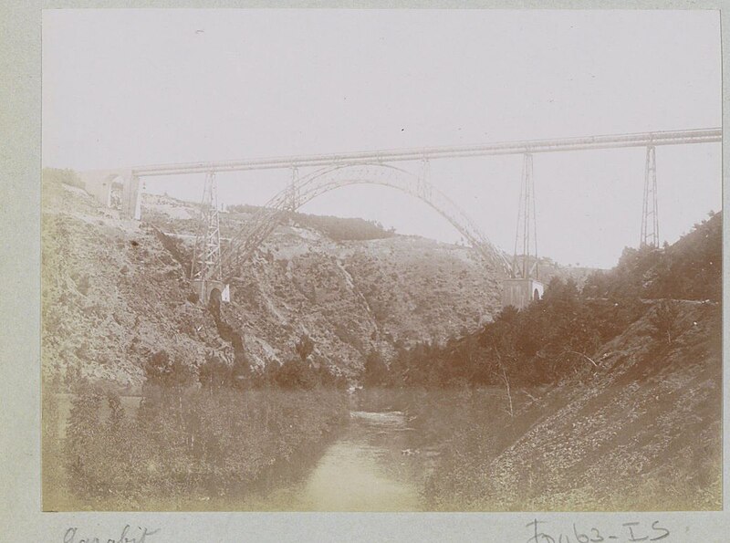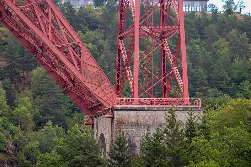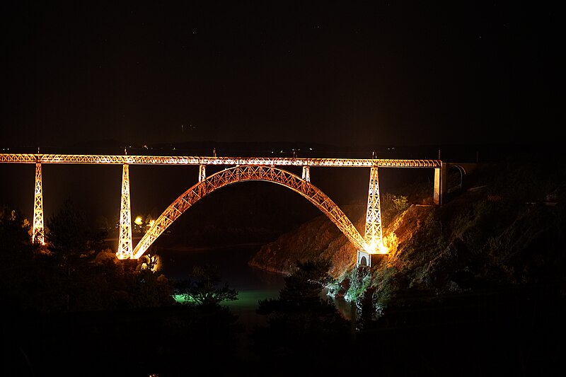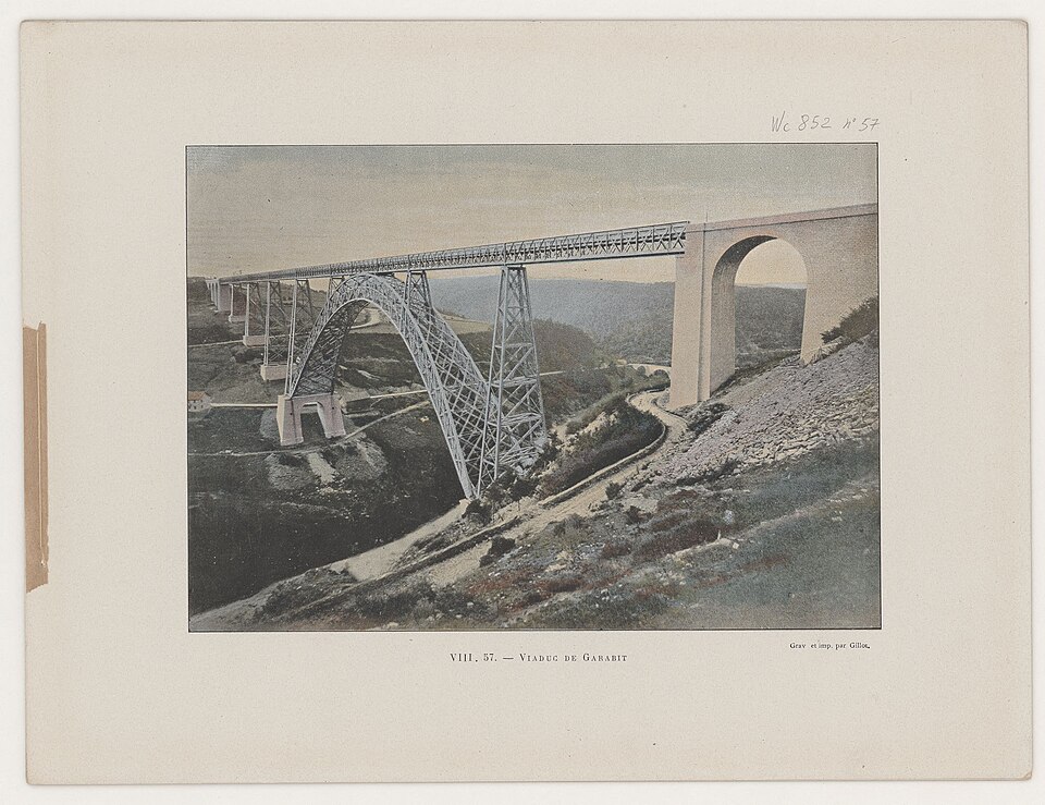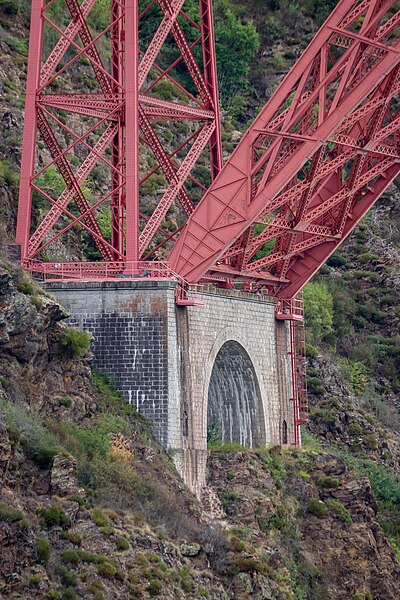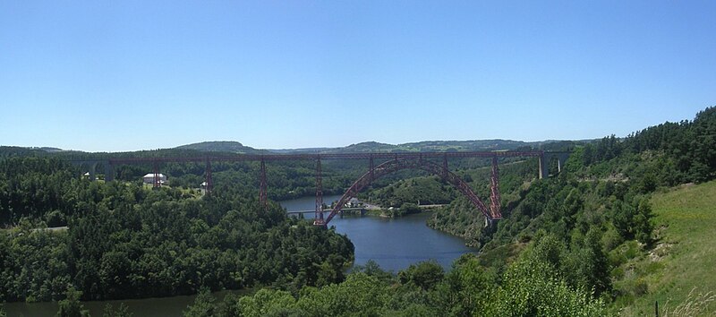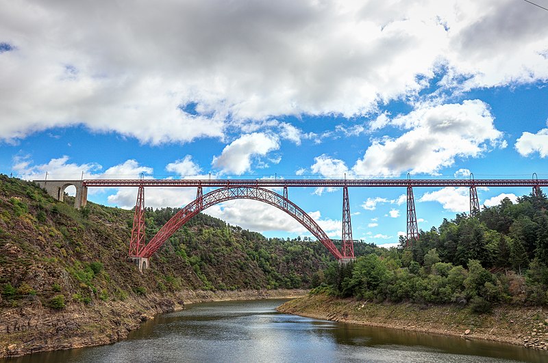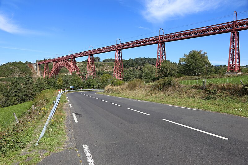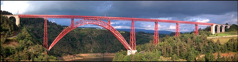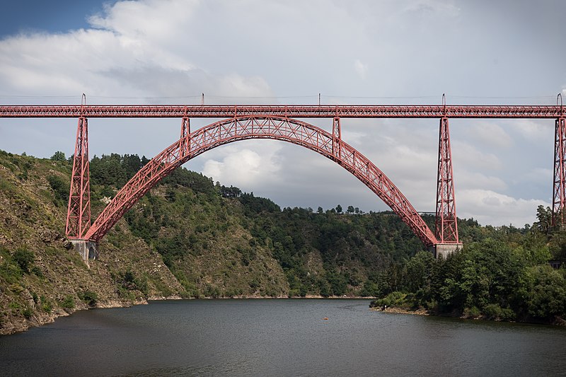Le viaduc de Garabit est un pont ferroviaire franchissant les gorges de la Truyère sur la ligne de Béziers à Neussargues, situé sur les communes de Ruynes-en-Margeride et de Val d'Arcomie dans le Cantal, en Auvergne-Rhône-Alpes. Le projet initial est dû à l'ingénieur des ponts Léon Boyer, qui impose un tracé direct sur les plateaux et un franchissement à grande hauteur plutôt que la descente dans les vallées. La finalisation et la réalisation sont confiées à Gustave Eiffel et à sa société, avec la participation d'ingénieurs tels que Théophile Seyrig puis Maurice Koechlin. Les travaux de fondations commencent en janvier 1880; le chantier s'achève en septembre 1884 et la mise en service intervient en 1888. L'ouvrage, d'une longueur d'environ 565 m, culmine à près de 122 m au-dessus de la Truyère et comportait, à sa construction, l'une des plus grandes arches du monde, d'une portée de 165 m. Le tablier métallique mesure 554,69 m et repose sur sept piles en fer puddlé, dont deux atteignent 80 m de hauteur; cinq piles indépendantes s'appuient sur des blocs de fondation en maçonnerie. Trois travées forment l'arc principal au-dessus de la partie la plus basse de la vallée, et la superstructure est encadrée par deux estacades d'accès en maçonnerie de 46 m et 71 m. La hauteur d'origine au-dessus de l'étiage était de 122,5 m; après la construction du barrage de Grandval en 1959 et la formation du lac de retenue, le viaduc surplombe désormais le plan d'eau d'environ 95 m. L'ouvrage supporte une voie ferrée unique équipée d'une caténaire et a été conçu pour la circulation du trafic reliant Paris à Béziers par le Massif central. La ligne a été électrifiée en 1932 en 1 500 volts continu. Pour limiter les sollicitations, la vitesse des trains y est restreinte, avec une limitation générale à 40 km/h et une restriction à 10 km/h appliquée lors de la réouverture partielle en octobre 2009 après la découverte d'une fissure en septembre 2009. Les matériaux employés comprennent 3 169 tonnes de fer forgé, 41 tonnes d'acier et 23 tonnes de fonte; 678 768 rivets ont été posés et le volume de maçonnerie des fondations et des estacades atteint 20 370 m3. Le viaduc a fait l'objet d'une inscription au titre des Monuments historiques le 14 septembre 1965, puis d'un classement le 18 octobre 2017. Il a été repeint en rouge entre 1992 et 1998, a été temporairement fermé en septembre 2009 pour contrôle puis rouvert un mois plus tard avec des restrictions de vitesse, et a fait l'objet de travaux d'entretien importants en 2011. Il est éclairé certains soirs depuis 2001. Le viaduc a inspiré des réalisations culturelles et médiatiques: il apparaît dans plusieurs films, parmi lesquels L'Enfer d'Henri-Georges Clouzot (1964), Un homme de trop de Costa-Gavras (1967), Le Pont de Cassandra (1976) et Camping 2 (2010), figure sur un billet de 200 francs consacré à Gustave Eiffel et a été reproduit sur un timbre en 1952. Une maquette est exposée à France Miniature et de nombreuses publications et études lui ont été consacrées. L'inauguration de la section de Saint-Chély à Saint-Flour via le viaduc a eu lieu le 28 mai 1888, et des essais en charge ont été effectués le 10 avril 1888. Le viaduc a longtemps été traversé par l'Aubrac Express, surnom du train qui a contribué à sa notoriété locale. Le site constitue un repère majeur dans le paysage des gorges de la Truyère et demeure un ouvrage emblématique de l'ingénierie métallique du XIXe siècle.