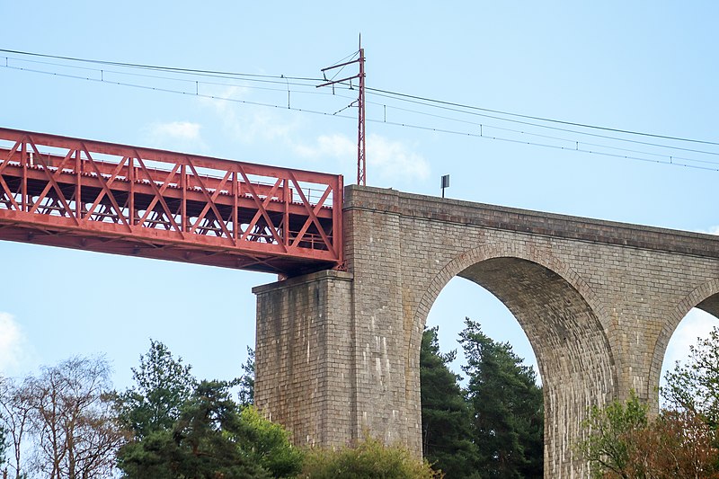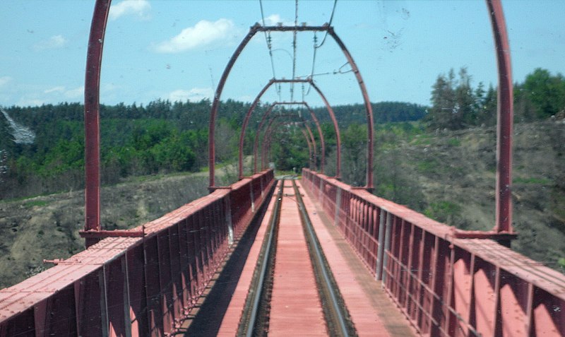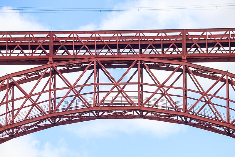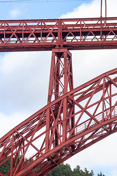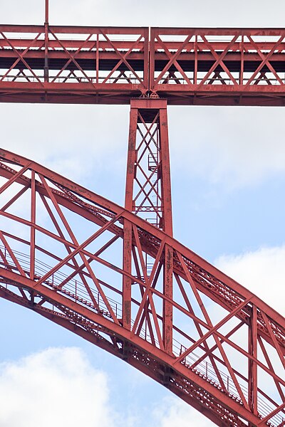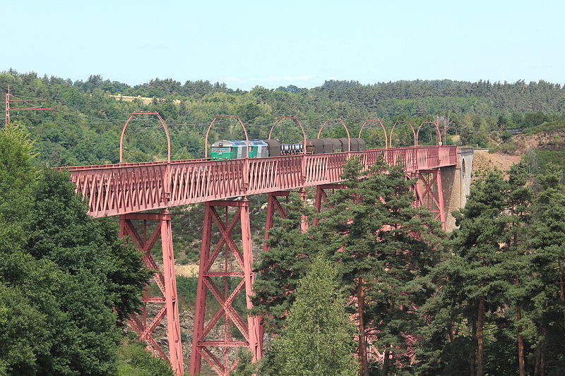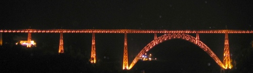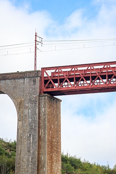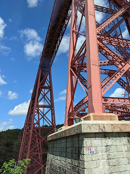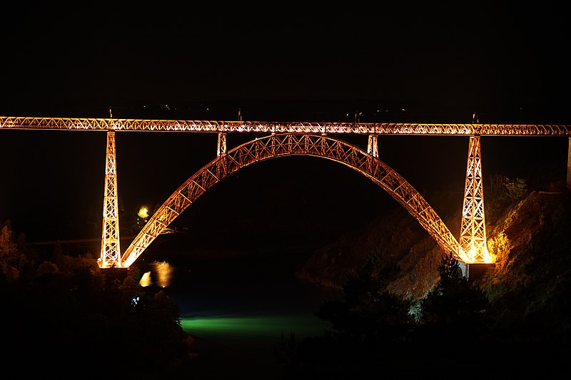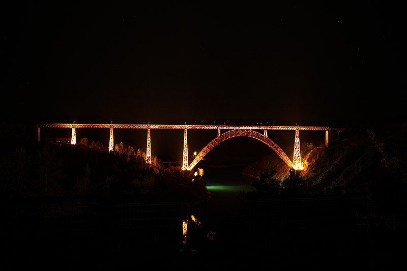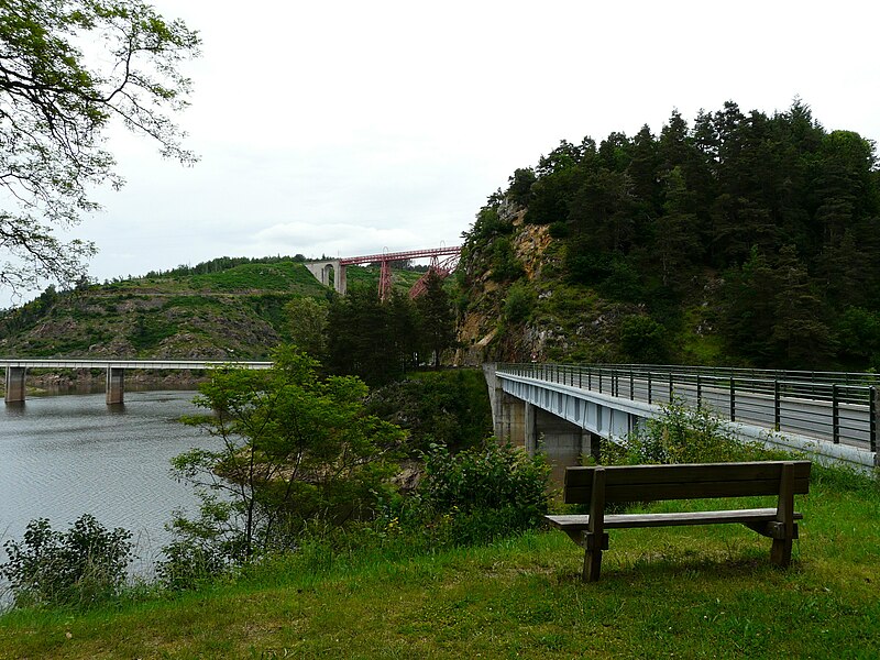 Le viaduc de Garabit est un pont ferroviaire franchissant les gorges de la Truyère sur la ligne de Béziers à Neussargues, situé sur les communes de Ruynes-en-Margeride et de Val d'Arcomie dans le Cantal, en Auvergne-Rhône-Alpes. Le projet initial est dû à l'ingénieur des ponts Léon Boyer, qui impose un tracé direct sur les plateaux et un franchissement à grande hauteur plutôt que la descente dans les vallées. La finalisation et la réalisation sont confiées à Gustave Eiffel et à sa société, avec la participation d'ingénieurs tels que Théophile Seyrig puis Maurice Koechlin. Les travaux de fondations commencent en janvier 1880; le chantier s'achève en septembre 1884 et la mise en service intervient en 1888. L'ouvrage, d'une longueur d'environ 565 m, culmine à près de 122 m au-dessus de la Truyère et comportait, à sa construction, l'une des plus grandes arches du monde, d'une portée de 165 m. Le tablier métallique mesure 554,69 m et repose sur sept piles en fer puddlé, dont deux atteignent 80 m de hauteur; cinq piles indépendantes s'appuient sur des blocs de fondation en maçonnerie. Trois travées forment l'arc principal au-dessus de la partie la plus basse de la vallée, et la superstructure est encadrée par deux estacades d'accès en maçonnerie de 46 m et 71 m. La hauteur d'origine au-dessus de l'étiage était de 122,5 m; après la construction du barrage de Grandval en 1959 et la formation du lac de retenue, le viaduc surplombe désormais le plan d'eau d'environ 95 m. L'ouvrage supporte une voie ferrée unique équipée d'une caténaire et a été conçu pour la circulation du trafic reliant Paris à Béziers par le Massif central. La ligne a été électrifiée en 1932 en 1 500 volts continu. Pour limiter les sollicitations, la vitesse des trains y est restreinte, avec une limitation générale à 40 km/h et une restriction à 10 km/h appliquée lors de la réouverture partielle en octobre 2009 après la découverte d'une fissure en septembre 2009. Les matériaux employés comprennent 3 169 tonnes de fer forgé, 41 tonnes d'acier et 23 tonnes de fonte; 678 768 rivets ont été posés et le volume de maçonnerie des fondations et des estacades atteint 20 370 m3. Le viaduc a fait l'objet d'une inscription au titre des Monuments historiques le 14 septembre 1965, puis d'un classement le 18 octobre 2017. Il a été repeint en rouge entre 1992 et 1998, a été temporairement fermé en septembre 2009 pour contrôle puis rouvert un mois plus tard avec des restrictions de vitesse, et a fait l'objet de travaux d'entretien importants en 2011. Il est éclairé certains soirs depuis 2001. Le viaduc a inspiré des réalisations culturelles et médiatiques: il apparaît dans plusieurs films, parmi lesquels L'Enfer d'Henri-Georges Clouzot (1964), Un homme de trop de Costa-Gavras (1967), Le Pont de Cassandra (1976) et Camping 2 (2010), figure sur un billet de 200 francs consacré à Gustave Eiffel et a été reproduit sur un timbre en 1952. Une maquette est exposée à France Miniature et de nombreuses publications et études lui ont été consacrées. L'inauguration de la section de Saint-Chély à Saint-Flour via le viaduc a eu lieu le 28 mai 1888, et des essais en charge ont été effectués le 10 avril 1888. Le viaduc a longtemps été traversé par l'Aubrac Express, surnom du train qui a contribué à sa notoriété locale. Le site constitue un repère majeur dans le paysage des gorges de la Truyère et demeure un ouvrage emblématique de l'ingénierie métallique du XIXe siècle.