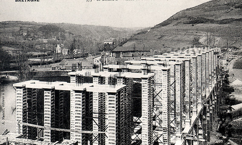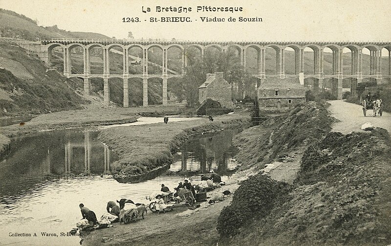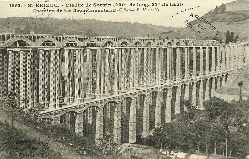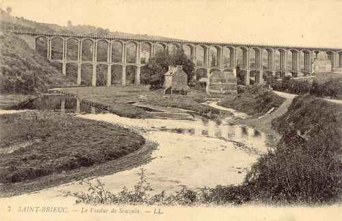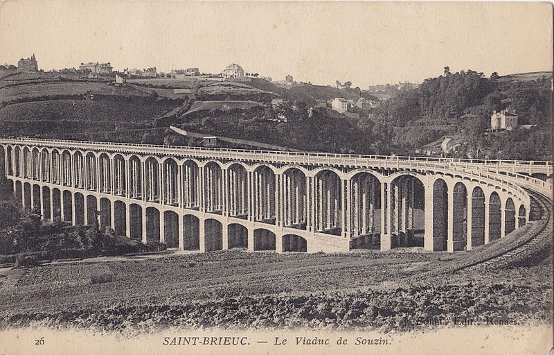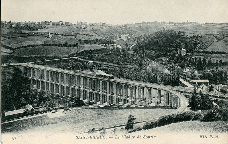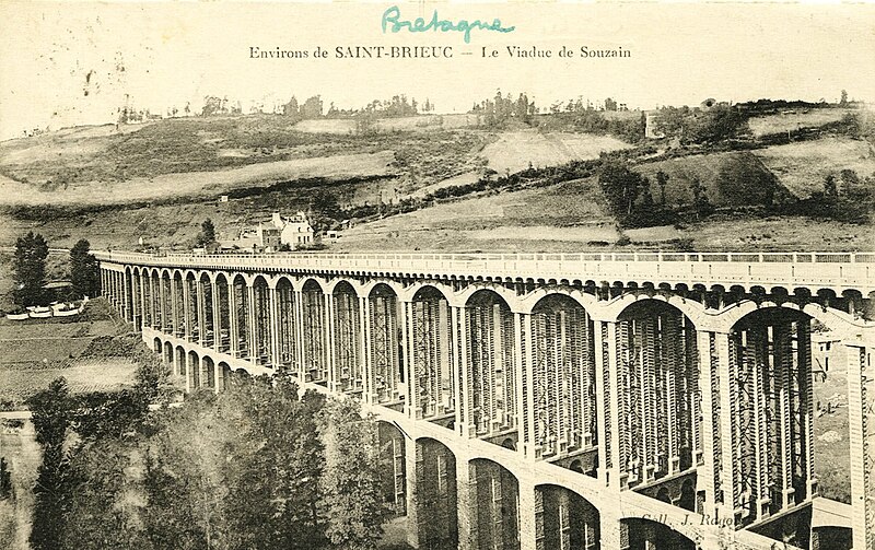 Le viaduc de Souzain, conçu par l'ingénieur Louis Harel de la Noë pour les chemins de fer des Côtes-du-Nord, a été réalisé entre 1903 et 1905 et figure parmi les premières expressions de l'usage du béton armé dans les ouvrages d'art. Situé entre Saint-Brieuc et Plérin, il enjambe la vallée du Gouët. L'ouvrage se composait de trois parties : un accès côté Plérin formé de neuf travées continues en béton armé espacées de 5,10 m entre axes, un viaduc principal de 210 m comportant 23 arches surbaissées en maçonnerie (entraxe de 9,00 m et ouverture de 7,10 m) et un ouvrage secondaire de 47 m supportant la ligne du Phare, constitué de huit arches maçonnées courbes. La longueur totale était de 259 m, la hauteur maximale de 32,60 m et la largeur entre garde-corps de 10,80 m. Construit en régie par le département, le chantier mobilisa environ 120 agents et débuta au printemps 1903; les pierres provenaient d'une carrière voisine et le ciment arrivait par le port du Légué. Les fondations variaient selon le terrain : patins en béton armé posés sur éboulis schisteux, graviers compacts ou rocher affleurant; les culées furent bâties sur le roc. Le premier étage des piles, en maçonnerie, mesurait 1,90 m de large sur 8,80 m de long pour une hauteur d'environ 10 m, avec des chaînages en béton armé tous les deux mètres et des anneaux de voûtes surbaissés assurant le contreventement. Au-dessus, un socle en béton armé accueillait, pour chaque pile, huit pilettes de 60 × 60 cm et de 9,55 m de hauteur, réalisées avec un béton dosé à 400 kg de ciment Portland par mètre cube et coffrées de briques apparentes ; les armatures étaient constituées de fers ronds de 20 mm sans cadres ni étriers, et des cornières métalliques en forme de croix assuraient le contreventement. Les pilettes étaient coiffées d'un sommier en béton armé supportant les arches ; le tablier, dont le plancher a été coulé en place, comportait des trottoirs en encorbellement avec un porte-à-faux de 1,22 m. Un ouvrier trouva la mort en juillet 1904 après une chute d'échafaudage; les travaux s'achevèrent fin 1904 et des épreuves de charge conclurent à la solidité de l'ouvrage en janvier 1905. Le premier train franchit le viaduc le 20 juin 1905. En 1934, une portion du tablier fut élargie de 3 m sur 50 m pour améliorer la circulation routière. Le 23 novembre 1944, un autorail De Dion-Bouton OC1 n°16 dérailla sur le viaduc lors d'un rodage après révision, la cause étant une défaillance des freins; la vitesse fut estimée à plus de 120 km/h. Des travaux sur les pilettes furent réalisés en février 1955 par l'entreprise Coignet sous la direction du service des Ponts et Chaussées. La ligne ferroviaire fut fermée définitivement le 31 décembre 1956 et le viaduc devint exclusivement routier. Dans les décennies suivantes, l'état des pilettes se dégrada rapidement : selon un rapport des Ponts et Chaussées, le nombre de fissures passa de 130 en 1976 à 300 en 1985, la porosité du béton et un enrobage des armatures réduit (2 cm) favorisant la corrosion des aciers étant mis en cause. L'accès fut limité aux véhicules de moins de 2,30 m le 11 septembre 1991, puis fermé à la circulation le 21 décembre 1992. Une étude de restauration fut commandée le 15 décembre 1992, financée à parts égales par la DRAC et le département, et plusieurs évaluations chiffrèrent le coût de la restauration et de la reconstruction, tandis qu'une inscription au titre des monuments historiques fut prononcée à partir du 21 décembre 1993. En 1994, le conseil général vota une restauration avec prise en charge par l'État d'une part du surcoût et prévoyait de reconstruire les pilettes par éléments de deux mètres en conservant le parement en briques ; des oppositions locales et des doutes techniques subsistèrent. Au printemps 1995, des rapports faisant état d'un risque imminent conduisirent à restreindre l'accès, à évacuer des riverains et à envisager la démolition ; malgré l'avis défavorable du ministère de la Culture, le Premier ministre autorisa la destruction le 9 juin 1995. Le viaduc fut dynamité le 27 juin 1995 à 16 h; il fut ensuite radié de l'inscription aux monuments historiques par arrêté du 2 mars 2016. Quelques piles furent préservées par l'Association Harel de la Noë : l'une est exposée près d'un rond-point de Langueux et une autre se trouve dans le parc de Boutdeville, face au musée de la Briqueterie de Saint-Ilan.