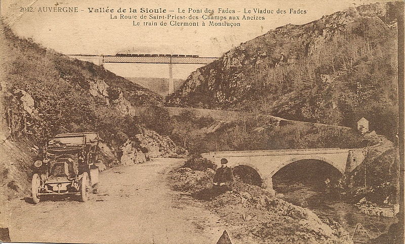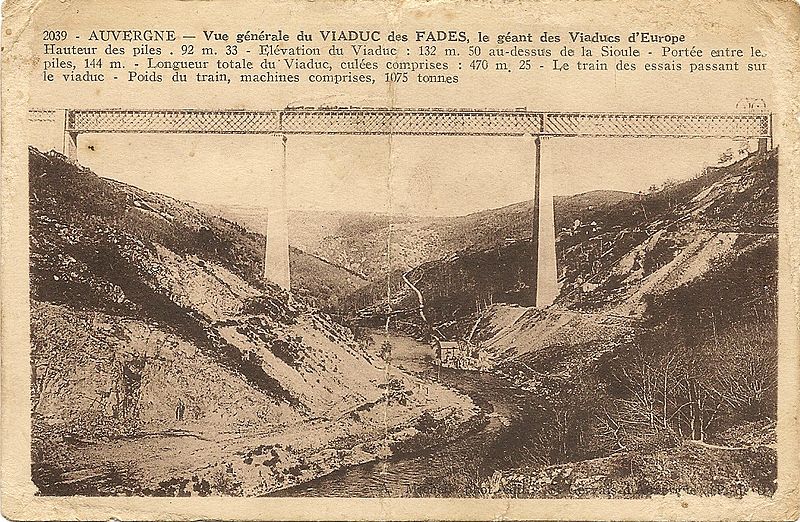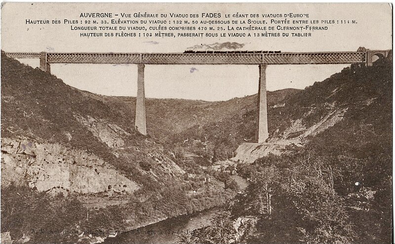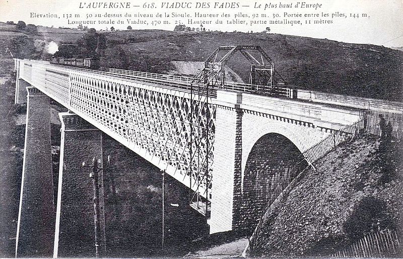 Le viaduc des Fades a été construit par les anciens établissements Cail pour permettre à la ligne de Volvic à Lapeyrouse de franchir la vallée de la Sioule ; il s’inspire du modèle du viaduc de Tardes réalisé par Eiffel en 1883. Ouvrage « mixte », il associe un tablier métallique droit posé sur deux piles en maçonnerie qui forment, avec les culées, trois travées. Les piles, de plan rectangulaire et à section décroissante vers le sommet, sont couronnées d’une rangée de consoles évoquant des mâchicoulis ; le tablier est une poutre en treillis à deux niveaux dont le longeron repose sur les piles au moyen de patins surélevés. Une passerelle piétonnière se développe au nu inférieur du tablier et est accessible par une trappe ; au sud, le viaduc rejoint le flanc de la vallée par une culée en maçonnerie percée d’une arche, tandis qu’au nord une pile et un petit tablier reproduisent en réduction la structure des travées principales. Situé entre Sauret-Besserve et Les Ancizes-Comps, dans le Puy-de-Dôme, il demeure le plus haut pont ferroviaire de France et ses deux piles en maçonnerie, qui culminent à plus de 92 mètres hors fondations, constituent encore le record mondial dans leur catégorie. Le viaduc dessert la ligne de Lapeyrouse à Volvic (tronçon de la relation Clermont-Ferrand–Montluçon via les Combrailles) ; son exploitation a été suspendue le 9 décembre 2007 par la direction régionale de la SNCF pour des raisons de sécurité et la ligne est aujourd’hui neutralisée au titre de son statut domanial.