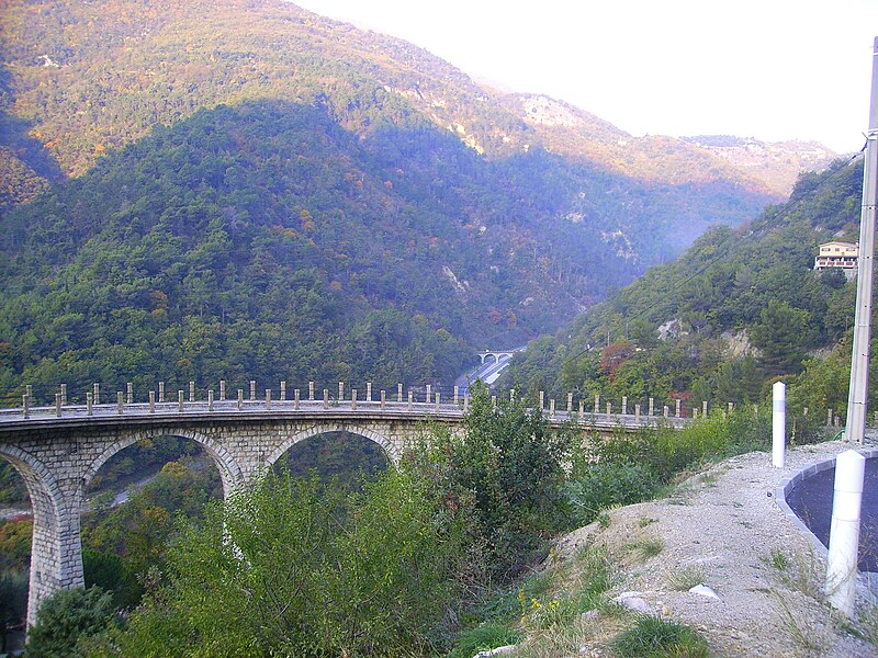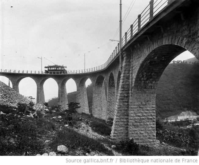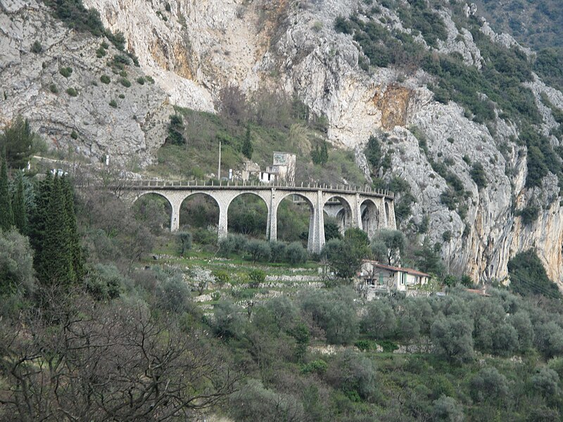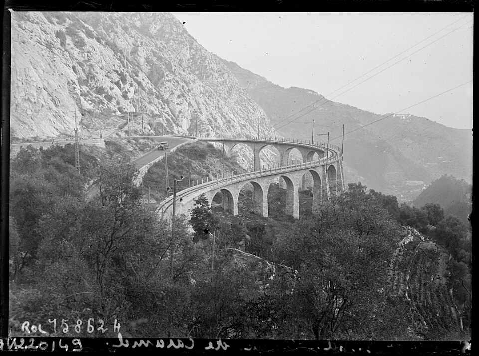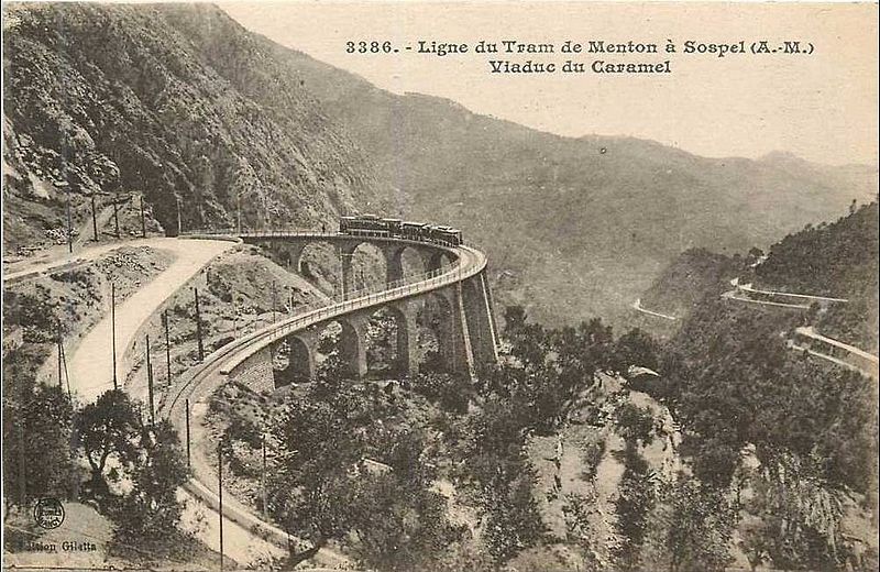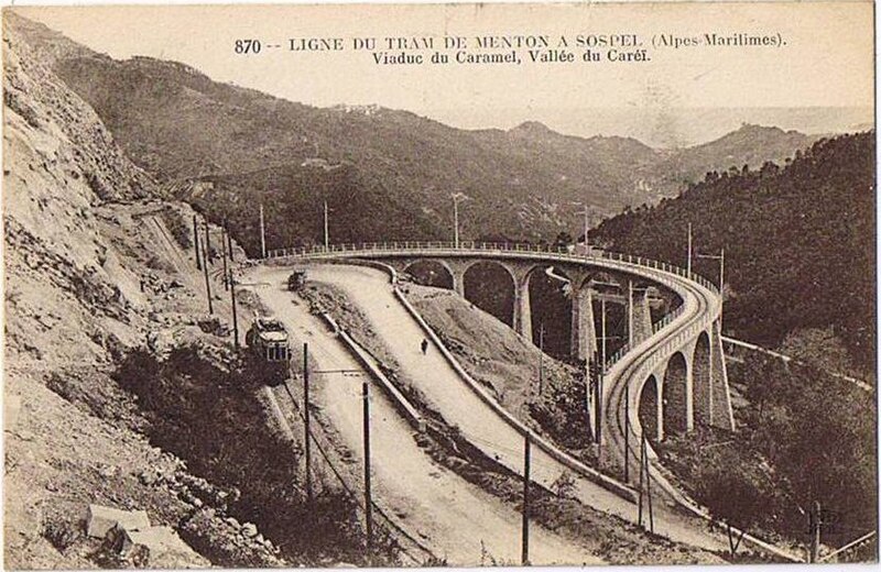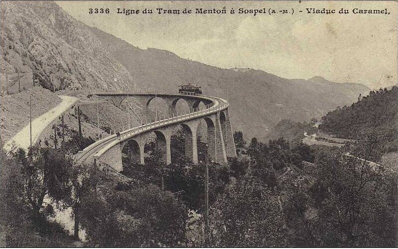 Le viaduc du Caramel est l’un des ouvrages d’art de la ligne ferroviaire reliant Menton à Sospel. Le projet de ce tramway départemental a été lancé en 1906 et a exigé d’importants moyens pour la conception des ouvrages et l’électrification de la ligne. Les travaux se sont achevés en 1911 et l’inauguration a eu lieu le 30 mars 1912. Le tram transportait des voyageurs au départ de la place Saint‑Roch à Menton. Le premier ouvrage d’art, à la sortie du hameau de Monti, est le pont de Monti, entièrement construit en béton armé. Non loin du village de Castillon, la topographie a rendu nécessaire la construction du viaduc du Careï, pour franchir la vallée du Careï, et du viaduc du Caramel, qui permet d’aborder l’épingle à cheveux menant ensuite à Sospel. Après Castillon se trouvent une gare et un tunnel évitant à la ligne de franchir le col emprunté par la route ; le terminus se situe en gare de Sospel. Le tracé impose une forte pente : 569 m de dénivelé sur 11 km. Mis en service, il assurait le transport quotidien de 150 à 200 voyageurs, le transport de marchandises lourdes (1 581 tonnes en 1913) et d’autres prestations, comme la poste. À la fin des années 1920, la ligne Nice‑Coni supplante le tramway pour le transport des marchandises et l’arrêt de l’exploitation est alors envisagé ; l’ouverture d’une ligne d’autobus en 1929 pour les voyageurs préfigure la fermeture définitive du tramway en 1931. La ligne a été déclassée en 1933.