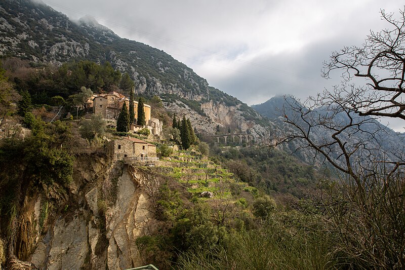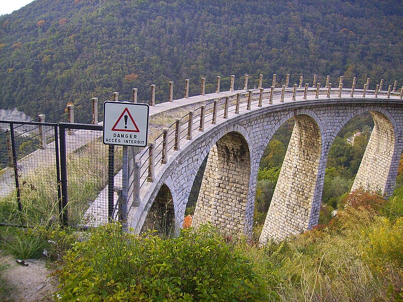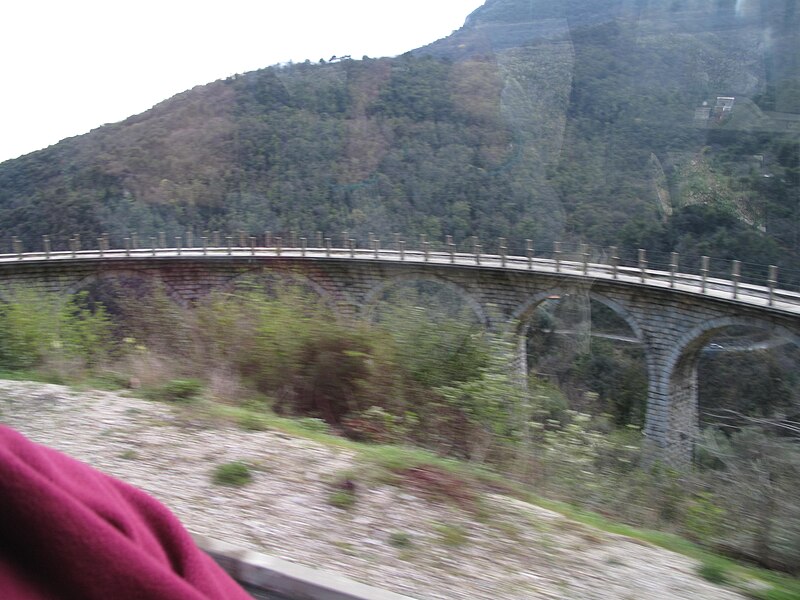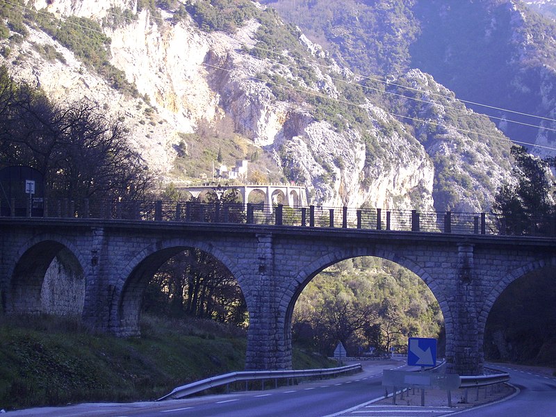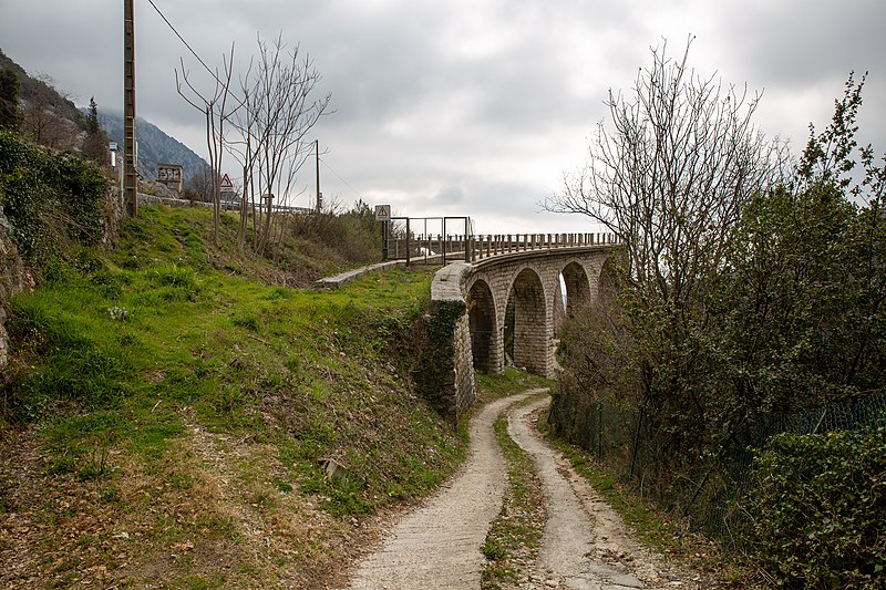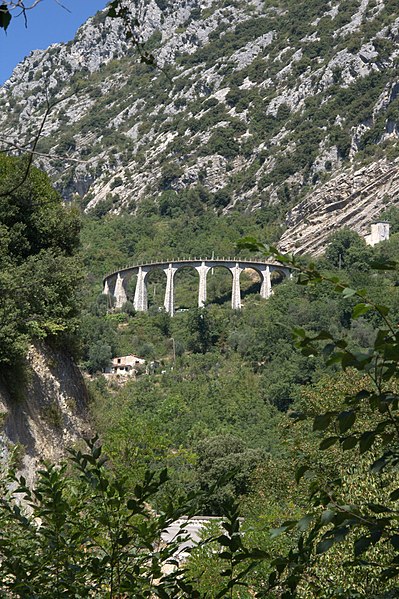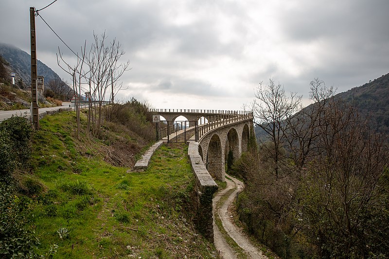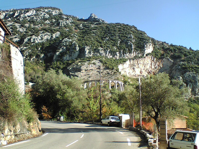 Le viaduc du Caramel est l’un des ouvrages d’art de la ligne ferroviaire reliant Menton à Sospel. Le projet de ce tramway départemental a été lancé en 1906 et a exigé d’importants moyens pour la conception des ouvrages et l’électrification de la ligne. Les travaux se sont achevés en 1911 et l’inauguration a eu lieu le 30 mars 1912. Le tram transportait des voyageurs au départ de la place Saint‑Roch à Menton. Le premier ouvrage d’art, à la sortie du hameau de Monti, est le pont de Monti, entièrement construit en béton armé. Non loin du village de Castillon, la topographie a rendu nécessaire la construction du viaduc du Careï, pour franchir la vallée du Careï, et du viaduc du Caramel, qui permet d’aborder l’épingle à cheveux menant ensuite à Sospel. Après Castillon se trouvent une gare et un tunnel évitant à la ligne de franchir le col emprunté par la route ; le terminus se situe en gare de Sospel. Le tracé impose une forte pente : 569 m de dénivelé sur 11 km. Mis en service, il assurait le transport quotidien de 150 à 200 voyageurs, le transport de marchandises lourdes (1 581 tonnes en 1913) et d’autres prestations, comme la poste. À la fin des années 1920, la ligne Nice‑Coni supplante le tramway pour le transport des marchandises et l’arrêt de l’exploitation est alors envisagé ; l’ouverture d’une ligne d’autobus en 1929 pour les voyageurs préfigure la fermeture définitive du tramway en 1931. La ligne a été déclassée en 1933.