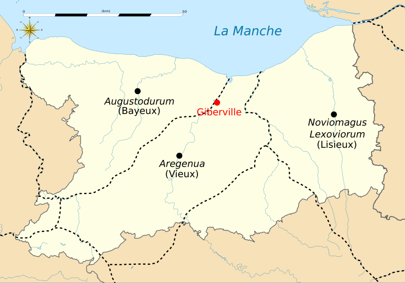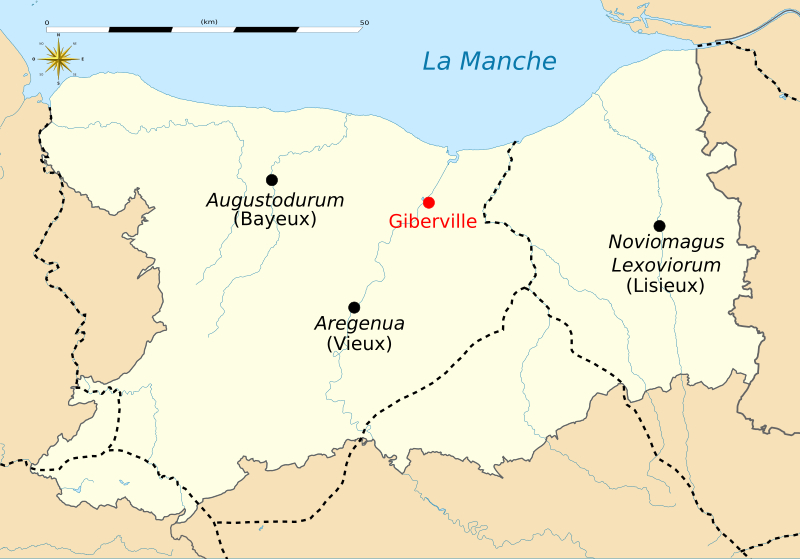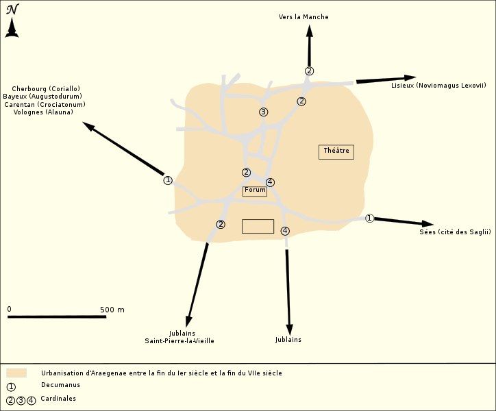 Les fouilles ont bénéficié du fait qu’aucune agglomération moderne n’a recouvert les vestiges, condition rare pour une ancienne capitale de cité ; la première découverte connue est le marbre de Thorigny en 1580, et les premières fouilles du site datent de 1697, soit quarante-cinq ans avant celles de Pompéi. Le site occupe un carrefour de voies antiques : le Chemin Haussé, identifié à l’une des voies de la table de Peutinger et reliant Bretteville-l’Orgueilleuse à Jort, fut utilisé pendant tout le Moyen Âge et apparaît sur certains cadastres sous l’appellation « Chemin du Duc Guillaume ». D’autres axes le mettent en relation avec le Cotentin, les pays de la Loire, Lisieux et Rouen ; certains correspondent au cardo et au decumanus de la cité, sans toutefois présenter la rectitude souvent supposée.