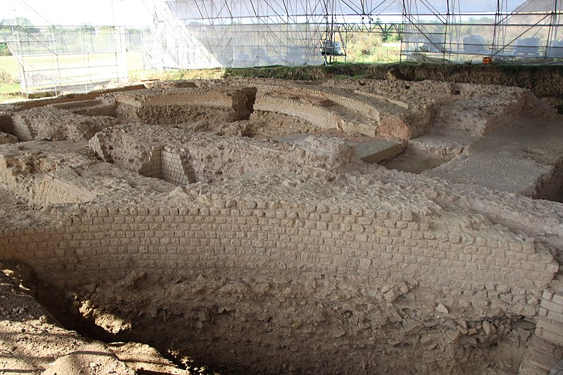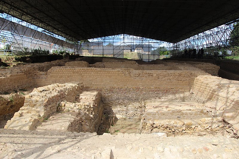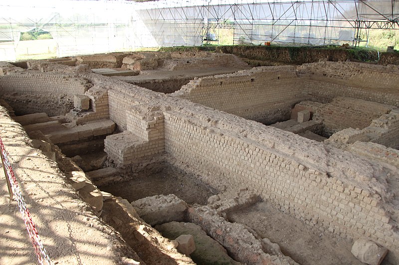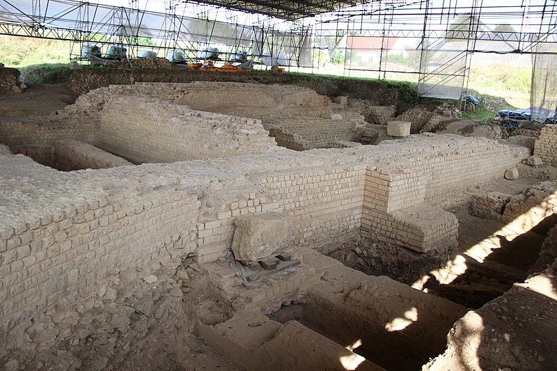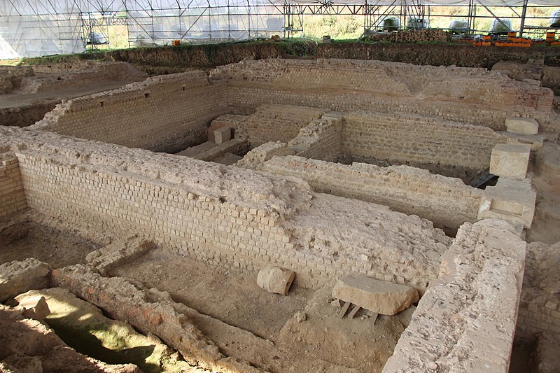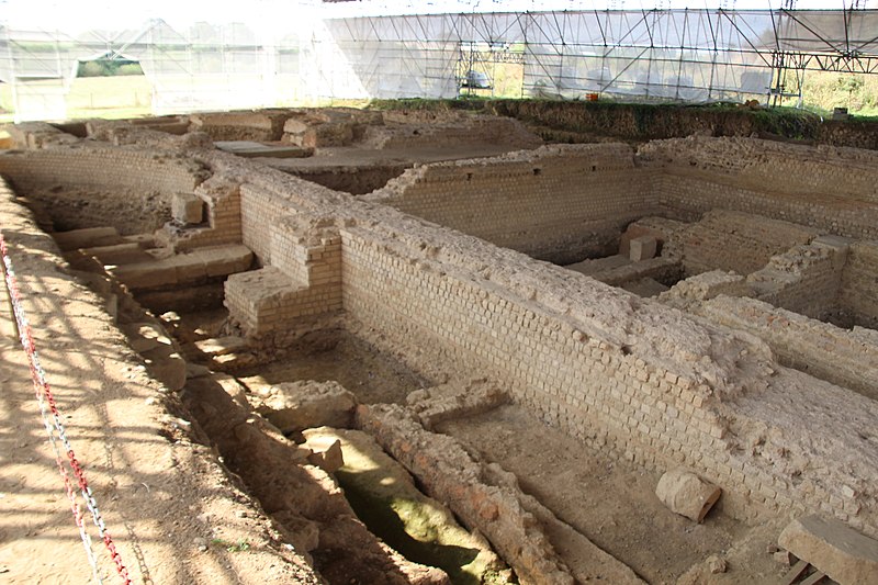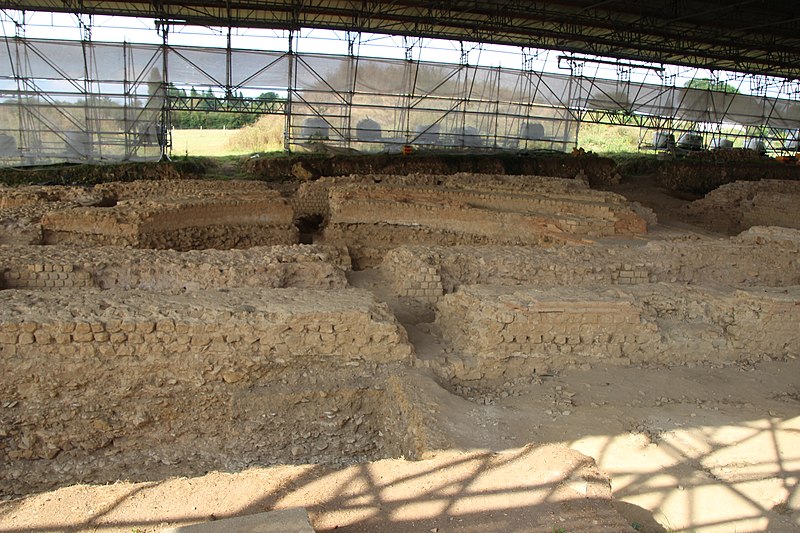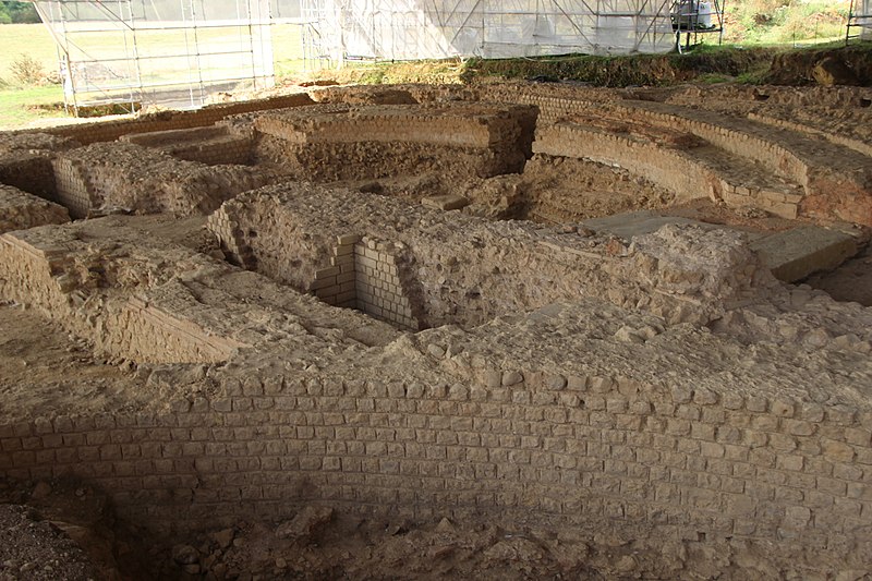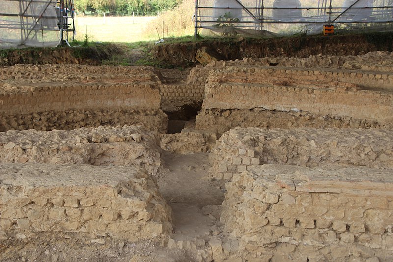 Les archéologues ont mis au jour plusieurs constructions monumentales : un aqueduc, un théâtre romain de taille moyenne — d’environ 80 mètres de diamètre — apparemment transformé en amphithéâtre au IIe siècle, des thermes publics dont les fondateurs sont connus (Solemninus et son fils Titus Sennius Sollemnis), et un sanctuaire où fut découvert un autel dédié à Vénus et à Mars, sous l’emplacement de l’actuelle église Notre-Dame, illustrant une rare continuité de lieu de culte. Une domus remarquable, la « maison au grand péristyle », fouillée par P. Vipard entre 1988 et 1991, s’étend sur 1 250 à 1 500 m2 autour d’une cour centrale avec bassin (impluvium) et péristyle ; plusieurs pièces étaient chauffées par hypocauste et l’ensemble présentait un décor riche (fresque d’Achille et Thétys, sculptures bacchiques, colonnes ciselées, piliers sculptés, mosaïques) ainsi que des dalles en calcaire d’origine, témoignant de l’assimilation de l’architecture romaine en Gaule du Nord. Une basilique civile et un bâtiment abritant la curie font l’objet de fouilles, et un quartier artisanal au sud‑ouest a livré un atelier de bronzier et des fours de verriers.