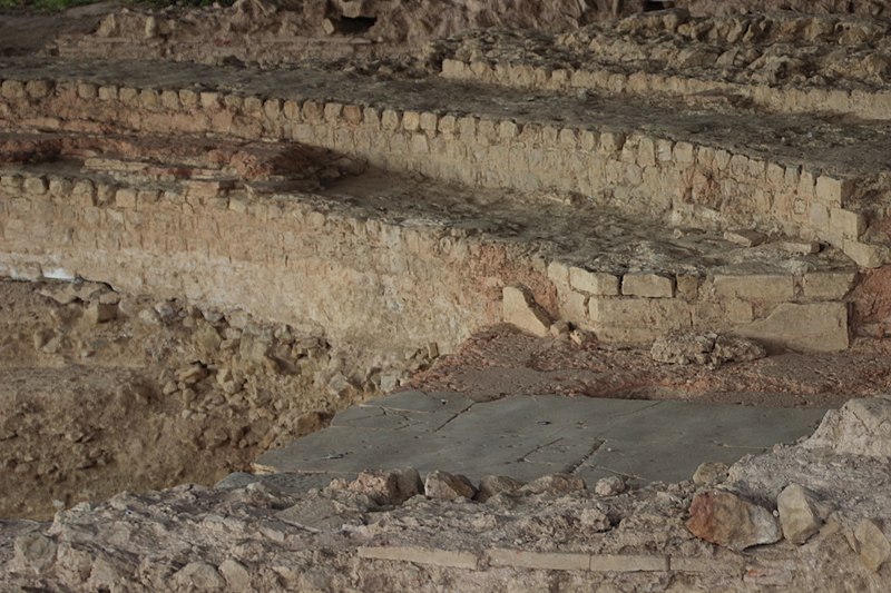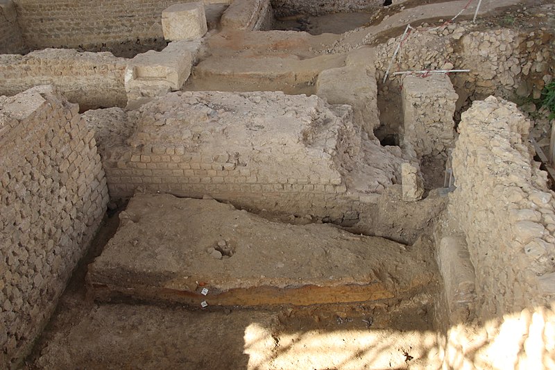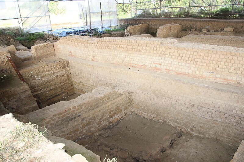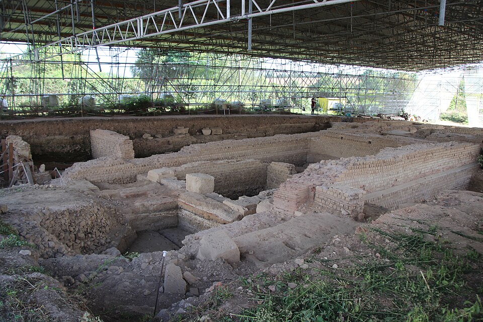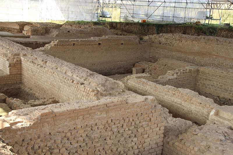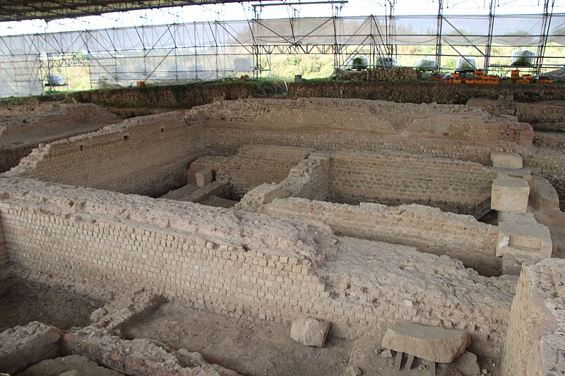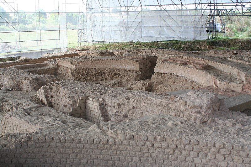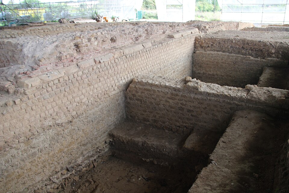 Les archéologues ont mis au jour plusieurs constructions monumentales : un aqueduc, un théâtre romain de taille moyenne — d’environ 80 mètres de diamètre — apparemment transformé en amphithéâtre au IIe siècle, des thermes publics dont les fondateurs sont connus (Solemninus et son fils Titus Sennius Sollemnis), et un sanctuaire où fut découvert un autel dédié à Vénus et à Mars, sous l’emplacement de l’actuelle église Notre-Dame, illustrant une rare continuité de lieu de culte. Une domus remarquable, la « maison au grand péristyle », fouillée par P. Vipard entre 1988 et 1991, s’étend sur 1 250 à 1 500 m2 autour d’une cour centrale avec bassin (impluvium) et péristyle ; plusieurs pièces étaient chauffées par hypocauste et l’ensemble présentait un décor riche (fresque d’Achille et Thétys, sculptures bacchiques, colonnes ciselées, piliers sculptés, mosaïques) ainsi que des dalles en calcaire d’origine, témoignant de l’assimilation de l’architecture romaine en Gaule du Nord. Une basilique civile et un bâtiment abritant la curie font l’objet de fouilles, et un quartier artisanal au sud‑ouest a livré un atelier de bronzier et des fours de verriers.