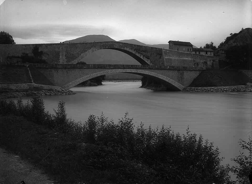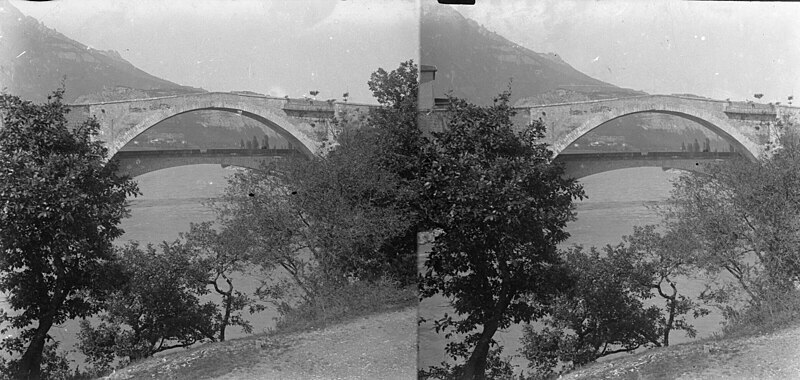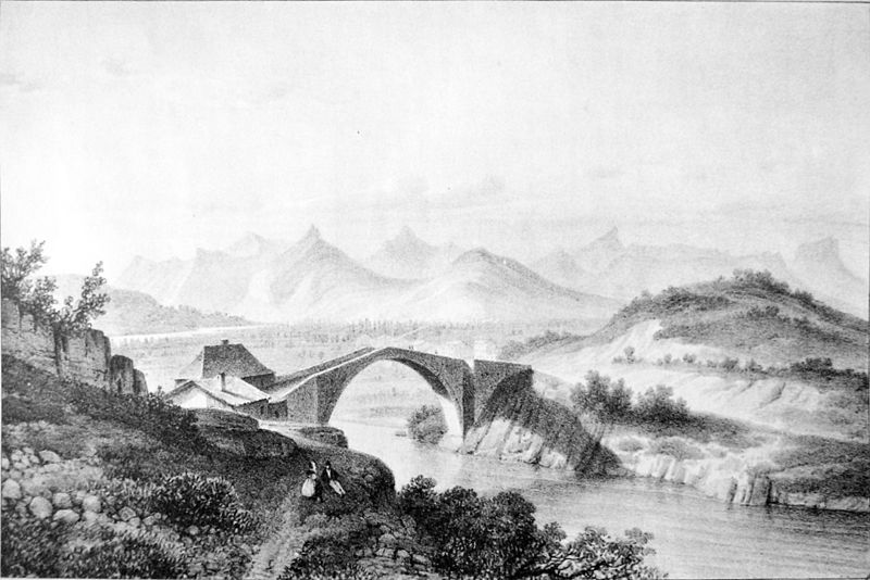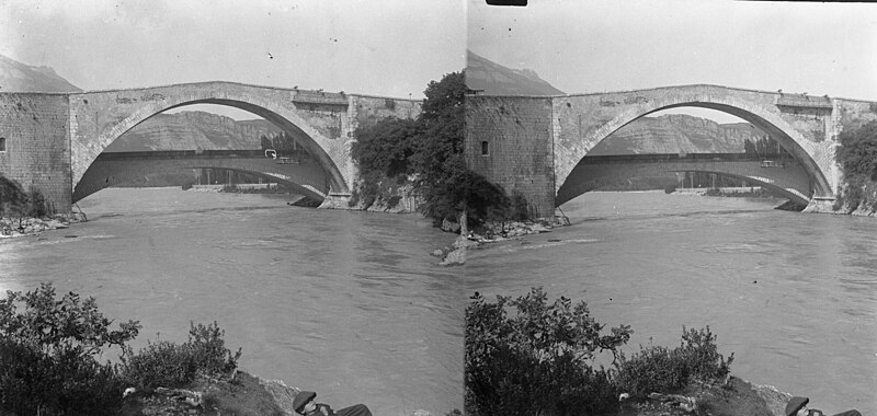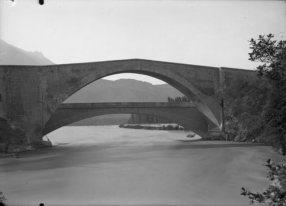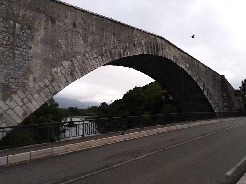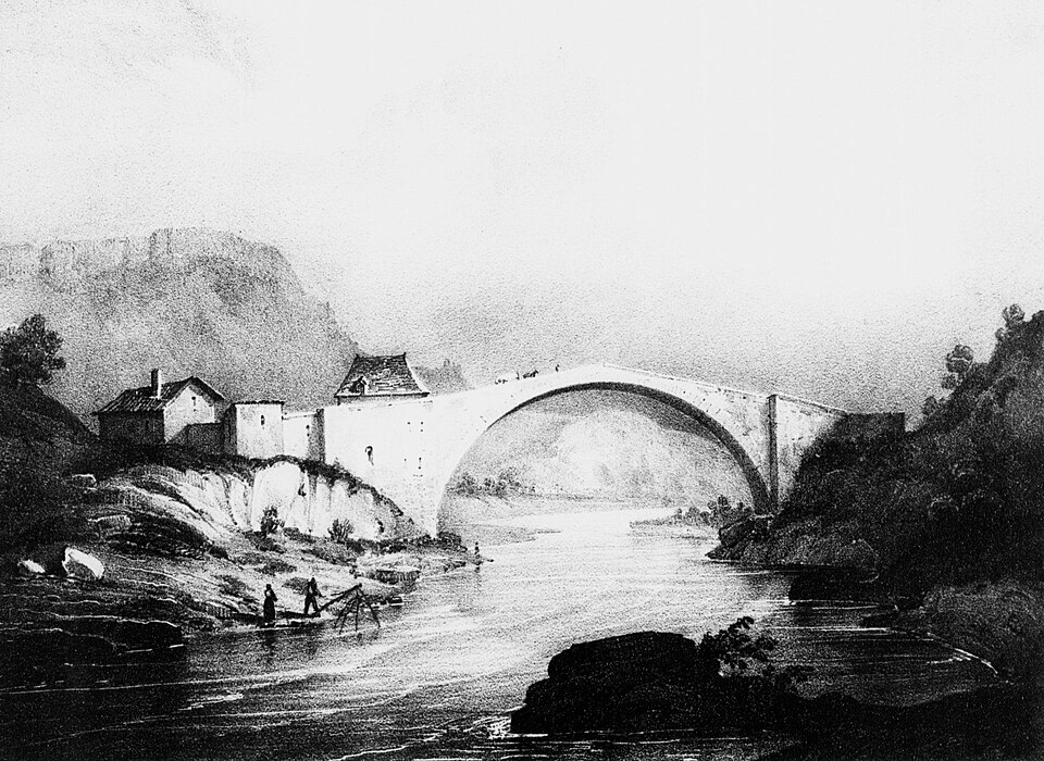 Le vieux pont, non ouvert à la circulation automobile, présente une chaussée en dos d’âne et une unique arche ; sa portée d’une rive à l’autre est de 45,65 mètres et la hauteur maximale de l’arc est de 15,70 mètres au-dessus des rives. À l’origine, il portait deux inscriptions latines aujourd’hui disparues : « Unus Distancia Jungo » (Unique par ma longueur, je réunis) et « Romana Moles Pudore Suffondo » (Je fais rougir de honte les constructions romaines).