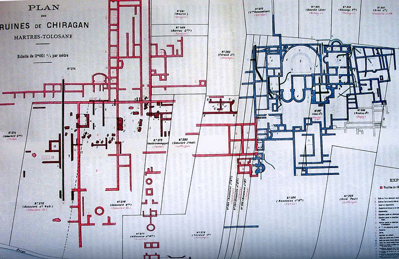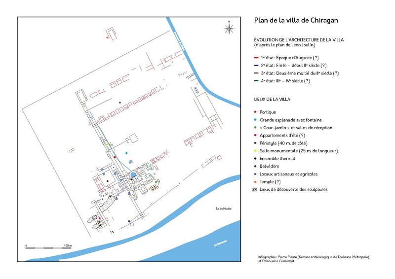 La villa gallo-romaine de Chiragan se situe sur la commune de Martres-Tolosane, en bordure de la Garonne, et ses vestiges sont aujourd'hui recouverts d'une épaisse couche de terre arable. Monument remarquable par ses dimensions et sa structure, le site a livré dès le XVIIe siècle et surtout au XIXe siècle un ensemble exceptionnel de sculptures, dont de nombreux portraits désormais conservés au musée Saint-Raymond de Toulouse. Les fouilles menées par Alexandre Du Mège à partir de 1826 ont mis au jour un grand nombre d'éléments sculptés, de mosaïques, d'hypocaustes et de traces de peintures, et beaucoup de pièces furent transférées au musée de Toulouse. Des campagnes ultérieures menées par la Société archéologique du Midi, par Albert Lebègue et par A. Ferré ont complété les découvertes, avant les fouilles d'envergure conduites par Léon Joulin à la fin du XIXe siècle, dont le plan et la synthèse publiés en 1901 restent une référence. Inscrites au titre des monuments historiques en 1998, les parcelles ont fait l'objet de sondages géophysiques en 2000, 2001 et 2003 qui ont en grande partie confirmé le plan majeur proposé par Joulin. Occupée entre le Ier et le IVe siècle, la villa s'étendait sur un enclos vaste, avec une emprise établie par les recherches récentes à environ 18 000 m² et une enceinte de quelque 16 hectares évoquée par les fouilleurs anciens ; l'implantation comprenait des installations résidentielles et agricoles ainsi qu'un quai et une jetée signalés au XIXe siècle. Le complexe comptait une pars urbana richement aménagée, plusieurs dizaines de pièces et un vaste rez-de‑chaussée comprenant plus de 200 chambres, parcs et portiques prestigieux, ainsi qu'une pars rustica organisée en trois lignes de bâtiments destinés à l'élevage, au stockage et à l'artisanat. Les fouilleurs ont reconnu sur le domaine des logements pour les employés, des ateliers, des fabriques et des abris pour animaux, formant un petit village lié à l'exploitation du domaine, qui aurait pu couvrir plus de 1 000 hectares et accueillir environ 400 personnes. Malgré la qualité et la quantité du mobilier découvert, les vestiges architecturaux conservés sont aujourd'hui peu apparents, en partie en raison des pillages et de l'utilisation du site comme carrière, puis des destructions liées à l'agriculture intensive au XIXe siècle. Les centaines de sculptures exhumées comprennent environ 300 statues, des reliefs, des éléments décoratifs en marbre et une galerie de portraits d'empereurs et d'autres personnages couvrant du Ier au IVe siècle ; de nombreuses sculptures présentent des mutilations, parfois interprétées comme le résultat de destructions volontaires ou des dommages liés aux travaux agricoles. La galerie des empereurs réunissait des bustes allant d'Antonin le Pieux, Marc Aurèle, Septime Sévère et Trajan à Caracalla et Maximien Hercule, ainsi que de nombreux sujets anonymes ; plusieurs pièces portent des restaurations ou des altérations notables. Parmi les ensembles les plus remarquables figurent des clipei, ou boucliers décoratifs en haut‑relief, dont six exemplaires bien conservés représentent Vulcain, Cybèle, Minerve casquée, Hygie, Attis et Esculape, ainsi que d'autres fragments attribués à Vénus ou Diane. Les reliefs représentant les travaux d'Hercule forment un ensemble unique, de taille approximative 1,44 m sur 0,88 m pour chaque panneau, exécuté en marbre et étudié notamment par Daniel Cazes ; on y reconnaît des scènes comme le nettoyage des écuries d'Augias, la chasse des oiseaux du lac Stymphale, l'affrontement de l'Hydre de Lerne, la capture de Géryon et d'autres épisodes mythologiques. Les sculptures sont réalisées en majorité dans des marbres pyrénéens, probablement de Saint‑Béat pour certains éléments, tandis que d'autres œuvres proviennent de carrières de Carrare ou de marbres d'origine grecque. Des copies romaines de statues grecques, souvent de bonne qualité, complètent l'iconographie du site, avec des représentations de Bacchus, d'Hercule, d'Athéna, d'Eros et de Vénus, parmi d'autres thèmes mythologiques et religieux. D'autres reliefs et éléments décoratifs retrouvés associent des scènes de Sérapis‑Pluton et Cerbère, l'enlèvement de Proserpine, des faunes, ainsi qu'une série de masques de théâtre et de masques bacchiques. La question de l'origine et de l'attribution des sculptures a fait l'objet de débats : certaines attributions anciennes sont discutées et plusieurs pièces restent non étudiées dans les réserves du musée Saint‑Raymond. Les études récentes se penchent aussi sur la polychromie des sculptures ; le projet POLYCHROMA lancé par Elisabetta Neri étudie depuis 2020 des traces de pigments sur des œuvres de Chiragan conservées dans différents musées, notamment les reliefs d'Hercule et certains portraits. L'identité du propriétaire de la villa reste incertaine : les hypothèses avancées vont d'un domaine impérial administré par des procurateurs à la résidence d'un collectionneur ou d'un haut magistrat, et certains chercheurs ont proposé l'hypothèse d'une propriété liée à Maximien Hercule. Les copies de certaines œuvres découvertes à Chiragan sont exposées au musée archéologique de Martres‑Tolosane, installé dans un donjon médiéval de la commune, tandis que les originaux majeurs sont conservés au musée Saint‑Raymond de Toulouse.