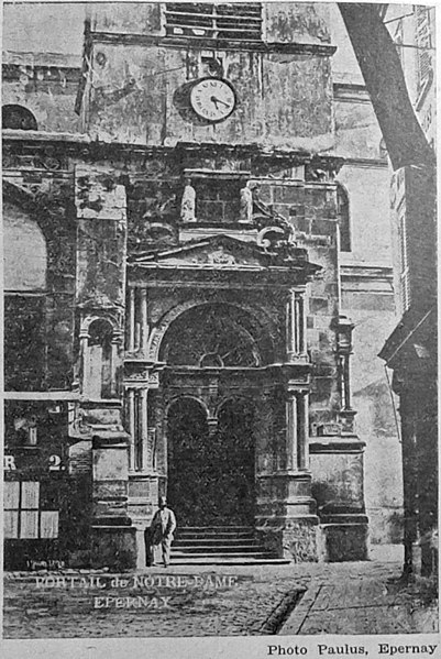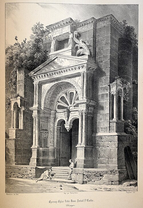 Le portail Saint-Martin, situé place Hugues-Plomb à Épernay, est un monument historique classé dès la liste de 1840. Daté de 1540, ce portail latéral de l'église porte une niche au fronton qui abritait une statue équestre de saint Martin ; il a probablement été sculpté par Pierre Jacques. La Révolution entraîna la fermeture de l'abbaye : l'assemblée du 13 février 1790 abolit les vœux monastiques et supprima les congrégations, les moines quittèrent leur couvent vers la fin de l'année. En 1792, l'église abbatiale Notre-Dame fut transformée en entrepôt de fourrages puis fermée au culte l'année suivante. Après l'écroulement des voûtes du chœur en 1824, la reconstruction d'une nouvelle église paroissiale en 1829 causa d'importantes dégradations sur le portail, entraînant notamment la disparition de la statue. Le portail fut alors déplacé et incorporé au clocher hors œuvre, face à la rue Saint-Martin. En 1909, l'église Notre-Dame fut définitivement démolie et remplacée par une nouvelle église édifiée sur l'emplacement de l'ancien couvent des Ursulines ; le portail fut à nouveau déplacé et installé dans le square aménagé sur les ruines, aligné sur la place Hugues-Plomb. Les bâtiments conventuels abritèrent la mairie de 1796 à 1913 avant d'être démolis en 1914. Plusieurs vitraux anciens de l'église furent conservés lors des destructions et replacés dans la nouvelle église Notre-Dame, place Thiers. Au XIXe siècle, le portail se présentait accolé à l'église, comme en attestent les états de l'époque.