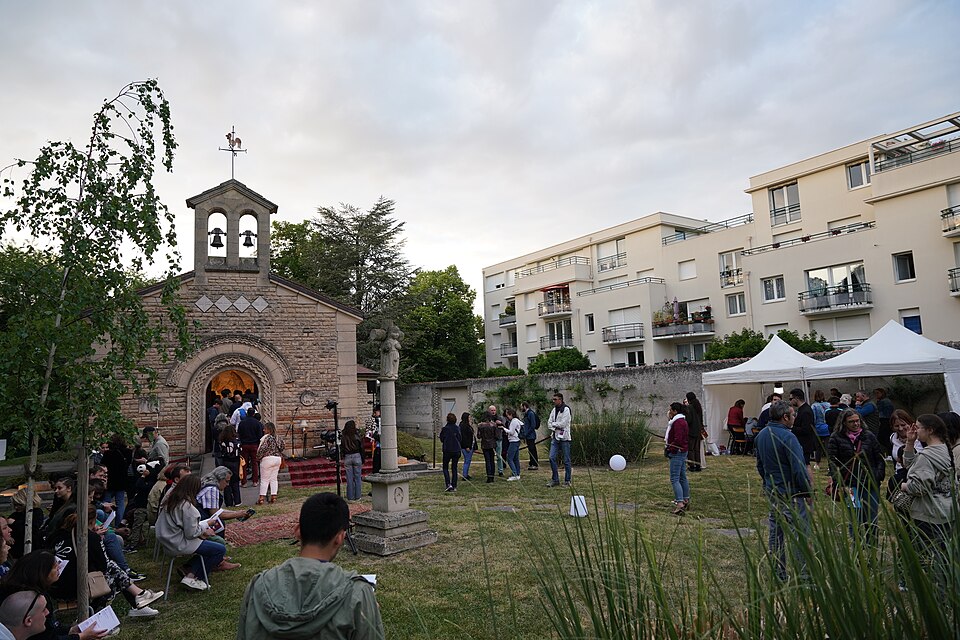 Entourée de végétation et d’allure modeste, l’architecture extérieure évoque les églises de campagne ; un calvaire présentant un Christ enfant se dresse devant l’entrée. La porte cloutée est flanquée d’un agneau pascal et de poissons entrelacés, et deux croix, grecque et romaine, symbolisent l’union de l’Orient et de l’Occident. Le clocher, surmonté d’une girouette en forme de coq, abrite deux cloches en bronze nommées Marthe et François.