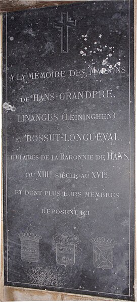 L'église de Hans, dédiée à Notre‑Dame‑du‑Soldat, se situe dans la commune de Hans, dans le département de la Marne. Elle date de la fin du XIIe siècle et est mentionnée comme nouvellement construite dans une charte de 1206. Deux piliers de la croisée remontent au tournant des années 1180. Une tour carrée, implantée au‑dessus de la première travée, fait office de clocher. L'abside a été amputée en 1809. La restauration conduite pendant le Second Empire par la volonté de Henri de Dampierre a couvert la nef sans rétablir les voûtes. Les vitraux, réalisés par Duhamel Marette, traitent de thèmes patriotiques tels que la guerre de Crimée, les Pères‑blancs en Kabylie, Alpin et Attila, ainsi que le baptême de Clovis. Des maréchaux ont apporté des dons en marbre pour l'église, dont les fonts baptismaux. De nombreuses familles ont fait apposer des plaques mémorielles en souvenir des morts des guerres du Second Empire, parmi lesquelles figurent Blandan, Courbet, le comte d'Enghien et Dupetit‑Thouars. L'église a été consacrée par Mgr Sourrieu et bénie par Léon XIII. Elle est classée au titre des monuments historiques par arrêté du 16 avril 1943.
