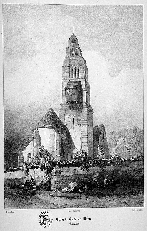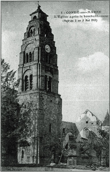 L'église Saint-Rémi de Condé-sur-Marne, dédiée à Rémi de Reims, se situe à Condé-sur-Marne, dans le département de la Marne. Construite au XIIe siècle sur l'emplacement de la chapelle Saint-Sauveur, elle relève de l'architecture romane. Classée monument historique depuis le 6 mars 1918, elle a été touchée l'année précédente par un bombardement. Sa particularité est son clocher, daté de la construction, constitué d'un empilement d'étages de plus en plus étroits ; seul le sommet n'est pas d'époque. À l'extérieur, la façade occidentale présente un porche en appentis et un portail flanqués d'une tourelle coiffée d'un toit en poivrière. La façade nord comporte un porche à auvent de style Renaissance, époque Henri II, orné des croissants entrelacés de Diane de Poitiers. Sur le mur gauche se remarque une pierre noire provenant de l'ancienne église Saint-Sauveur du village voisin de Brabant, portant l'inscription « A la gloire de J.E.N.S. Mgr. l'évêque de Cydon, chapelain de l'église Saint Sulpice de Brabant ». Sur le mur droit, une plaque honore l'abbé Munier, curé de Condé de 1847 à 1866 ; son corps repose face à l'entrée de ce porche, seul curé enterré sur le site. L'intérieur est aujourd'hui dépouillé, alors que l'histoire révèle une église autrefois riche de trois autels — dédiés à la Sainte Vierge, à saint Rémy et à saint Nicolas — ainsi que d'un orgue et d'une chaire à prêcher. La Révolution a dépossédé l'édifice d'une partie de ses biens, puis les bombardements allemands dans la nuit du 2 au 3 mai 1917 ont détruit le toit et tout le mur nord, mettant un terme à l'essentiel du mobilier. Quelques vestiges anciens subsistent, notamment un bas-relief sur le mur gauche du chœur et des sculptures sur les colonnes. Le mobilier actuel a été fabriqué par des bénévoles, récupéré ou reçu en dons. Le chemin de croix et la statue du Sacré-Cœur ont été offerts par Mlle Almodie Brocart en 1940. Les fonts baptismaux par immersion, offerts dans les années 1980 par un habitant de Condé, n'ont pas encore été utilisés. La galerie présente un chapiteau sculpté, le baptistère, le porche champenois, des images de l'état de l'église en 1917 et l'allée menant au portail.
