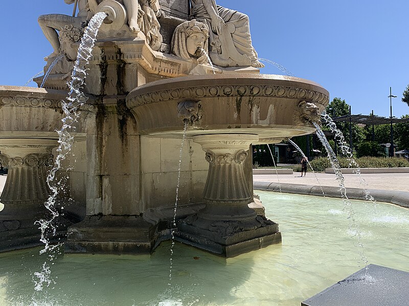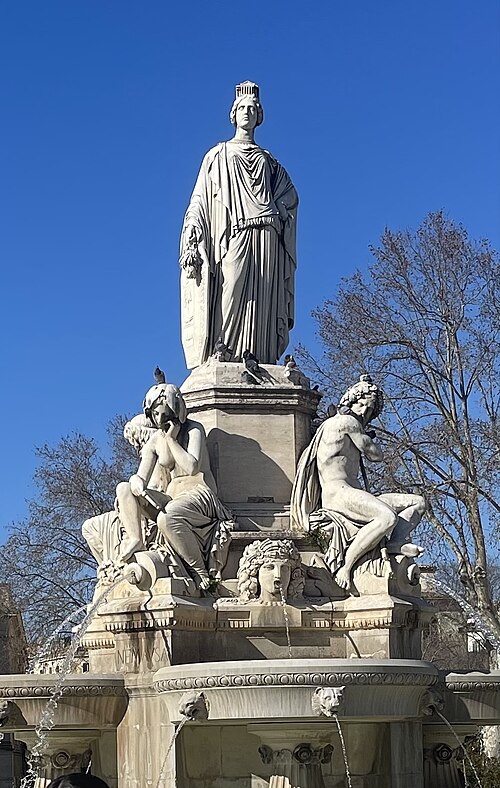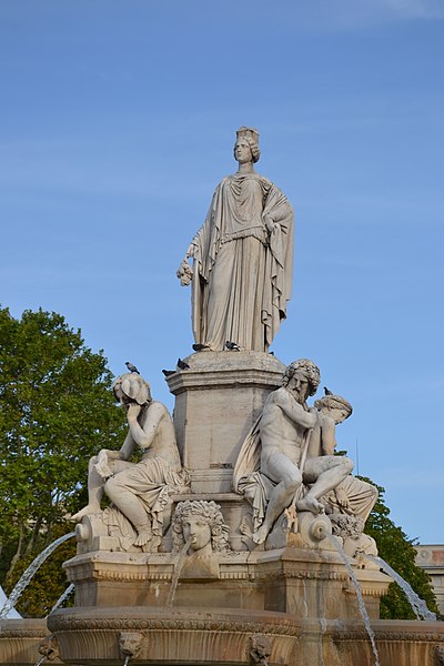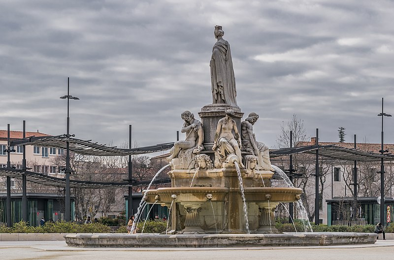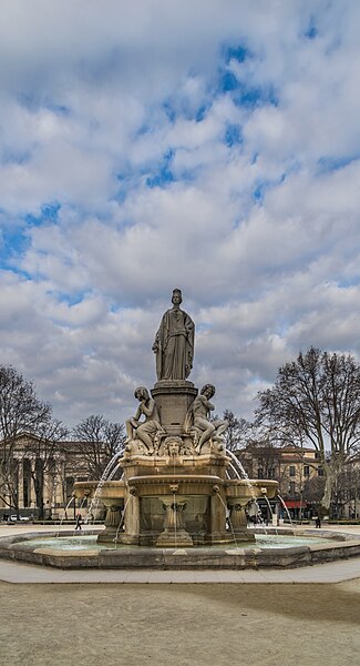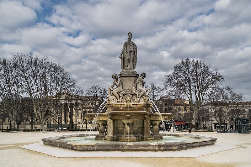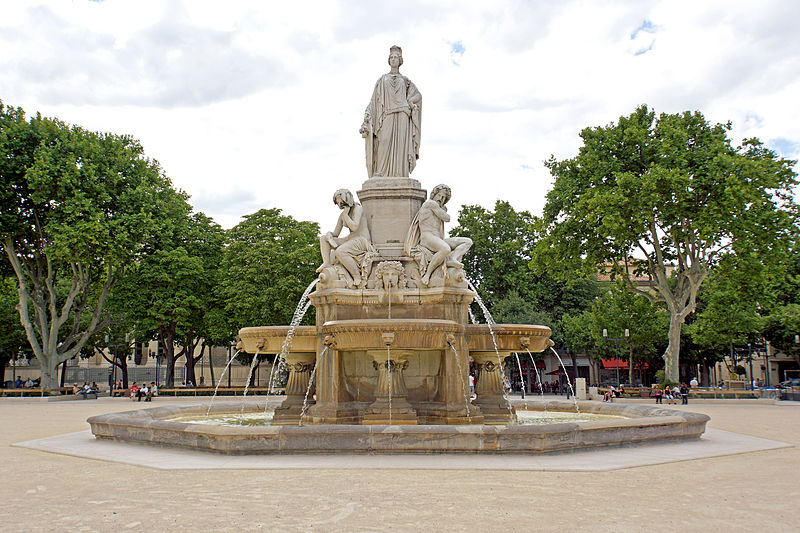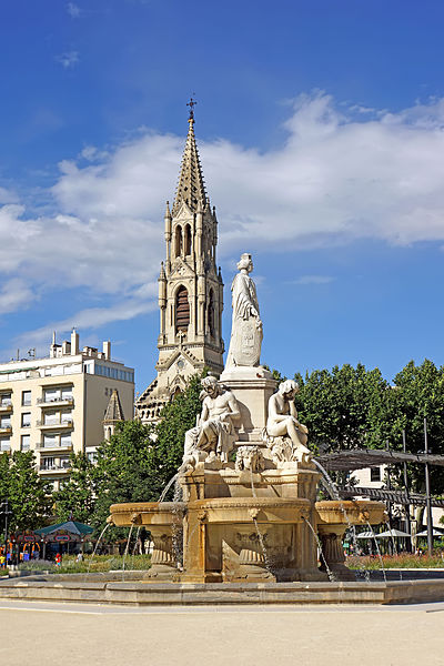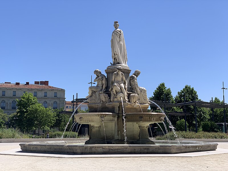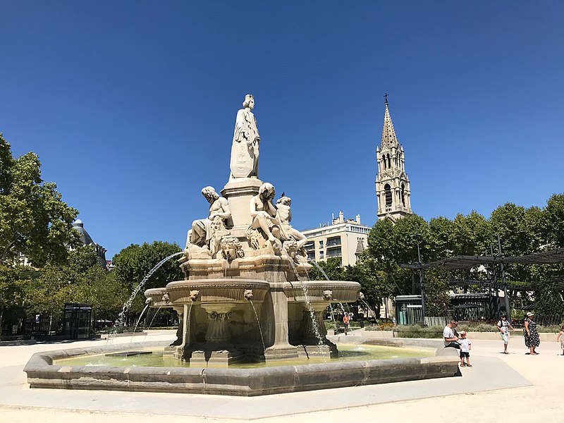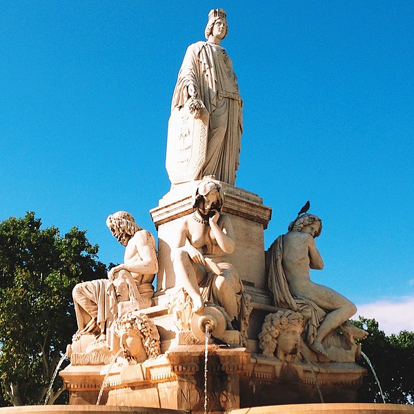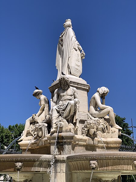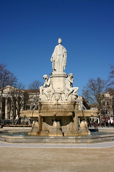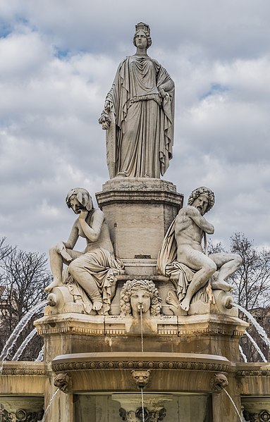 La fontaine de l'Esplanade, dite fontaine Pradier, est une œuvre monumentale en marbre érigée sur l'esplanade de Nîmes. Son édification répond à la volonté municipale, née de l'arrivée du chemin de fer en 1840, d'installer un monument artistique marquant la nouvelle entrée triomphale de la ville, à proximité du palais de justice néo-classique. Un concours lancé en 1844 pour une fontaine monumentale a été remporté par l'architecte Charles Questel, et la réalisation sculptée a été confiée à James Pradier, issu d'une famille protestante locale. La fontaine a été inaugurée le 1er juin 1851. Elle est inscrite au titre des monuments historiques par arrêté du 16 novembre 1988. L'ensemble est réalisé en marbre blanc et se compose d'une figure principale debout, une jeune femme allégorique qui personnifie la ville de Nîmes. Cette allégorie porte en couronne les monuments antiques de la cité, les arènes et la colonnade de la Maison Carrée. La statue centrale est entourée de quatre figures assises dont les vasques recueillent l'eau ; ces deux hommes et deux femmes symbolisent les principales sources et cours d'eau qui alimentent la région : la source de Nemausa (fontaine de Nîmes), le Gardon, la fontaine de l'Eure et le Rhône. Chacune de ces représentations porte son nom latin gravé à la base : Nemausa, Vardo, Ura et Rhodano.