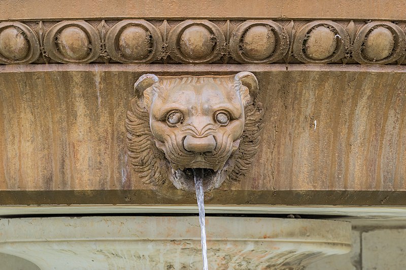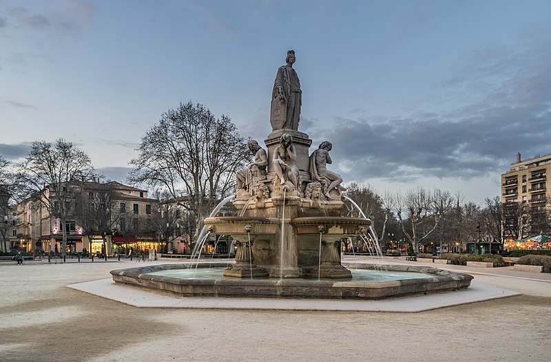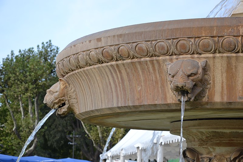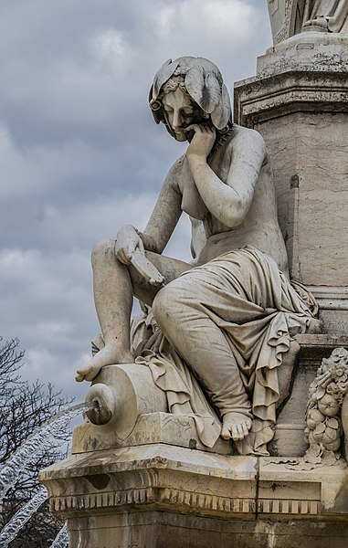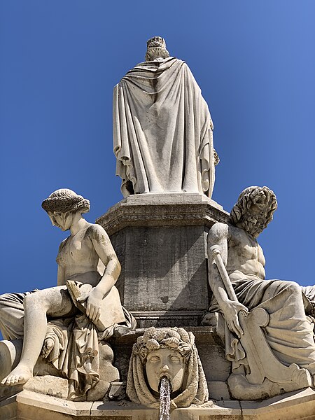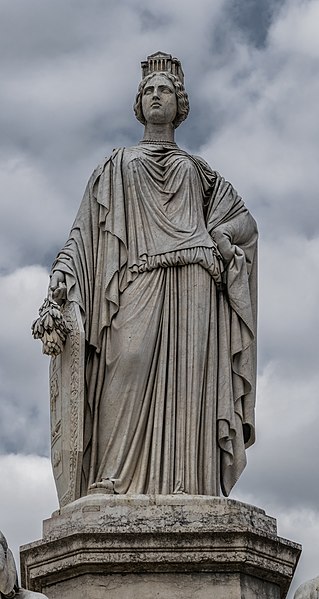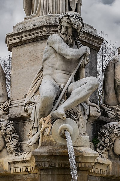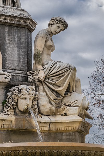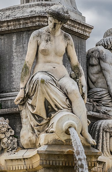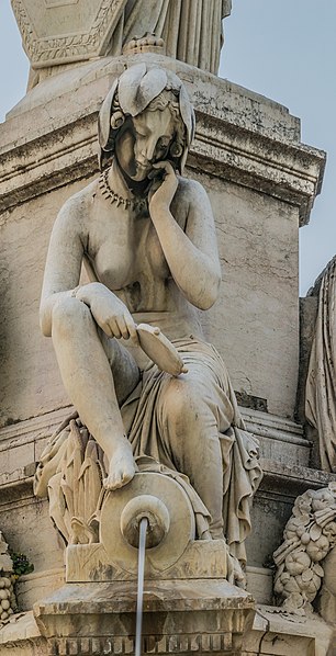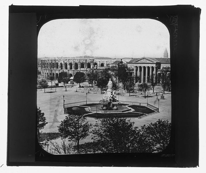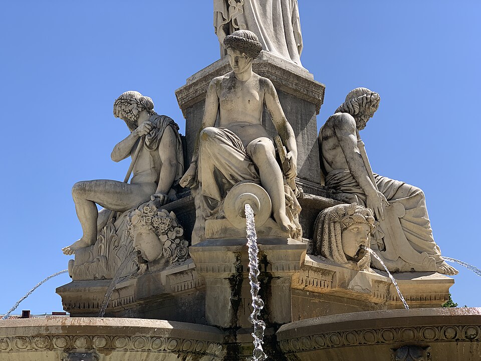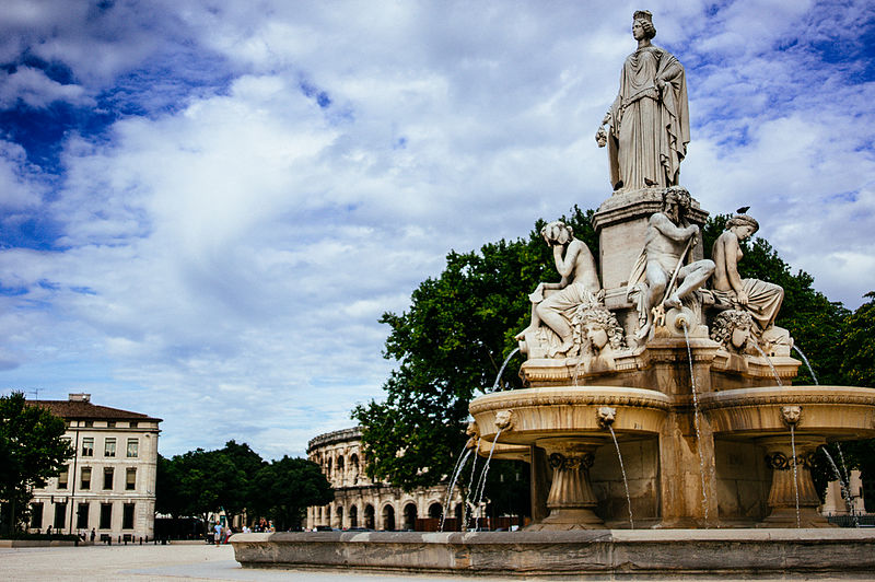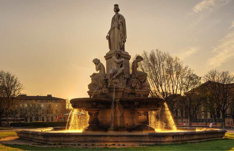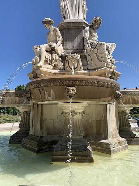 La fontaine de l'Esplanade, dite fontaine Pradier, est une œuvre monumentale en marbre érigée sur l'esplanade de Nîmes. Son édification répond à la volonté municipale, née de l'arrivée du chemin de fer en 1840, d'installer un monument artistique marquant la nouvelle entrée triomphale de la ville, à proximité du palais de justice néo-classique. Un concours lancé en 1844 pour une fontaine monumentale a été remporté par l'architecte Charles Questel, et la réalisation sculptée a été confiée à James Pradier, issu d'une famille protestante locale. La fontaine a été inaugurée le 1er juin 1851. Elle est inscrite au titre des monuments historiques par arrêté du 16 novembre 1988. L'ensemble est réalisé en marbre blanc et se compose d'une figure principale debout, une jeune femme allégorique qui personnifie la ville de Nîmes. Cette allégorie porte en couronne les monuments antiques de la cité, les arènes et la colonnade de la Maison Carrée. La statue centrale est entourée de quatre figures assises dont les vasques recueillent l'eau ; ces deux hommes et deux femmes symbolisent les principales sources et cours d'eau qui alimentent la région : la source de Nemausa (fontaine de Nîmes), le Gardon, la fontaine de l'Eure et le Rhône. Chacune de ces représentations porte son nom latin gravé à la base : Nemausa, Vardo, Ura et Rhodano.