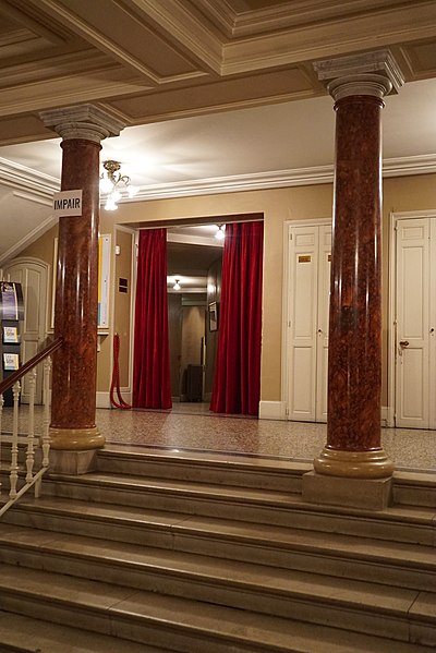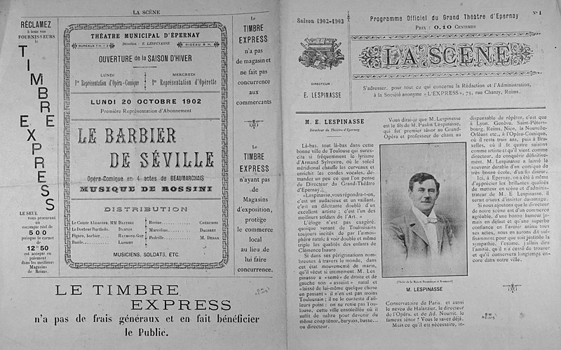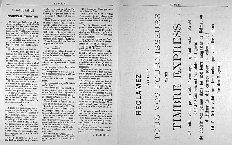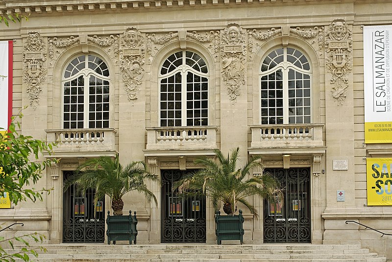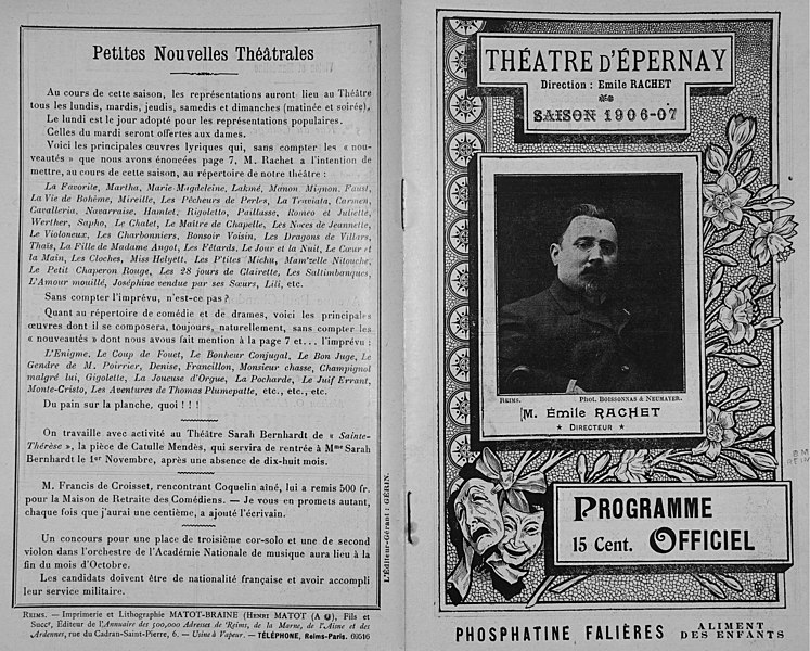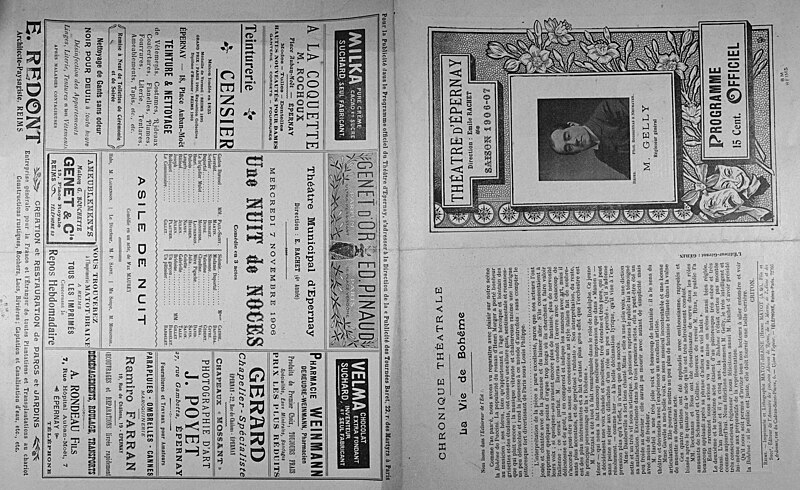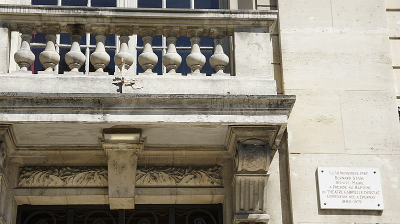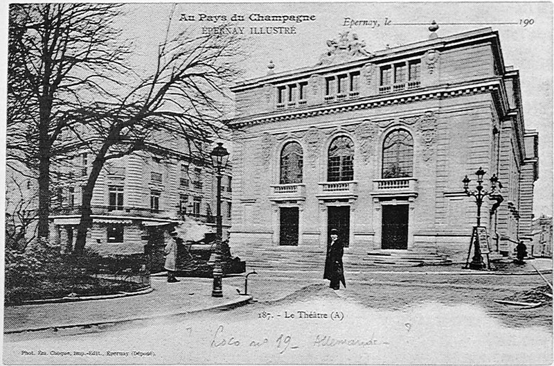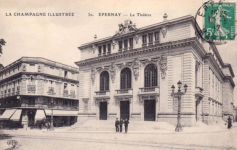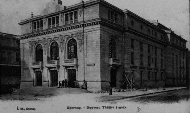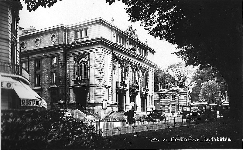 Construit au début du XXe siècle, le théâtre Gabrielle‑Dorziat d'Épernay, dans la Marne, adopte un style Louis XV et présente la configuration d'un théâtre à l'italienne. Sa décoration a été réalisée par plusieurs artistes, notamment le sculpteur Georges Trugard, le peintre Georges Clairin et le sculpteur sparnacien Joseph Ascoli, qui orne le fronton supérieur de la façade de son œuvre "La vigne champenoise inspirant l'Art théâtral". Le bâtiment rend hommage à l'actrice sparnacienne Gabrielle Dorziat et remplace un théâtre antérieur implanté au même endroit. Inscrit aux monuments historiques en 1988, il occupe une place centrale en ville, entre l'hôtel de ville, l'église Notre‑Dame et la gare. Les illustrations montrent divers aspects du lieu : l'illumination de Noël, le hall d'entrée, une mosaïque, l'escalier, le détail du fronton, le foyer et la salle, ainsi qu'une photographie du début du XXe siècle mentionnant le C.B.R.