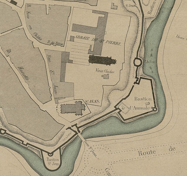 Le bastion d'Aumale, situé à Châlons-en-Champagne (Marne) sur le boulevard Émile Zola et adossé au quartier Tirlet, constitue l'une des dernières traces de la ceinture fortifiée qui entourait la ville. Un premier ouvrage aurait été édifié à la hâte en 1544, en même temps que le bastion de Guise, pour défendre la cité contre une attaque de Charles Quint. Le bastion actuel résulte de remaniements de la seconde moitié du XVIe siècle visant à répondre aux progrès de l'artillerie. Ces travaux, engagés de 1563 à 1573, furent initiés par Claude II de Lorraine, duc d'Aumale et lieutenant général du roi en Champagne et en Brie ; en 1568 Henri de Guise, à sa majorité, devint gouverneur de Champagne et acheva la construction. Cette modernisation s'inscrit dans le contexte des guerres de religion : la ville, majoritairement catholique et sous l'influence de la puissante famille de Guise, fit du bastion un signe de prestige. Son décor dépasse la seule fonction défensive et constitue une affirmation symbolique et politique de la puissance des Guise et du parti catholique. En 1876, le bastion passa aux mains du génie, qui y installa des casernes pour la cité Tirlet. Il est inscrit au titre des monuments historiques depuis 1929 et figure dans la base Mérimée sous la notice IA51000723.